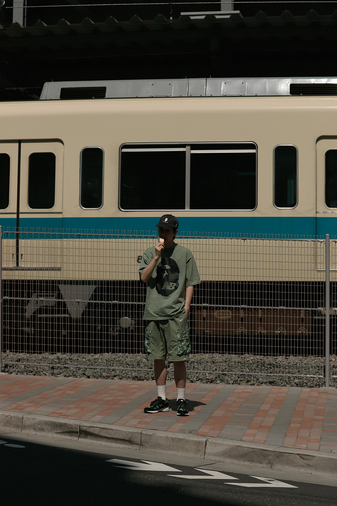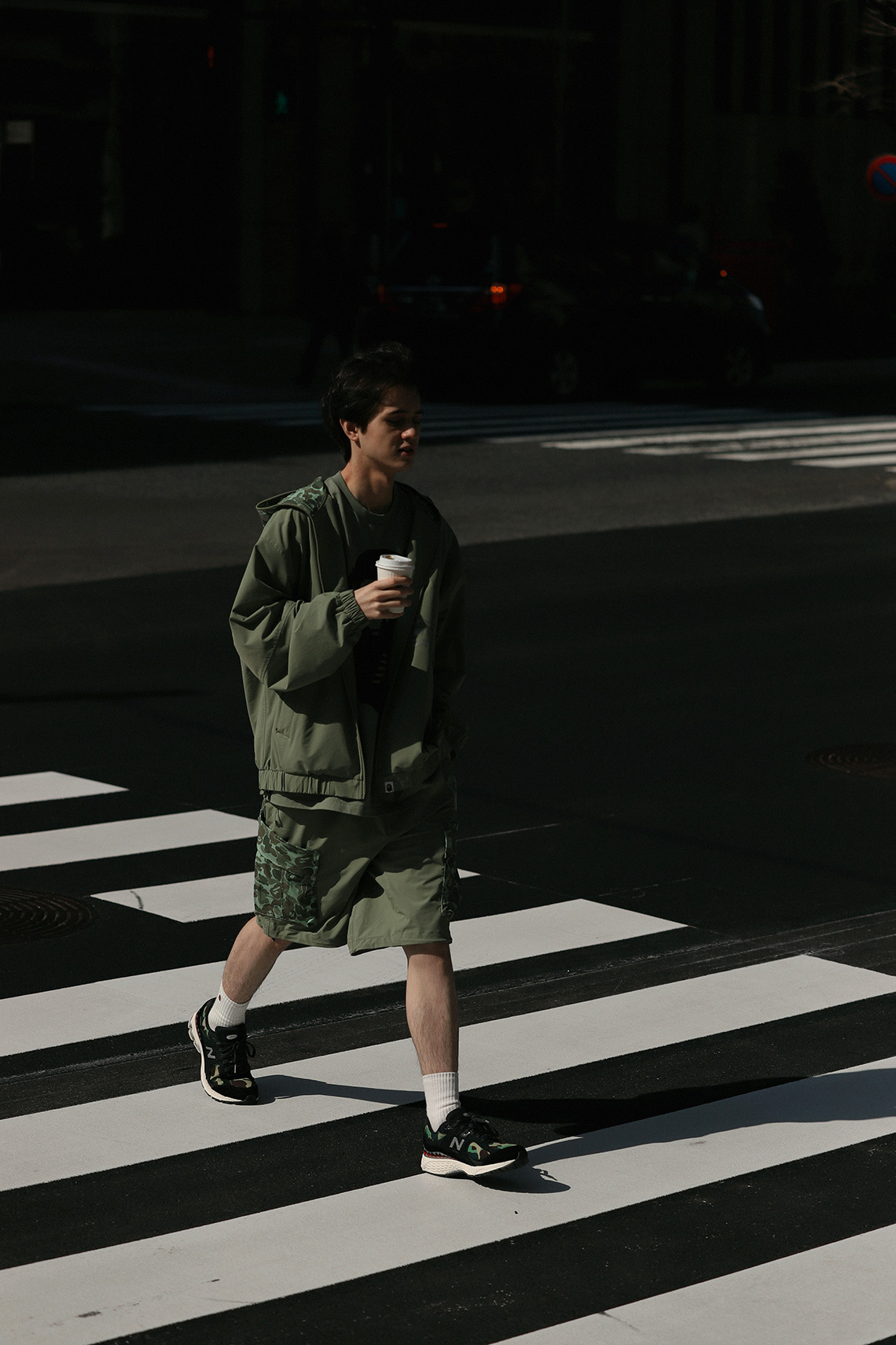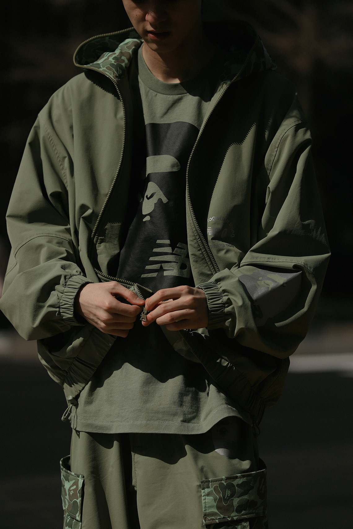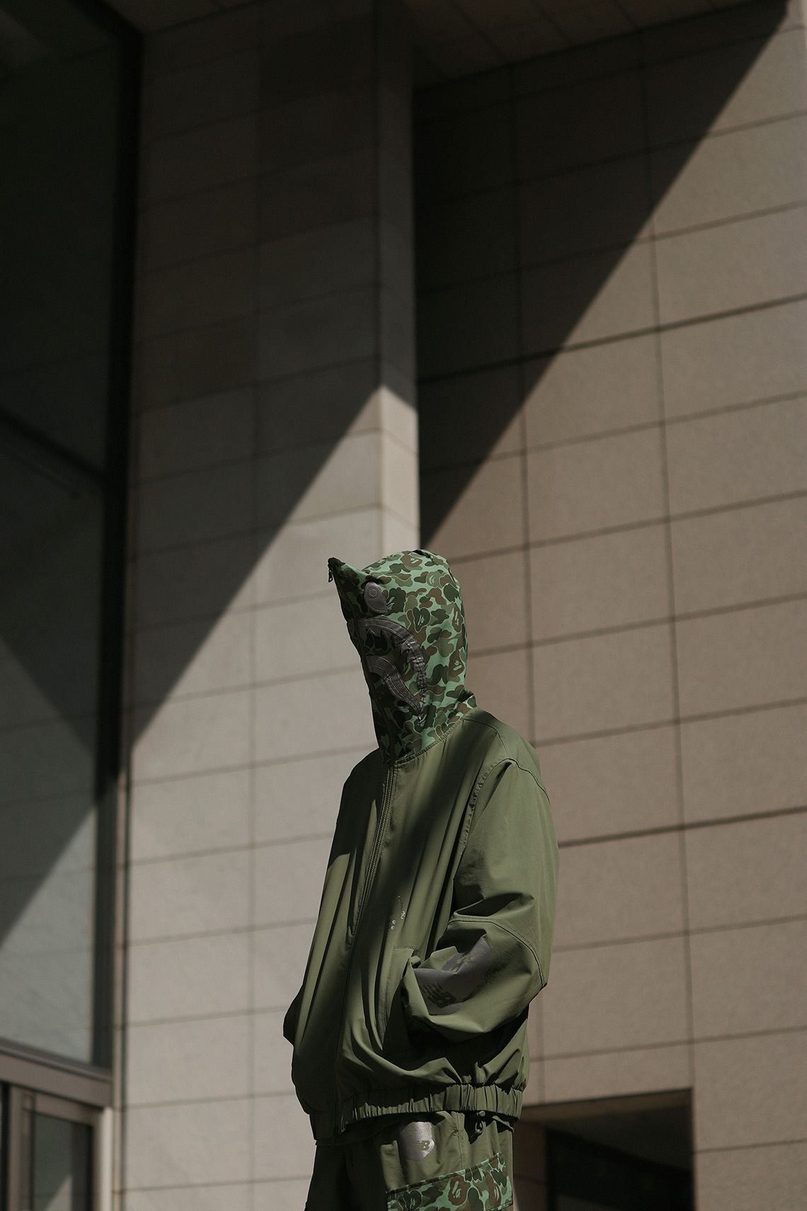 The collection consists of eleven pieces in total: two full-zip Shark-hooded windbreaker jackets, two pullover hoodies, three tees, two pairs of cargo shorts, and two colorways of the 2002R. The apparel comes in olive and grey color schemes, matching the two 2002Rs. BAPE’s 1st Camo print dresses the hoods of the Shark hoodies, as well as the large pockets on the cargo shorts. An APE HEAD logo with NB branding is prominently featured throughout the apparel, printed in metallic silver on the jackets, hoodies, and shorts.