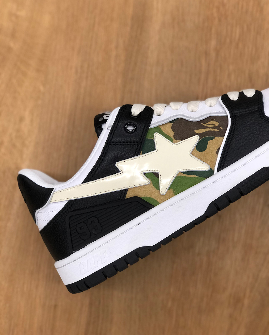 Taking “inspiration” from Nike’s Dunk Low silhouette, the SK8 STA is previewed in three colorways. One is dressed primarily in green ABC CAMO with black tongues and midsoles, plus a gum rubber outsole. A second pair comes in a black and white color blocking with camo quarter panels, while a third dons black and red make-up. The lone BAPE STA 93 HI, a silhouette similar to the Nike Dunk High, comes in a black, red, and dark grey color scheme contrasted by a white STA logo.