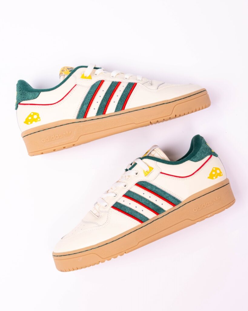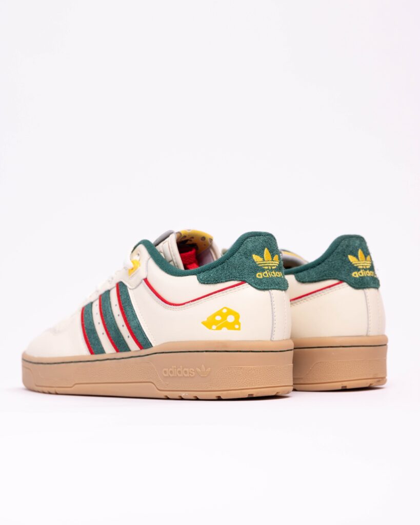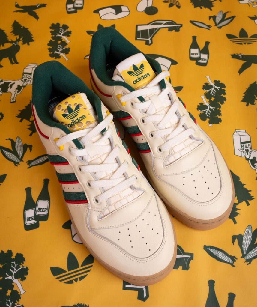 The tongue tags feature the adidas Trefoil logo dipped in two of Wisconsin’s famous culinary staples: cheese on the right shoe and beer on the left shoe. A cheese wedge is also applied to the lateral heel.