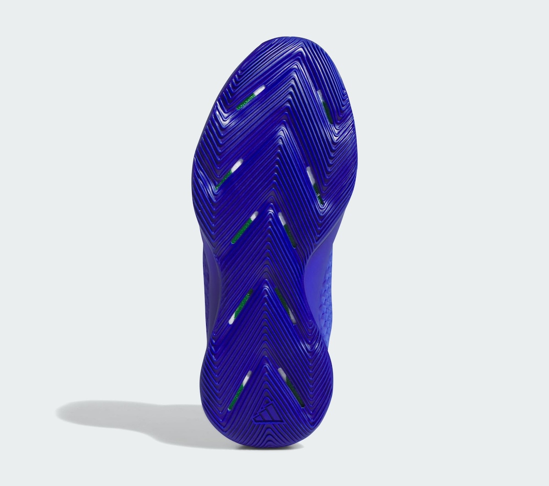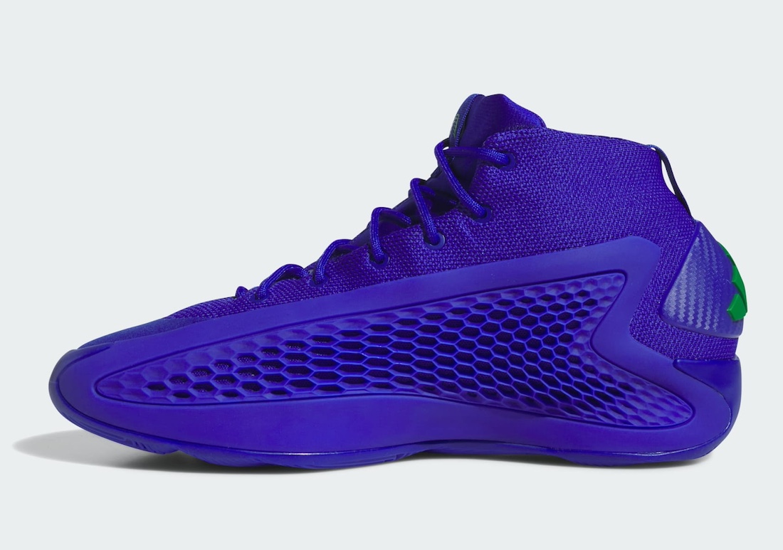 The “Velocity Blue” AE 1 comes dressed in a Timberwolves-inspired color palette, with the entirety of the shoe dressed in a “Velocity Blue” hue, save for a hit of green on the tongue logo and on the Three Stripes on the heels. Blue is Anthony Edwards favorite color, and this “Velocity Blue” hue is the brightest and most intense blue adidas has as a brand. These come pre-laced with blue laces for a tonal look, though you can switch them out with the extra set of green laces to compliment the accents.