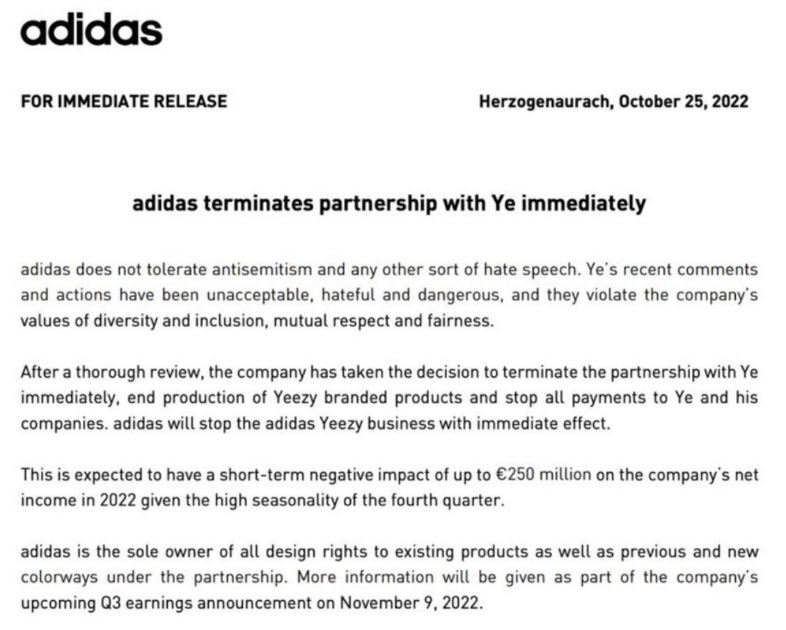 With this termination, adidas will “end production of Yeezy branded products and stop all payments to Ye and his companies.” As the YEEZY line is a big source of revenue for adidas, the company also notes an expected “short-term negative impact of up to €250 million on the company’s net income in 2022 given the high seasonality of the fourth quarter.”