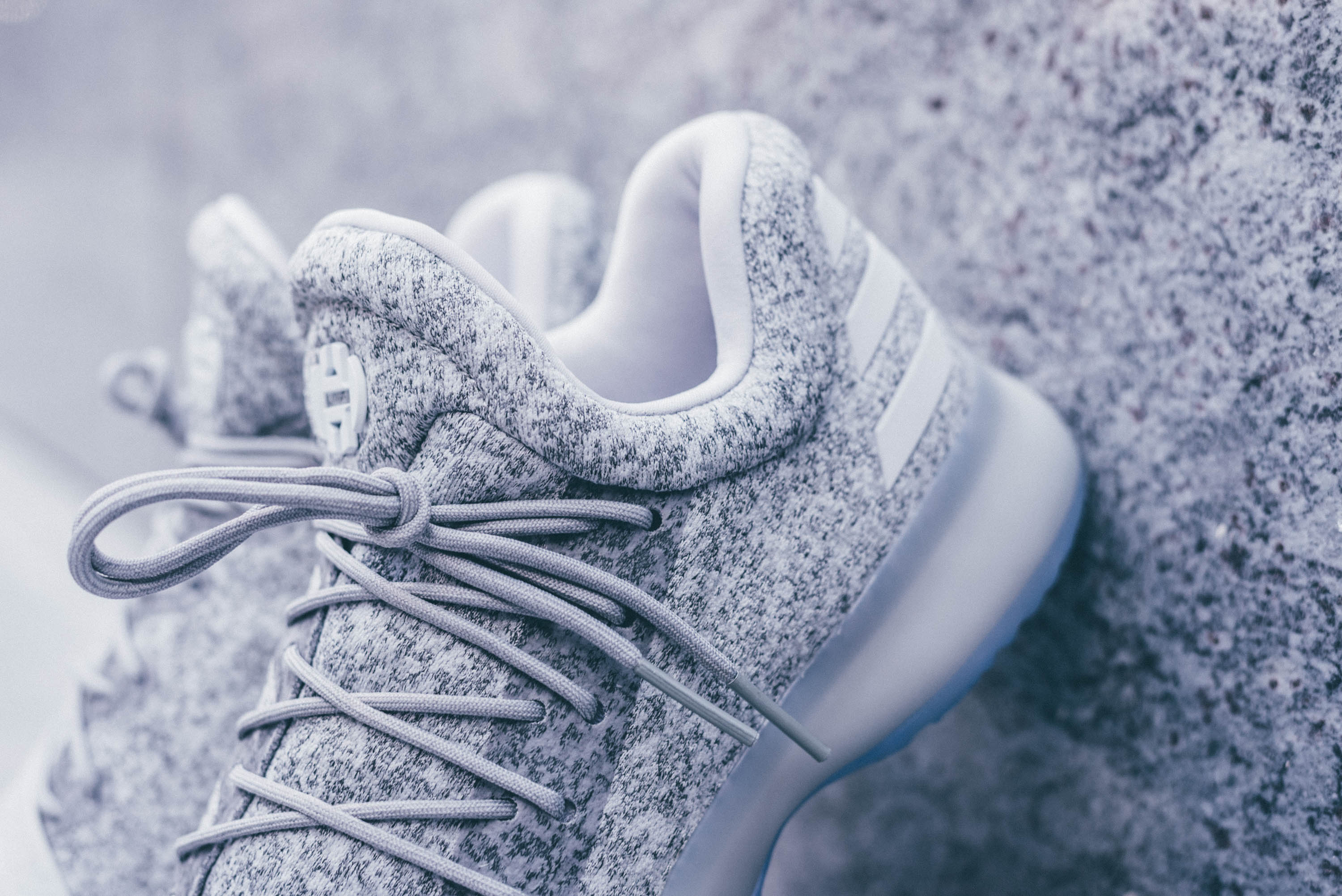 Created with a smooth gray aesthetic, Grayvy fuses a glitch knit upper with a leather toe shroud and light gray accents across the three stripes and Harden Mark. Matte detailing wraps full-length BOOST on the lateral edge, while an iced blue outsole keeps it cool on and off the court.