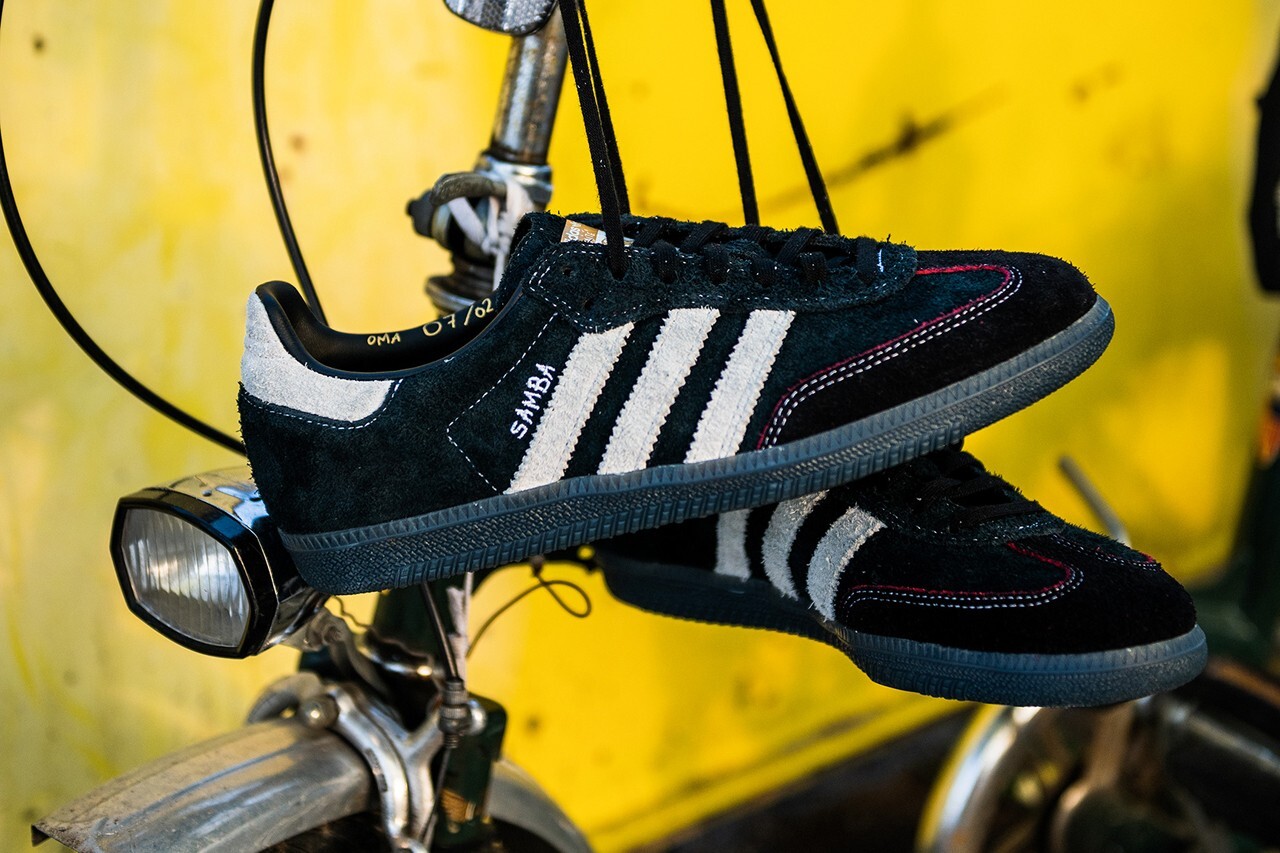 In contrasting fashion, Steenhoudt dresses the Samba in mostly black with white stripes for her first collaboration with adidas. The upper consists of hairy suede and features her mother and her grandmother’s birthdays on the collar of the shoe in gold foil. Red detailing dances around the toe box hinting at the red suede hidden underneath that will appear with extensive wear.