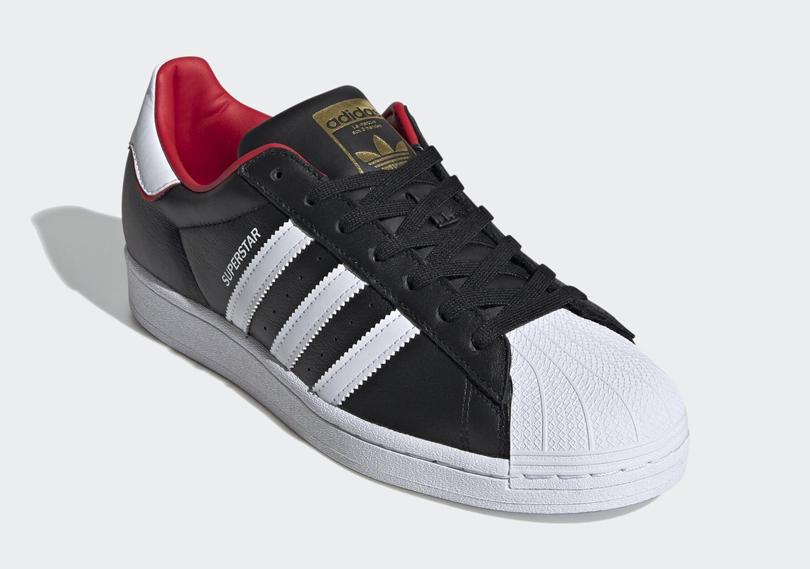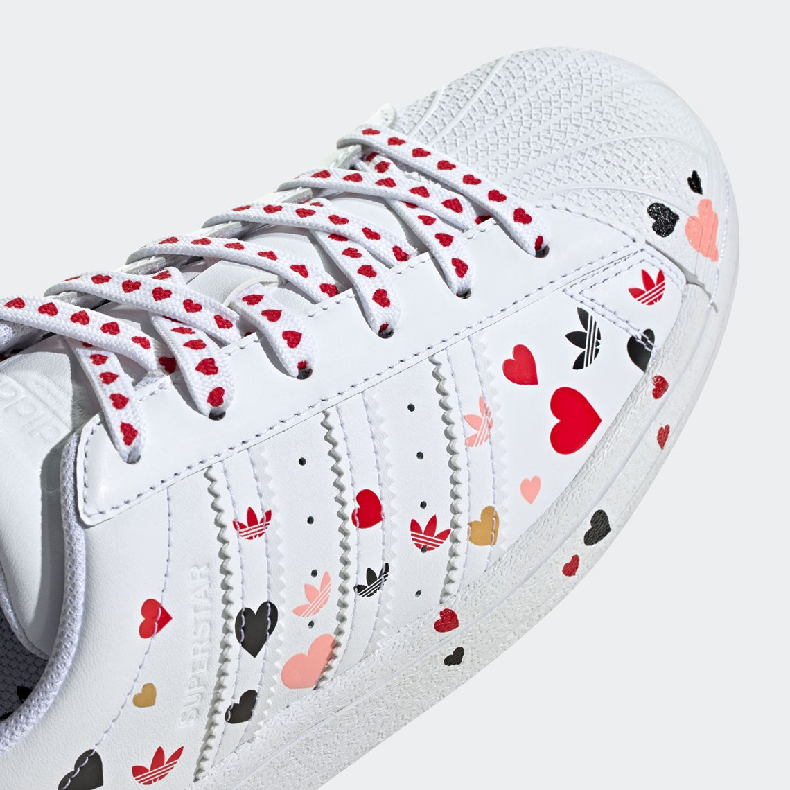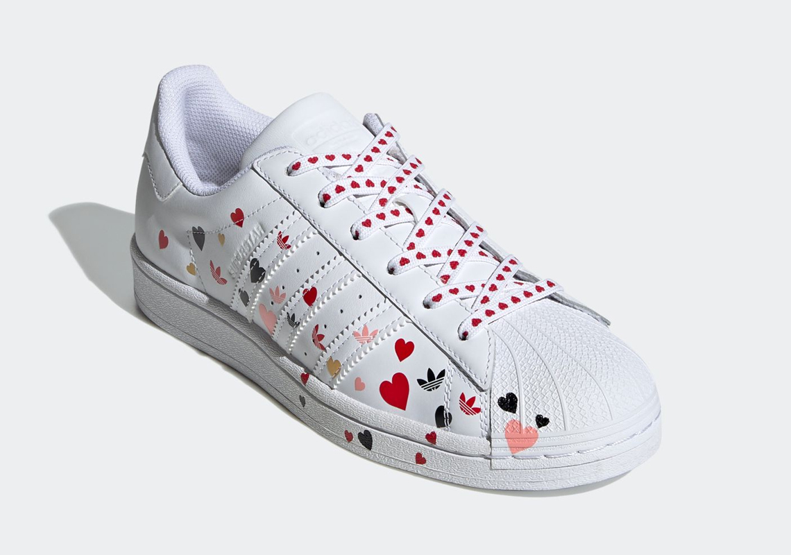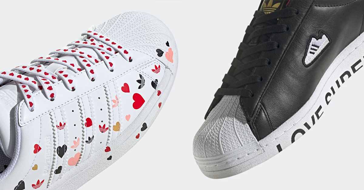 Two of the Superstars show an act of self-love with “LOVE SUPERSTAR” stamped along the midsole along with an interesting black and white shoe embellishment on the medial side. The color-blocked pattern reflects itself in each bold pair with a red, black and white palette. A third Superstar goes all out with red, gold, pink, and black hearts adorning the upper, extending onto shell toe and midsole.