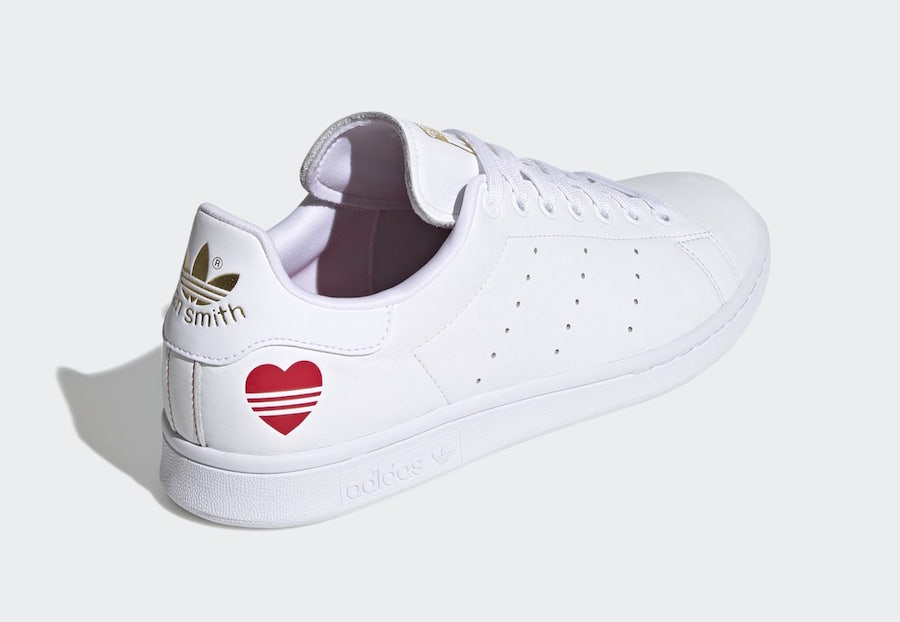 The Nizza features a “Crystal White” based upper with scarlet red accents on the tongue and heel. It comes complete with a heart-shaped patch on the midfoot. The two Stan Smith “Valentine’s Day” pairs also feature a white leather base and heart detailing, relying on scarlet accents and metallic gold to add flair to the classic shoe.
