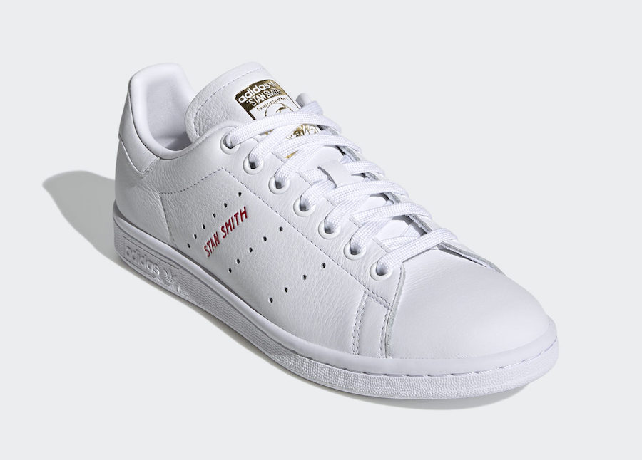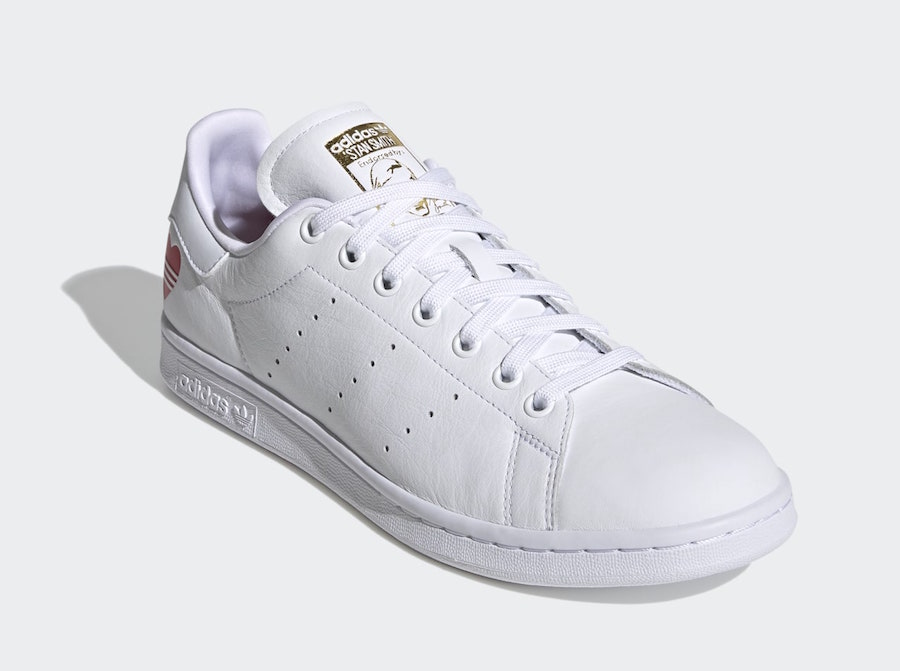 The Nizza features a “Crystal White” based upper with scarlet red accents on the tongue and heel. It comes complete with a heart-shaped patch on the midfoot. The two Stan Smith “Valentine’s Day” pairs also feature a white leather base and heart detailing, relying on scarlet accents and metallic gold to add flair to the classic shoe.