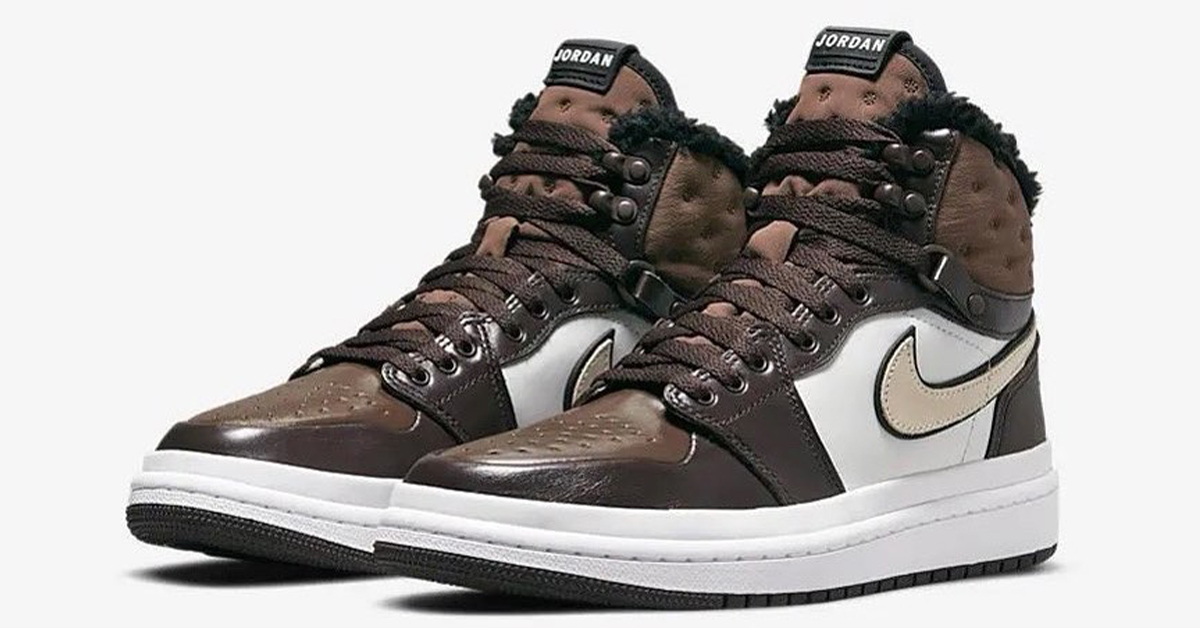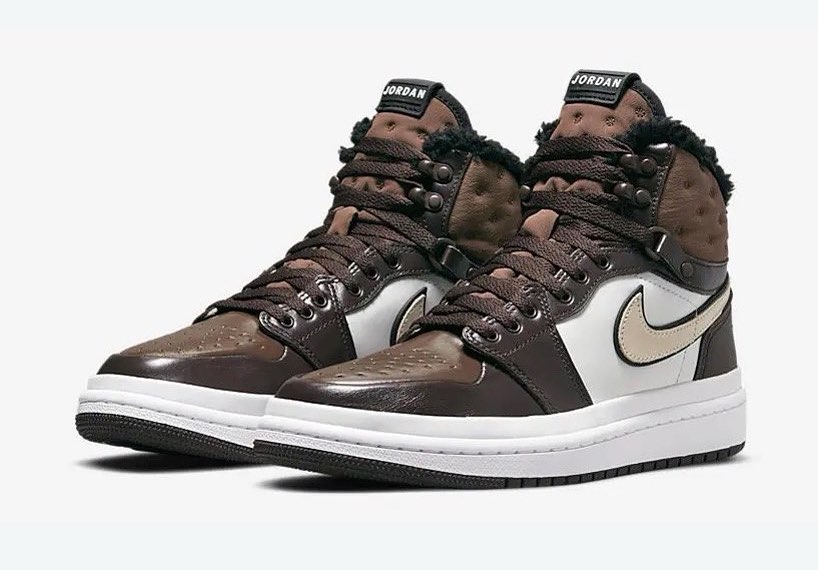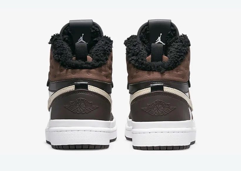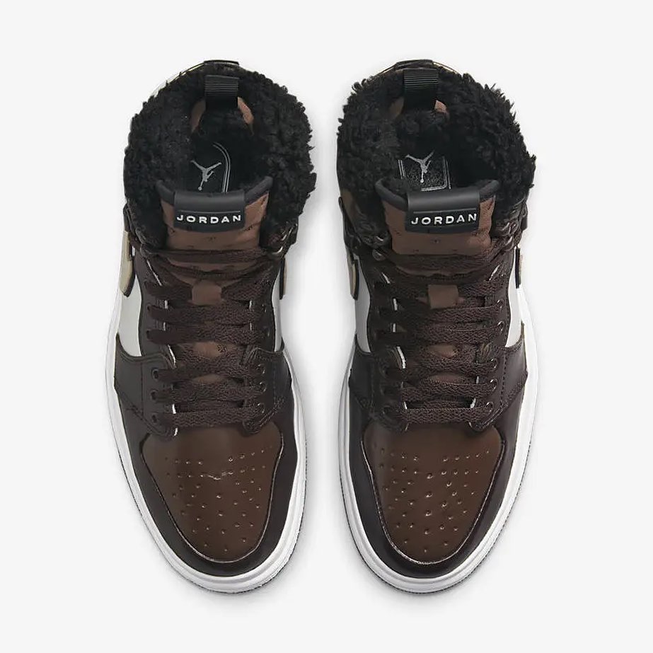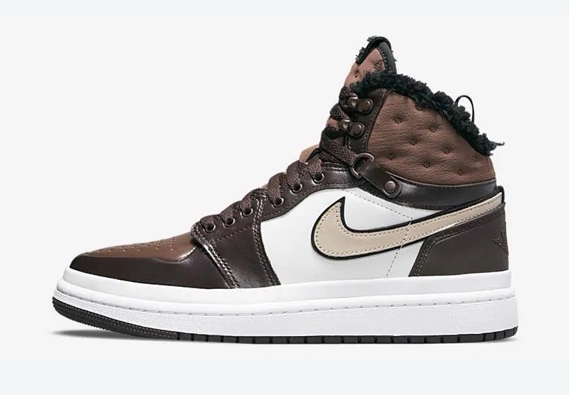 Similar to the “Triple Black” pair, this Air Jordan 1 Acclimate features a heavy-duty leather upper with a tongue and collar made of a thick textile insulated with a fleece lining. Boot-style D-ring eyelets have been added to the collar, as well as an extra layer of foxing above the midsole. The upper is dressed in chocolate brown everywhere except for the quarter panel that comes in white and the Swoosh that comes in a creamy brown.