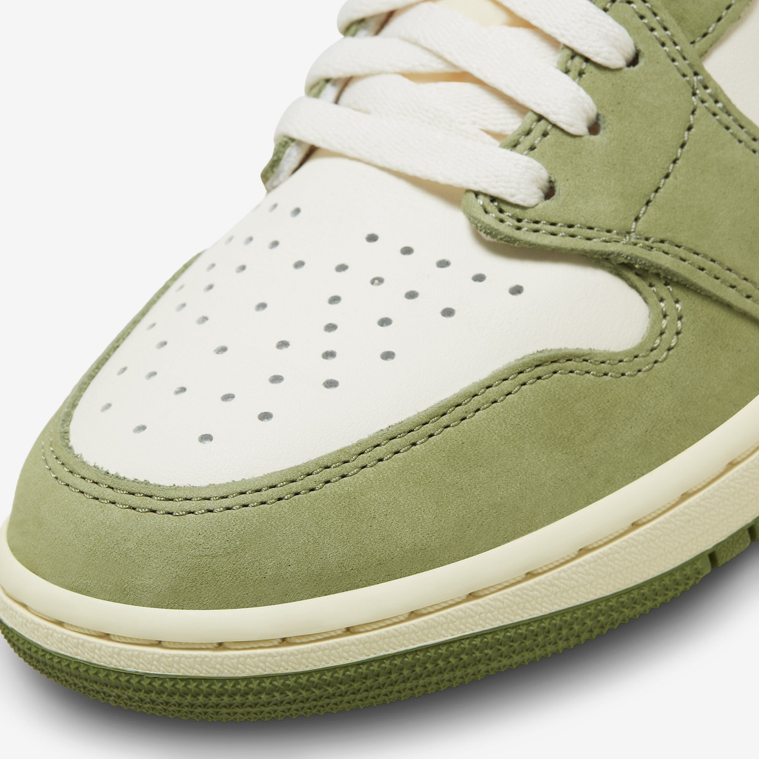 As part of Jordan Brand’s ongoing Craft series, the Air Jordan 1 High OG “Celadon” features construction not typically found on standard releases. While the base of the upper is Pale Ivory leather, the overlays around the toe and ankle area are done in olive premium suede. This is then paired with hits of orange nylon on the ankle collar and Swoosh, the latter featuring contrasting white stitching. Other neat details include exposed foam on the tongue and a vintage tint on the midsole. The combination of olive and orange is reminiscent of one of Jordan Brand’s most coveted sneakers of all time, the 2005 UNDEFEATED x Air Jordan 4, which was inspired by the colors found on MA-1 bomber jackets.