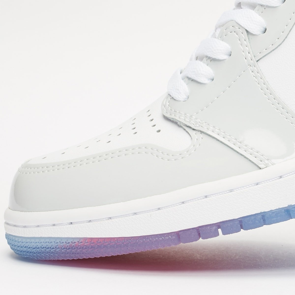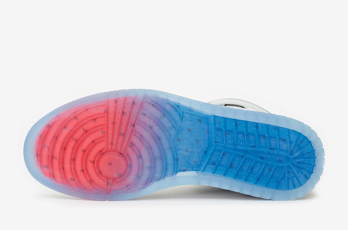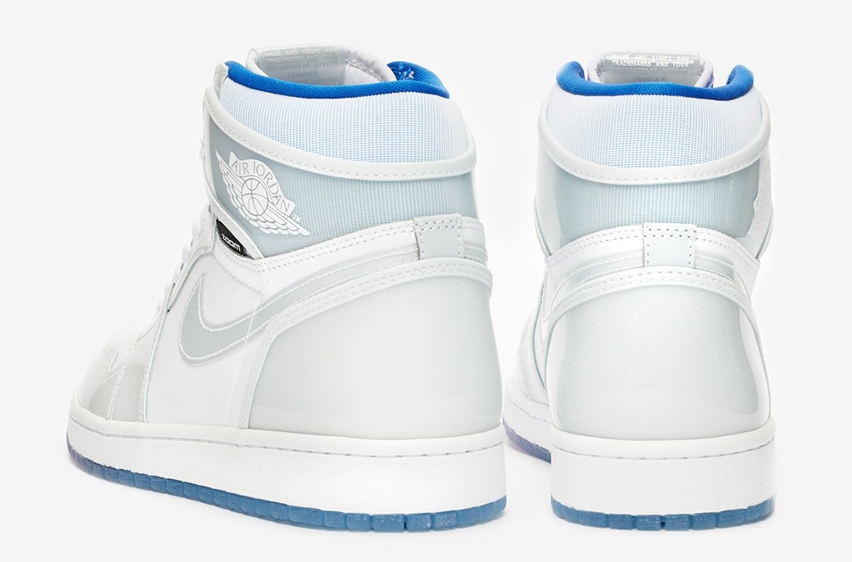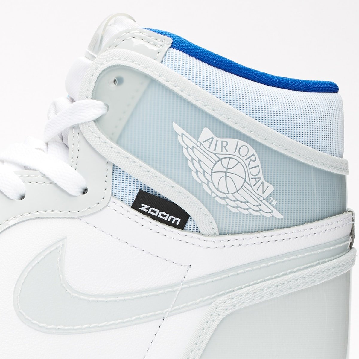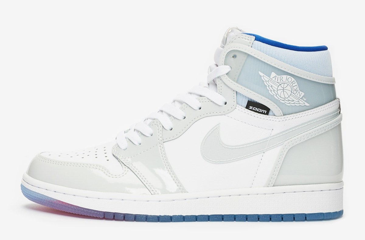 The Air Jordan 1 High Zoom R2T “Racer Blue” features a white leather upper with hits of light grey patent leather. On the collar we have mesh with a transparent TPU overlay outfitted with the Jordan Wings logo. The inside of the shoe is dressed in Racer Blue, some of which peaks out on the collar lining. This sneaker also continues the iridescent theme of the AJ1 High Zoom Fearless with its multicolored icy outsole.