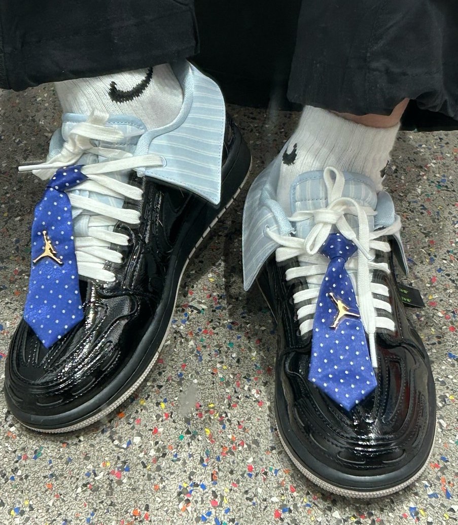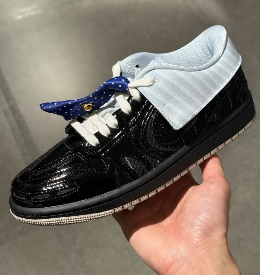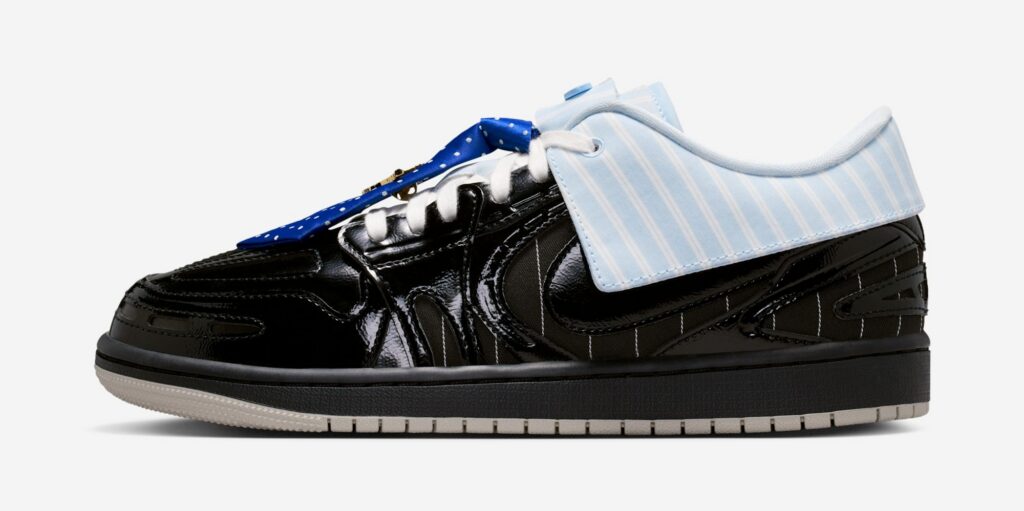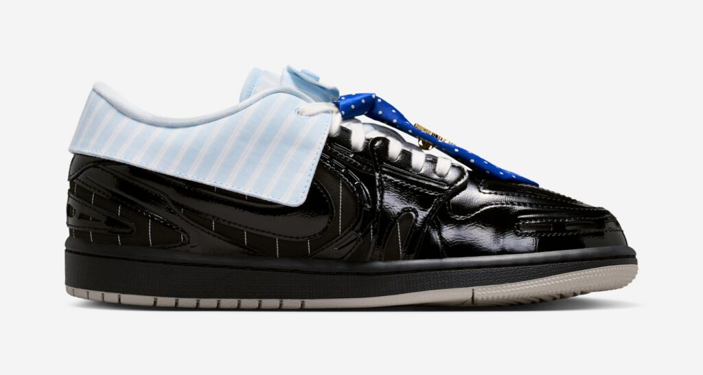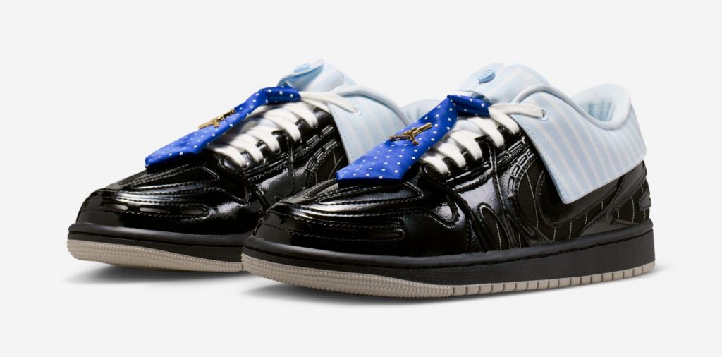 Part of the Method of Make series, the design pushes the AJ1 into tech-runner territory, elevated through layered construction and premium finishes. The “Suit and Tie” pair starts with a black pinstripe textile base, wrapped in glossy patent leather overlays for a sharp, tailored feel. Up top, a blue striped button-down collar replaces the traditional ankle cut, while playful formalwear details—including a blue polka dot tie-inspired lace charm and a Jumpman brooch—drive the theme home. A clean beige outsole grounds the look.