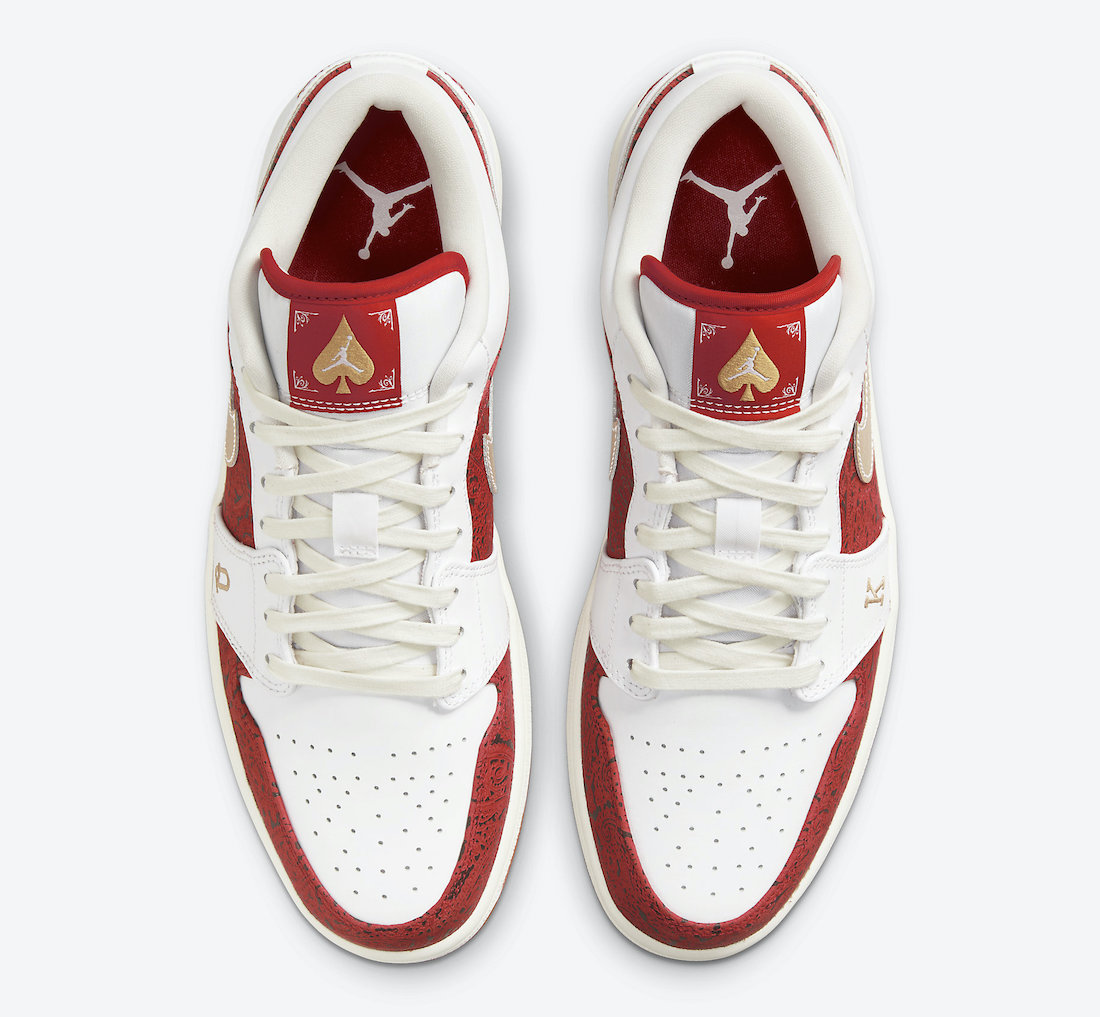 While the Air Force 1 comes dressed primarily in black, the Air Jordan 1 Low comes in a mix of white and red. The red sections on the mudguard and side panels come debossed with intricate paisley-style patterns, the same patterns usually found on the back of playing cards. “K” and “Q” embroidery is found on the laterals in gold, once again referencing King and Queen face cards. Additional gold details are found on the metallic Swoosh and the spades logo on the tongue.