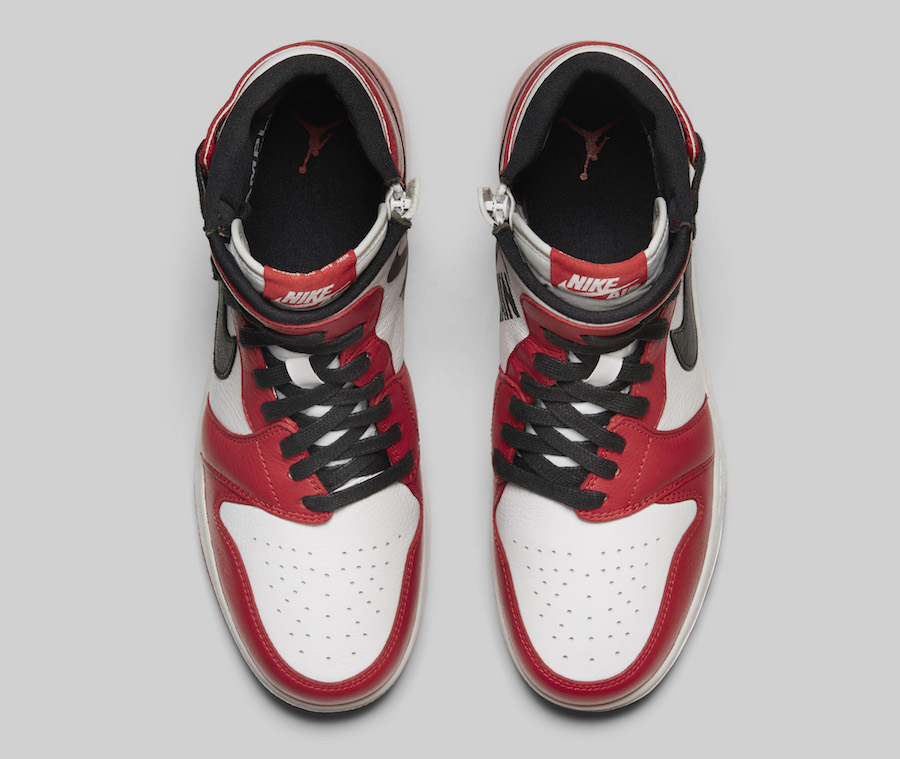 This reconstructed iteration of the Air Jordan 1 comes in a “Chicago” White/Varsity Red-Black color scheme with an oblique lacing system, zippers on the sides with the Wings logo appearing on the heels. A large Swoosh is seen on the sides and wraps around the back of the shoe that finishes off the design.