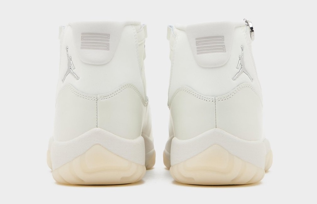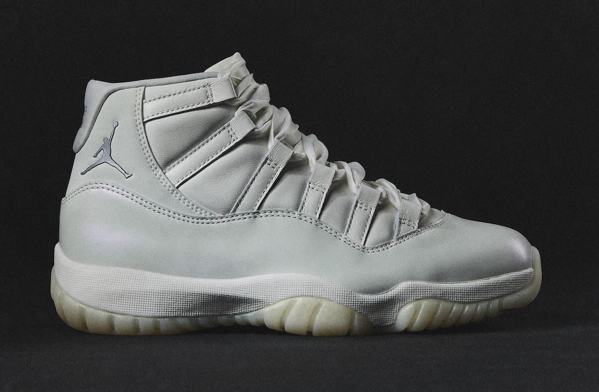 This Jordan 11 features a clean, monochromatic look, comprised of a Sail leather upper and Pearl Grey patent leather mudguard. Details include shiny metallic silver Jumpmans on the rear, grey suede heel tabs, white midsoles, and milky translucent outsoles.