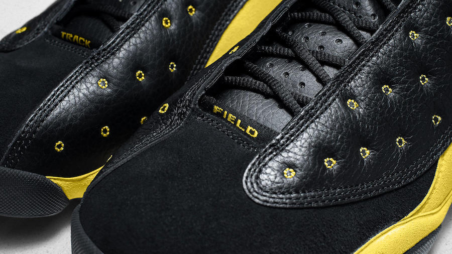 Jordan Brand created a special Air Jordan 13 colorway featuring the colors of the Oregon Ducks, specifically for the Track and Field team. The Air Jordan 13 features a black and yellow color scheme, with oregon branding on the tongue. Leather and nubuck make up the rest of the shoe, with track and feild on the lower tongue tags. Earlier today, Nike release an official story behind this pair that you can read below.
