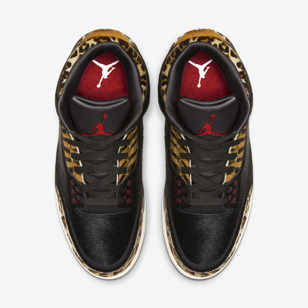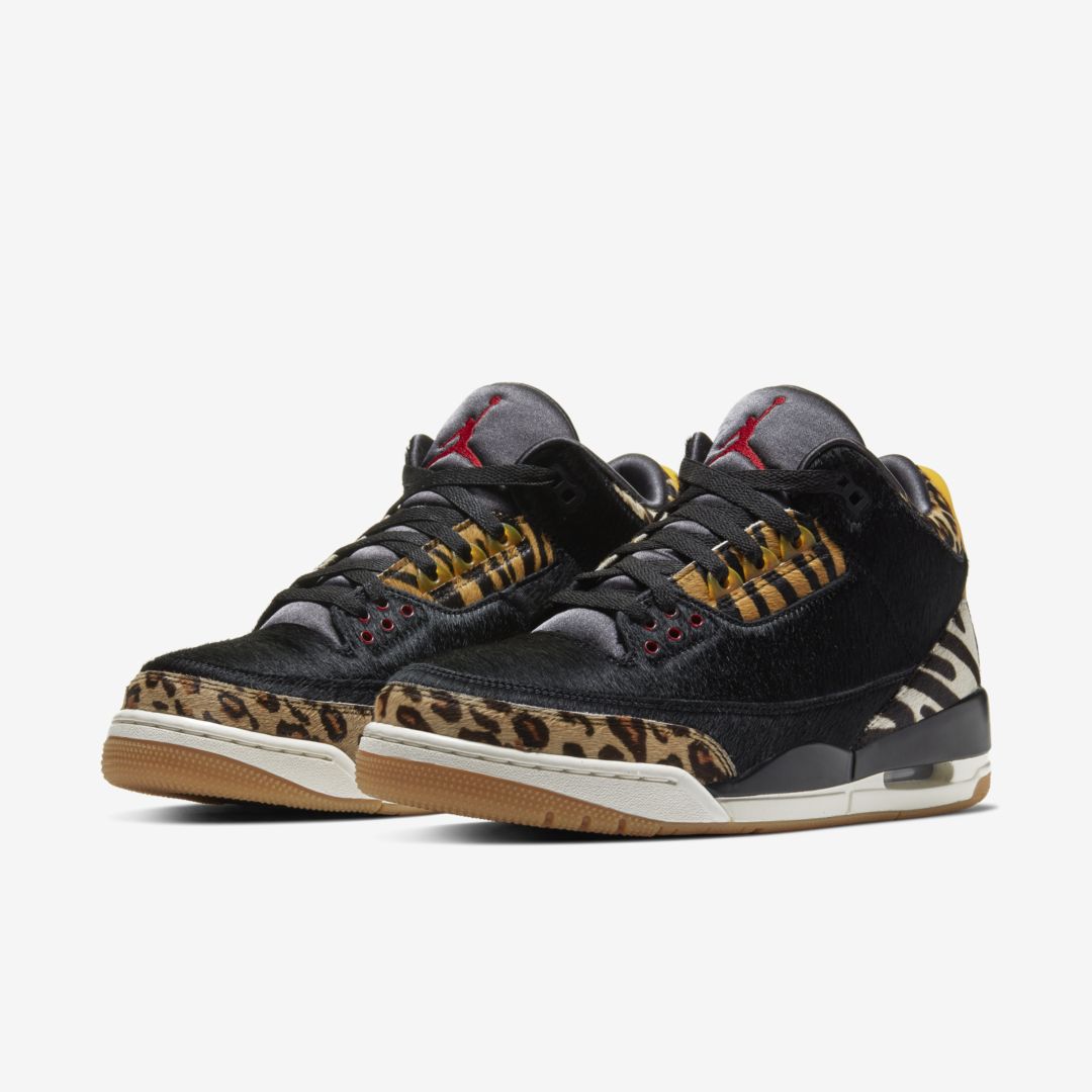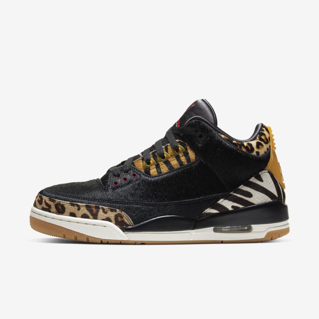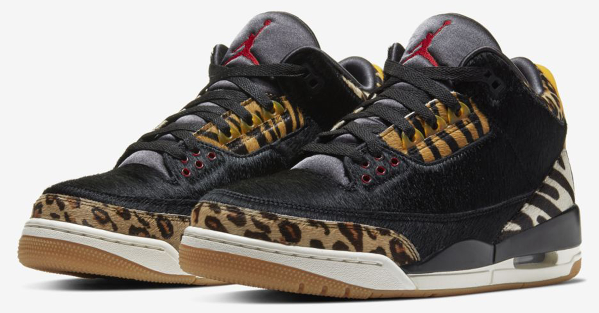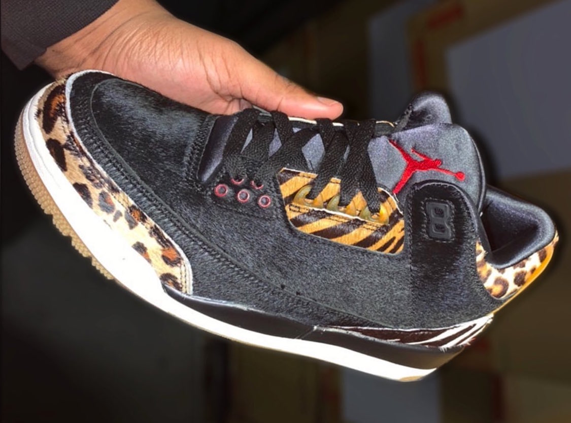 Images of one of the two colorways in the Air Jordan 3 “Animal Pack” have leaked. We can see that this Air Jordan 3 comes with a black pony hair upper and features a mix of leopard, tiger, and zebra print overlays throughout. A red Jumpman on the tongue, white midsole, and gum outsole complete the design.