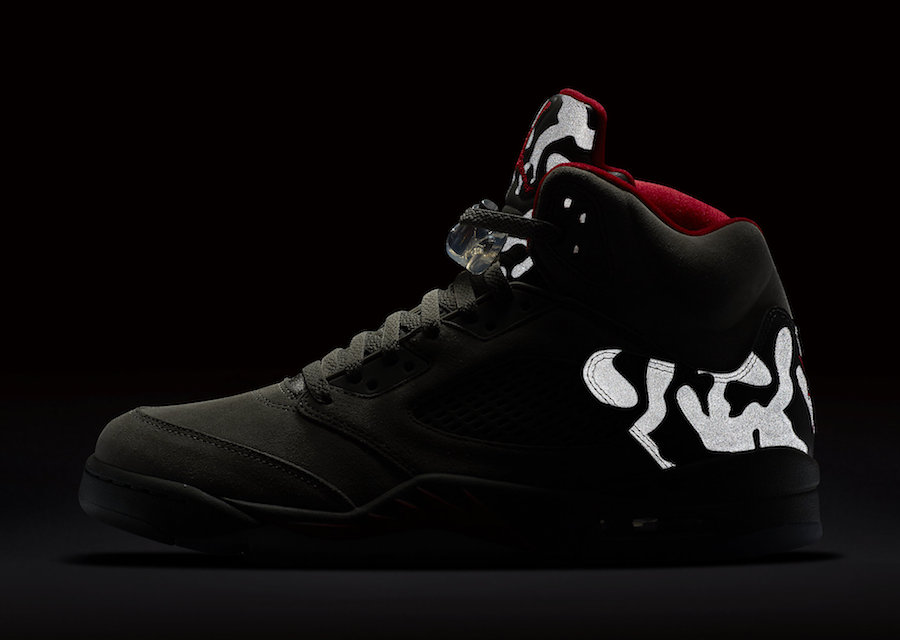 Jordan Brand schedules an Air Jordan 5 release featuring a solid olive colorway alongside camo. Inspired by the original concept that was used to create the Air Jordan 5, the warplane inspired colorway will feature camo patterns on the heel, alongside reflective touches throughout. The entire silhouette sits on a transluscent outsole giving this Air Jordan 5 your monies worth.