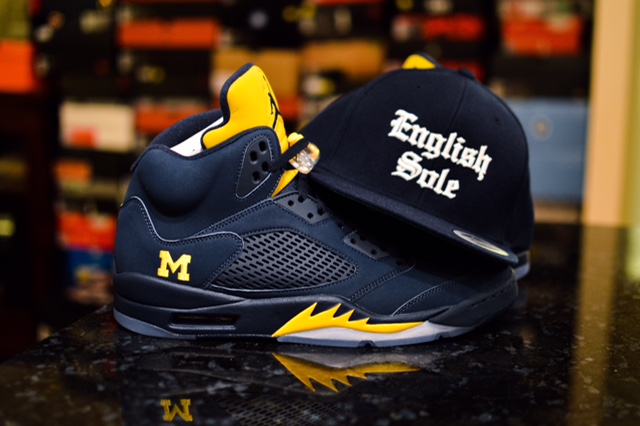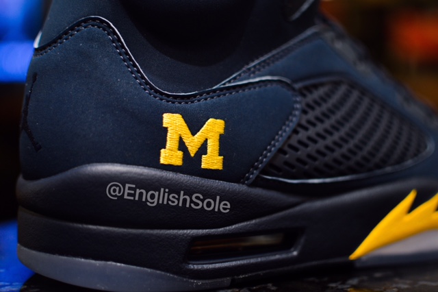 Earlier this year, the Michigan Wolverines signed with Jordan Brand resulting in a complete revamp of their uniforms and extra perks like Michigan themed retro’s. Today, we get a first look at the Air Jordan 5 “Michigan” sporting the Wolverines colors of Navy and Yellow. The upper is done with nubuck and sits on an icy blue outsole. No, these won’t be releasing but if you know someone at Michigan, hit them up to hook you up with a pair.