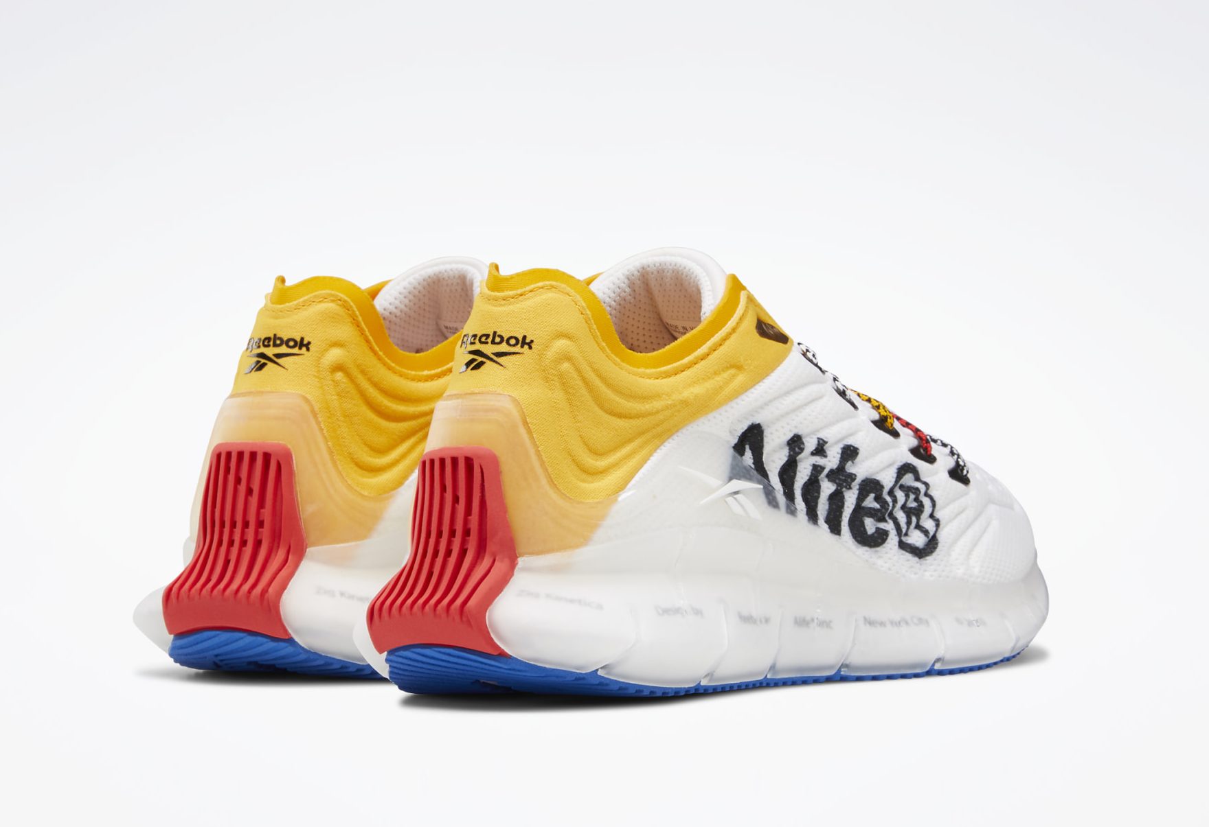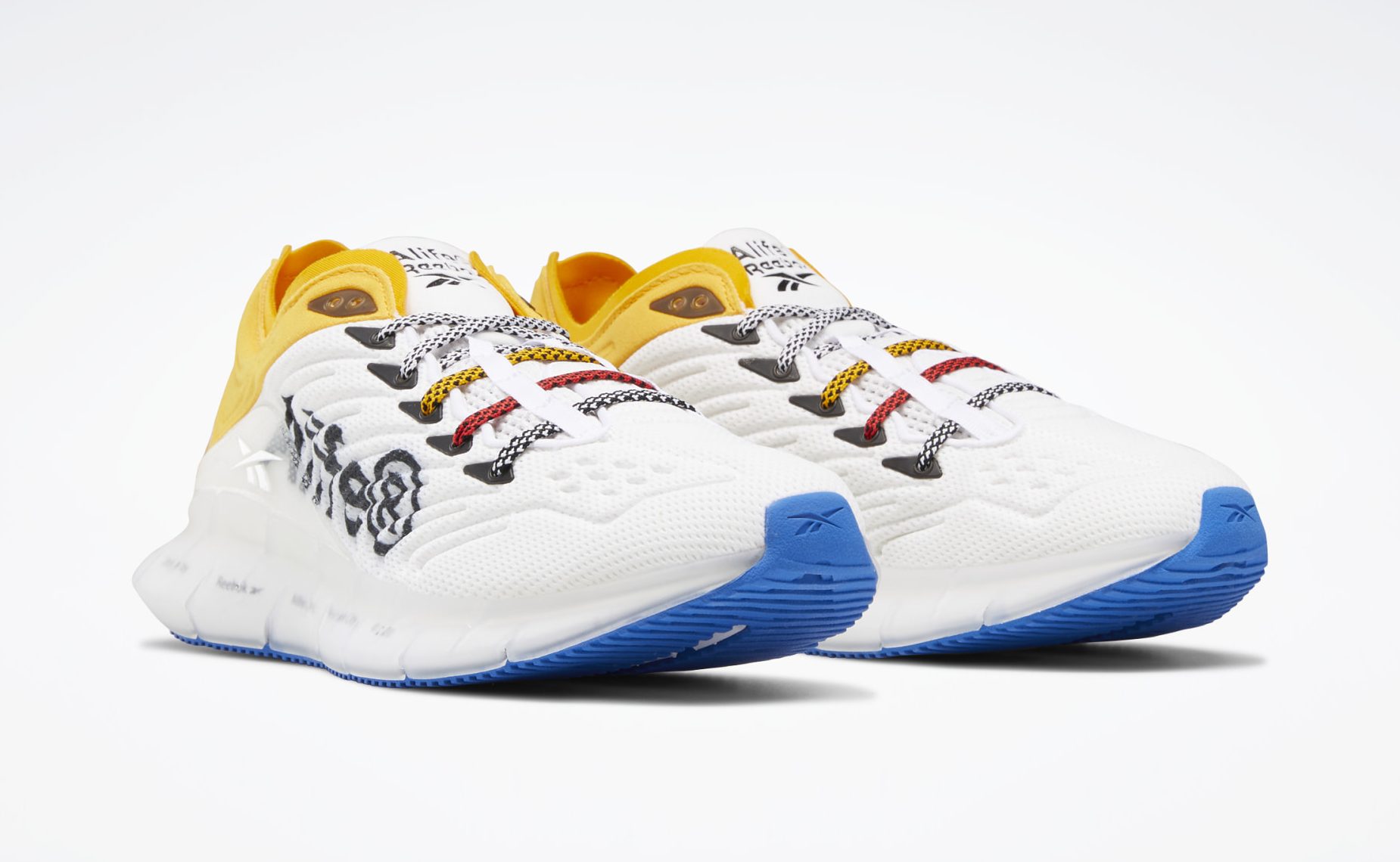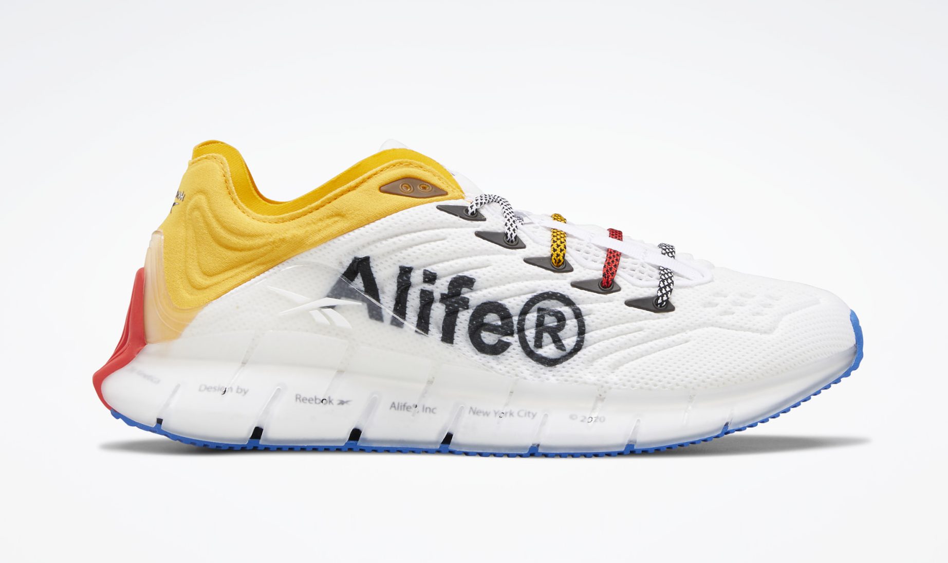 The uppers are consist of a molded white synthetic mesh along with a Large Alife logo stamped in black. A translucent heel counter with Reebok branding along with yellow heel colors to really make this shoe pop. The midsoles feature the Zig cushioning system with co-branding and all enclosed in a translucent rubber shell. The shoe sits atop an icy blue sole and comes with three different lace options to finalize this offering.