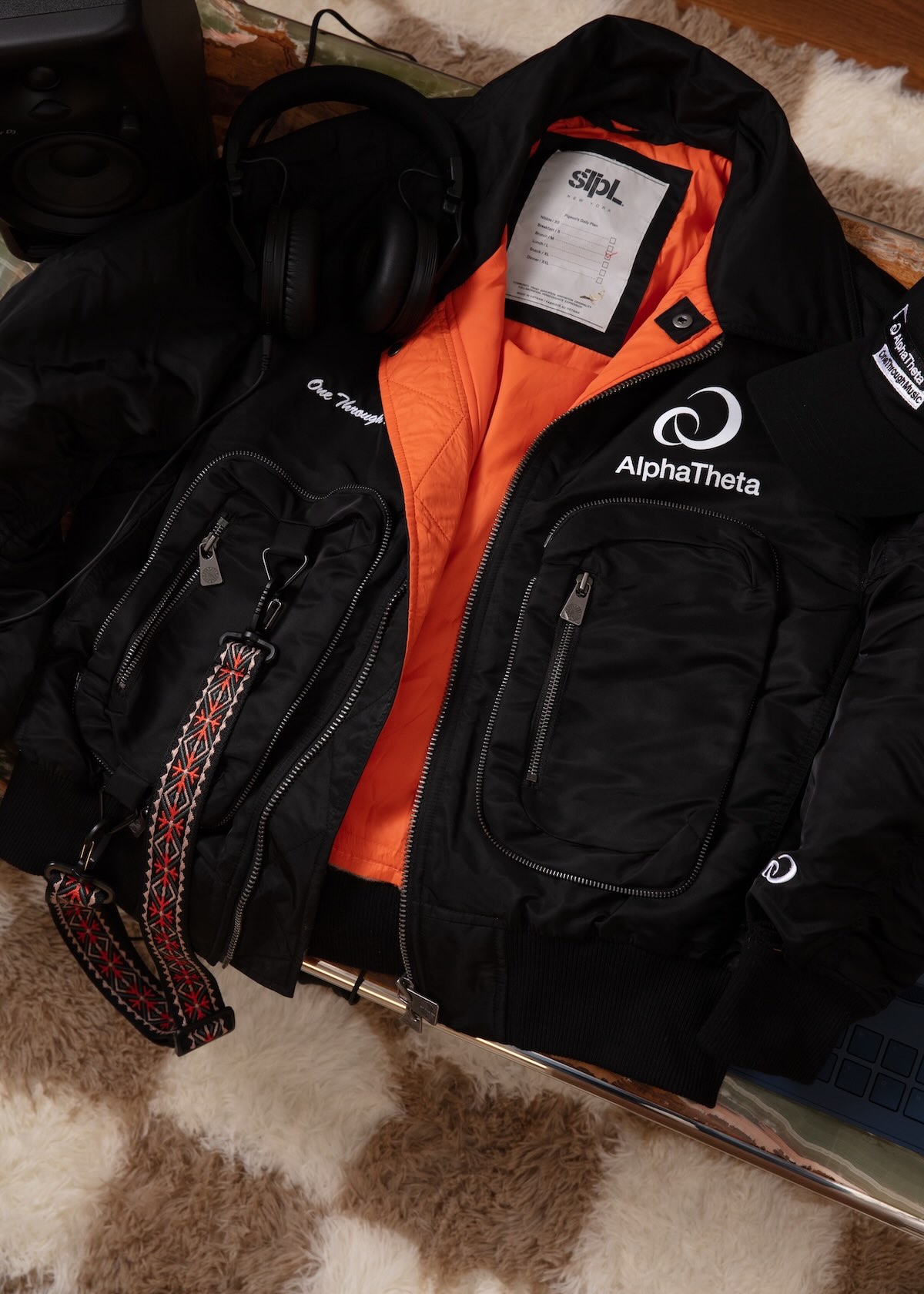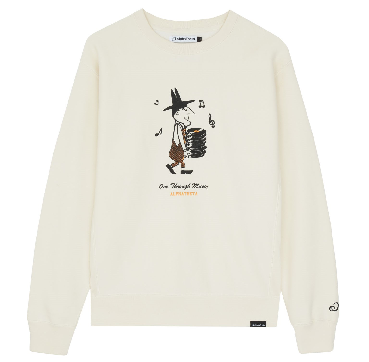At the center of the capsule is “The Record Man,” a playful character carrying his stack of vinyl, an homage to crate digging, record store culture, and the ritual of building a DJ set. The motif appears across standout pieces, including a black short-sleeve tee and a cream crewneck sweatshirt. Rounding out the capsule are statement outerwear pieces that nod directly to DJ culture, including a black coach’s jacket and a bomber jacket featuring a turntable graphic alongside a cap stamped with AlphaTheta’s “One Through Music” mantra. Together, the capsule leans into heritage while keeping silhouettes wearable and contemporary.