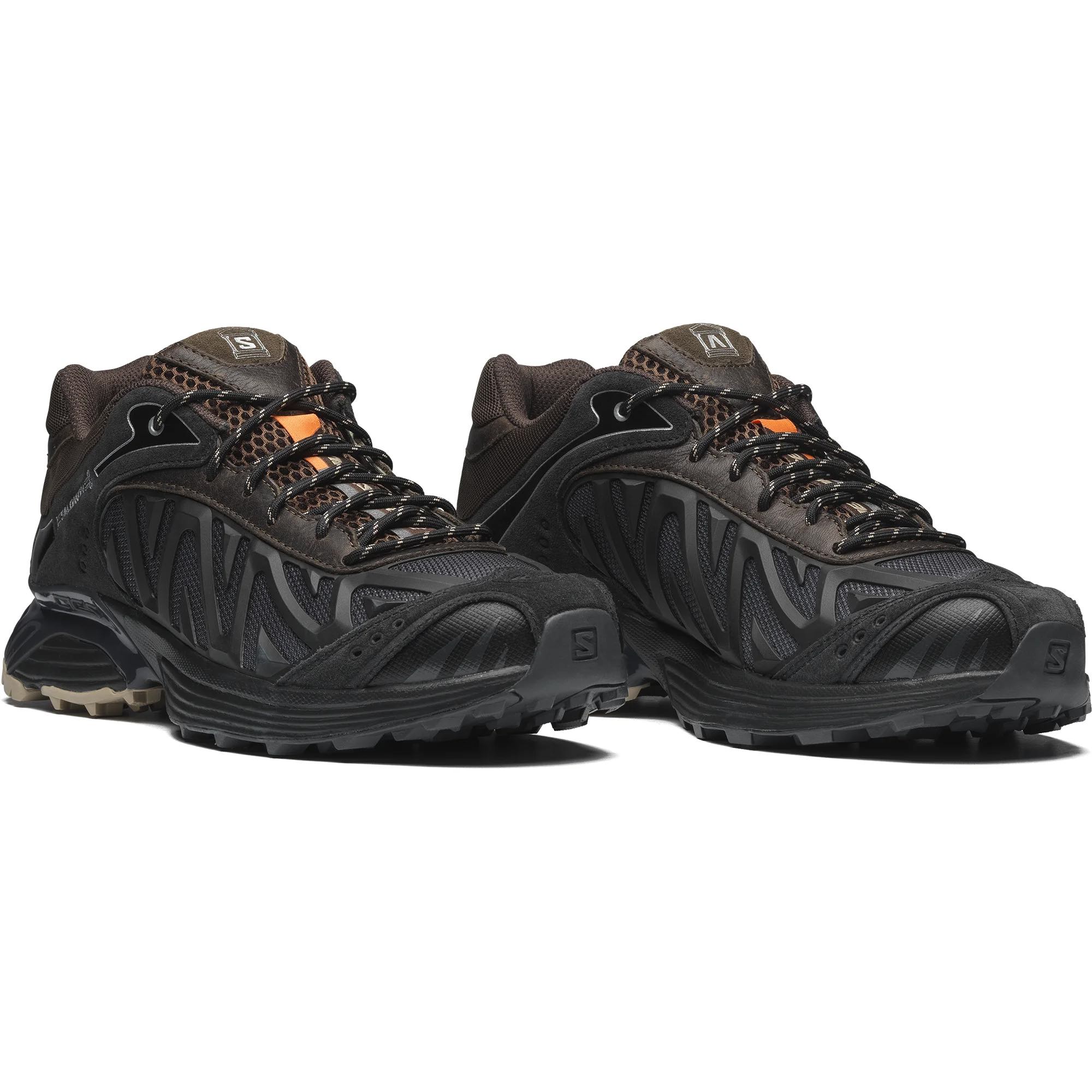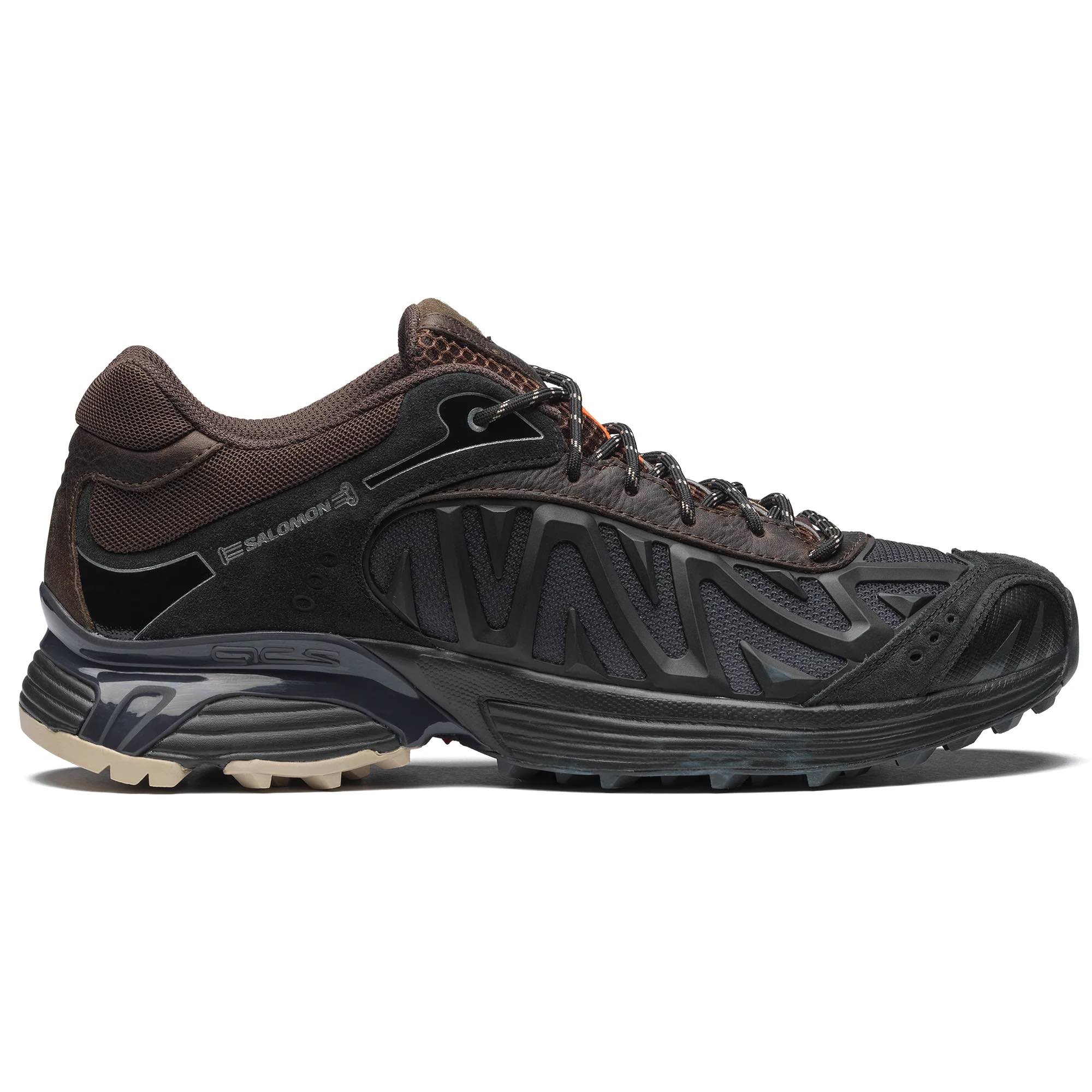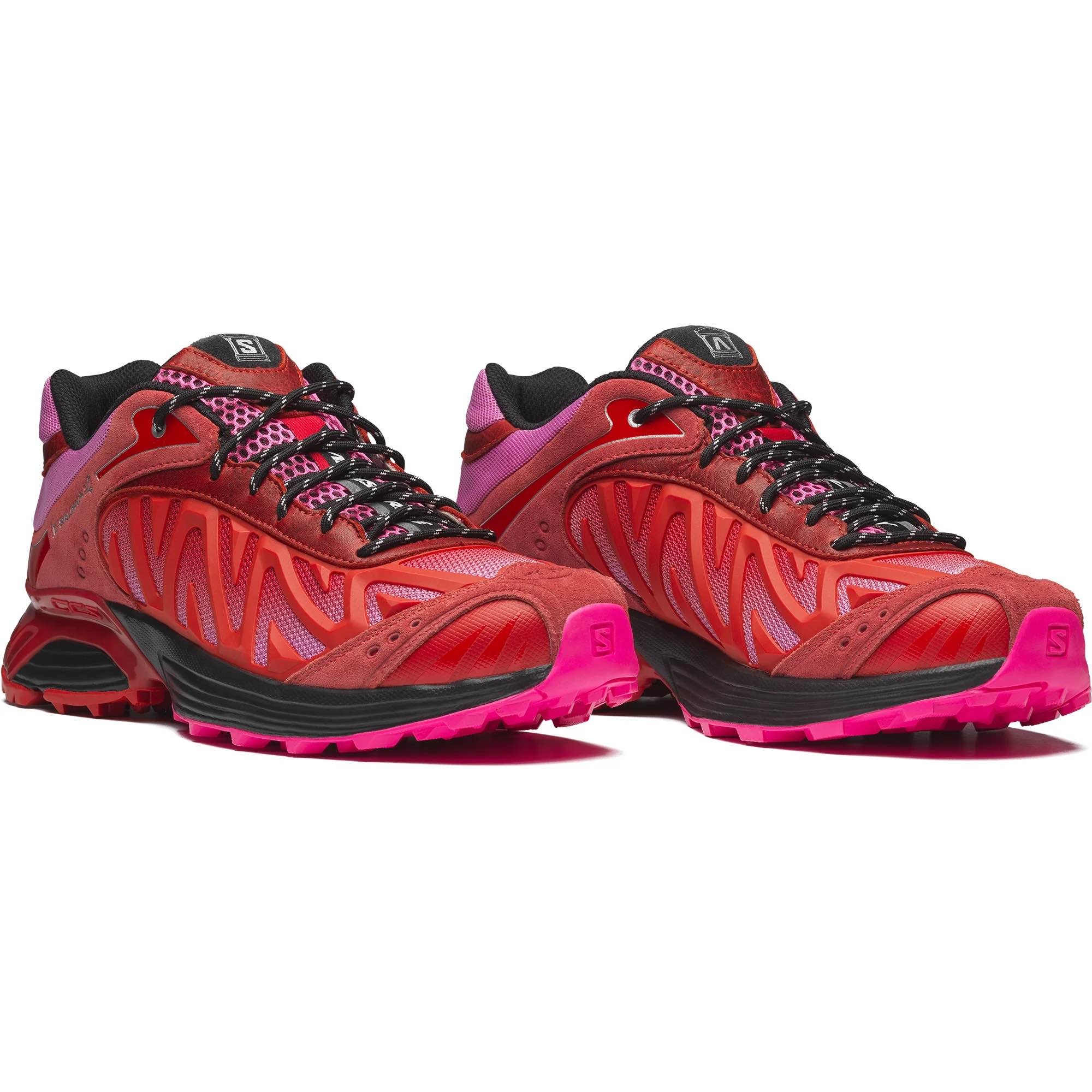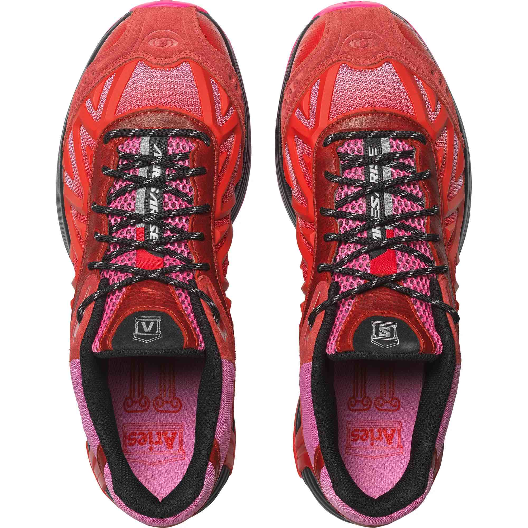 The XT-Whisper Aries Arise combines vintage-look leather and suede with technical materials, gradients and metallic foiling for a bold edition of a legendary trail shoe that feels familiar yet fearlessly unique. Arriving in vibrant “Fiery Red” and “Black” colorways, both pairs feature weathered overlays contrasted with glossy, metallic, neon details to embrace nostalgia for the past while reveling in the tech of today. Heir to an XT design lineage, the sneaker stays true to Salomon DNA with a reinforced chassis for added stability.