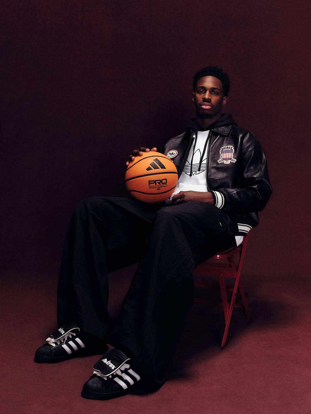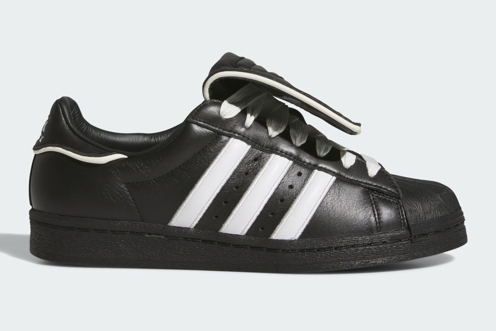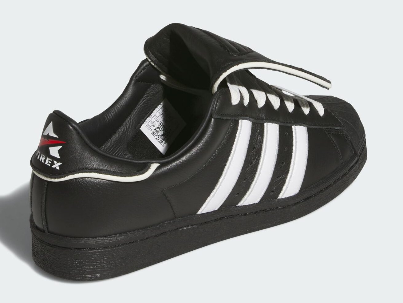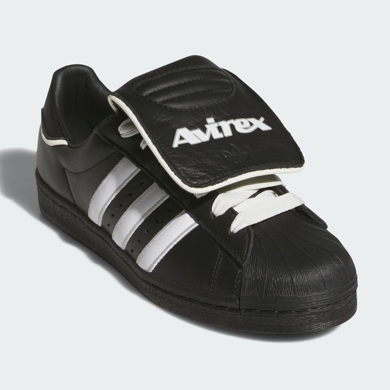 Following last year’s NYC-exclusive drop in white, the AVIREX Superstar 82 now arrives with all-black leather uppers, keeping the construction clean and the attitude loud. White Three Stripes cut through the side panels, while a padded velcro flap tongue is branded with the AVIREX name in raised lettering, makes the collab detail impossible to miss. The heel tab carries the AVIREX logo alongside a hit of red, the interior is lined in an adidas Originals trefoil repeat, with a blacked-out rubber outsole anchoring the build.