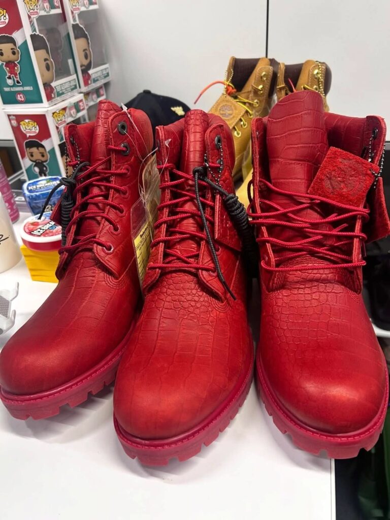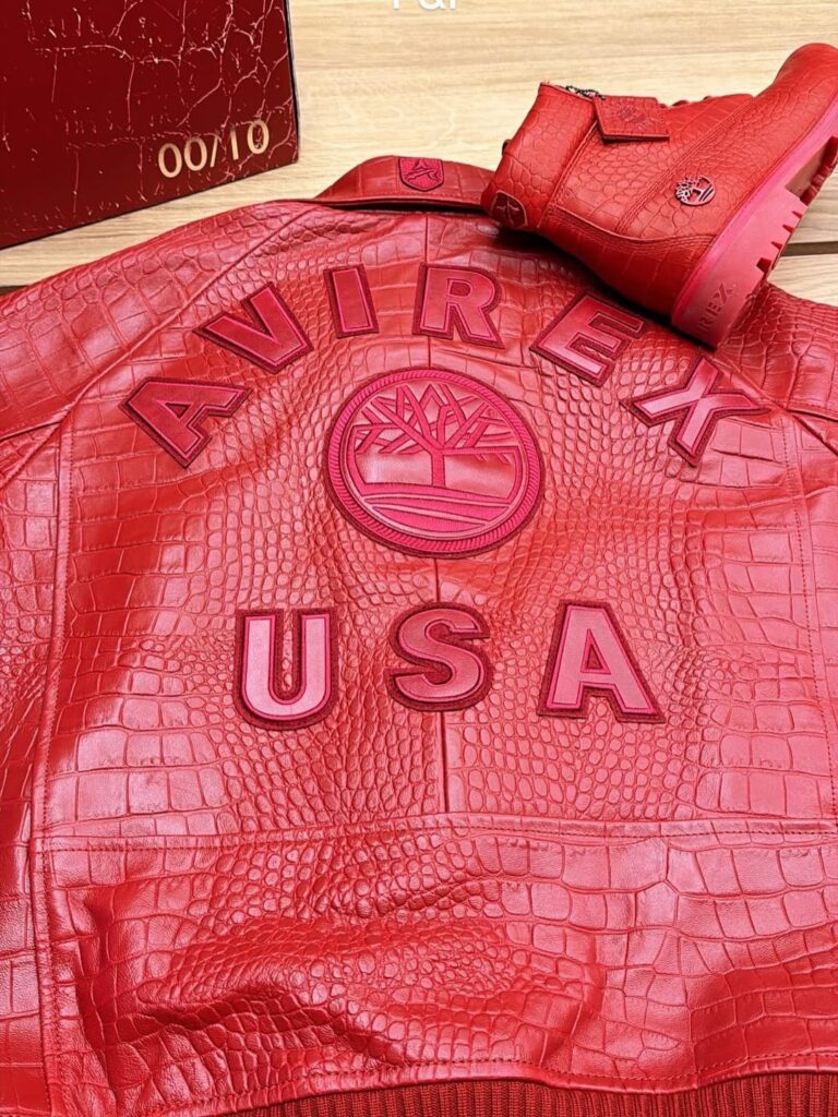 An Avirex x Timberland yellow leather jacket is dropping alongside the boot pair, with matching croc embossing on the collar and co-branding on the back. A red croc version of the boot and jacket was also made for friends and family, limited to ten units each.