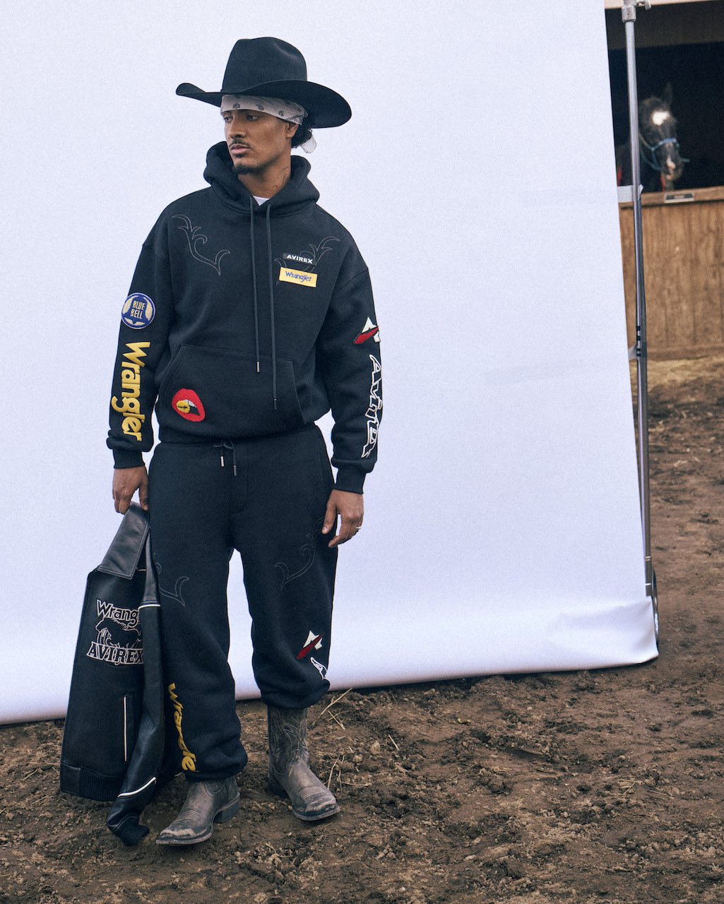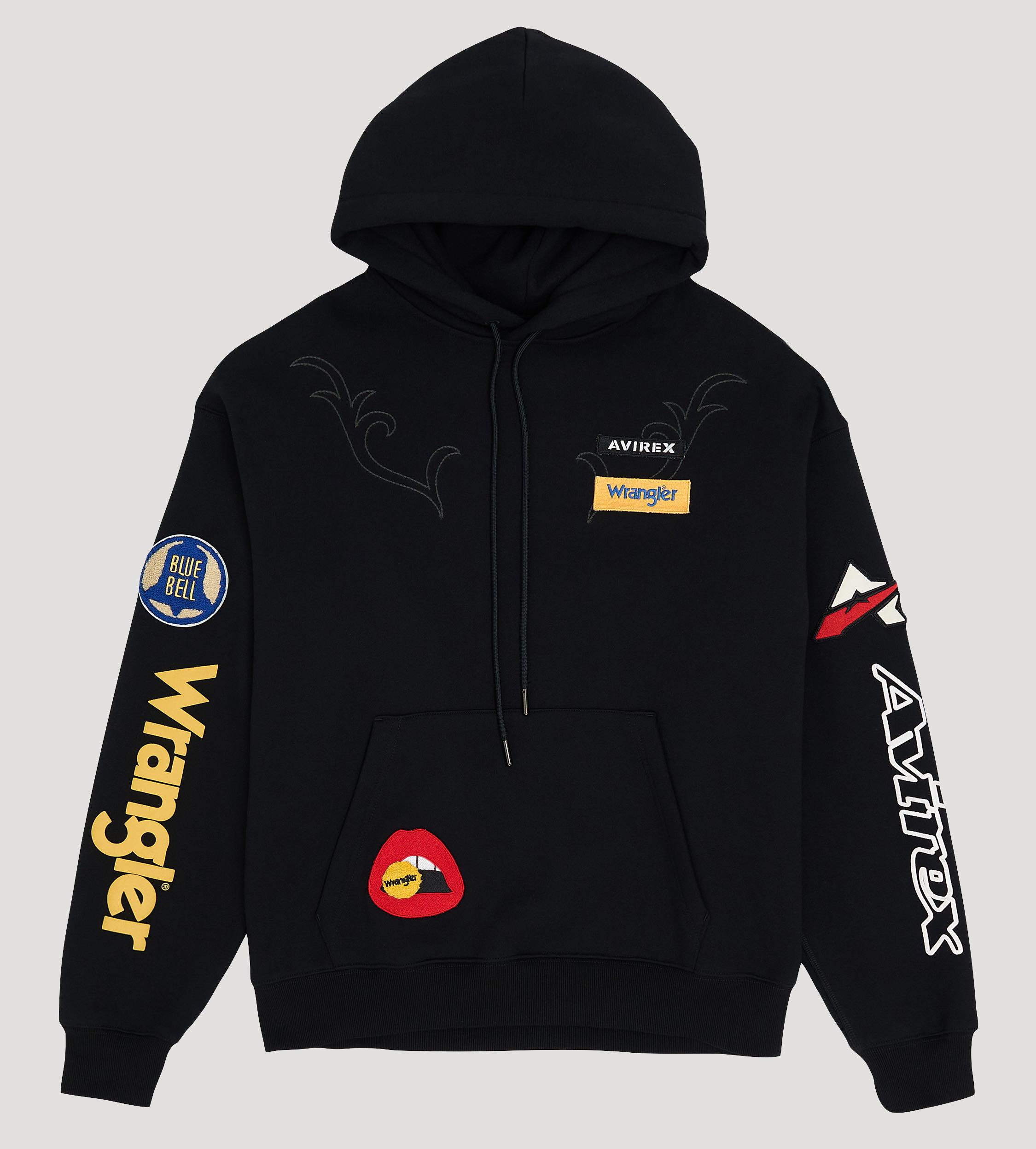 The seven-piece lineup features a Suede Trucker Jacket, a Patch Jacket, Barrel Jeans in “Black” and “Wrangler Blue” colorways, a Cotton Hoodie and Jogger set, and an all-over patchwork tee. The Trucker Jacket arrives with all-over black and white patches while the Wrangler Blue Patch Jacket features all-over patches with color palettes from both brands, including Wrangler’s blue and yellow and Avirex’s iconic yellow and red. Each piece includes signature co-branding and intricate detailing, such as sturdy button closures and functional pockets, reflecting both brand’s premium high-quality craftsmanship.