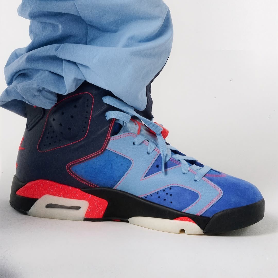 The standout AJ6 in “Midnight Navy” plays with layered contrast, pairing saturated royal-blue suede with softer light-blue accents. Midnight Navy frames the rear section, wrapping the heel and collar, while Infrared 23 stitching cuts sharply across the upper. Awake NY’s ornate “A” logo marks the collaboration, complemented by a black-and-infrared midsole and a clear outsole. The AJ6 collaboration doesn’t stop there; although not yet previewed, Awake NY is also expected to drop a second pink colorway along with this pair.