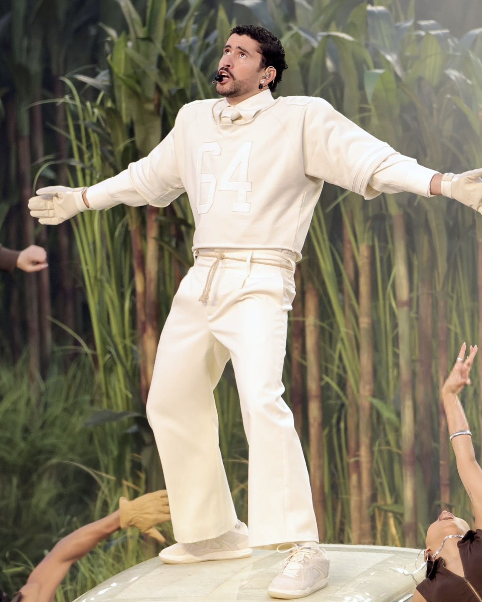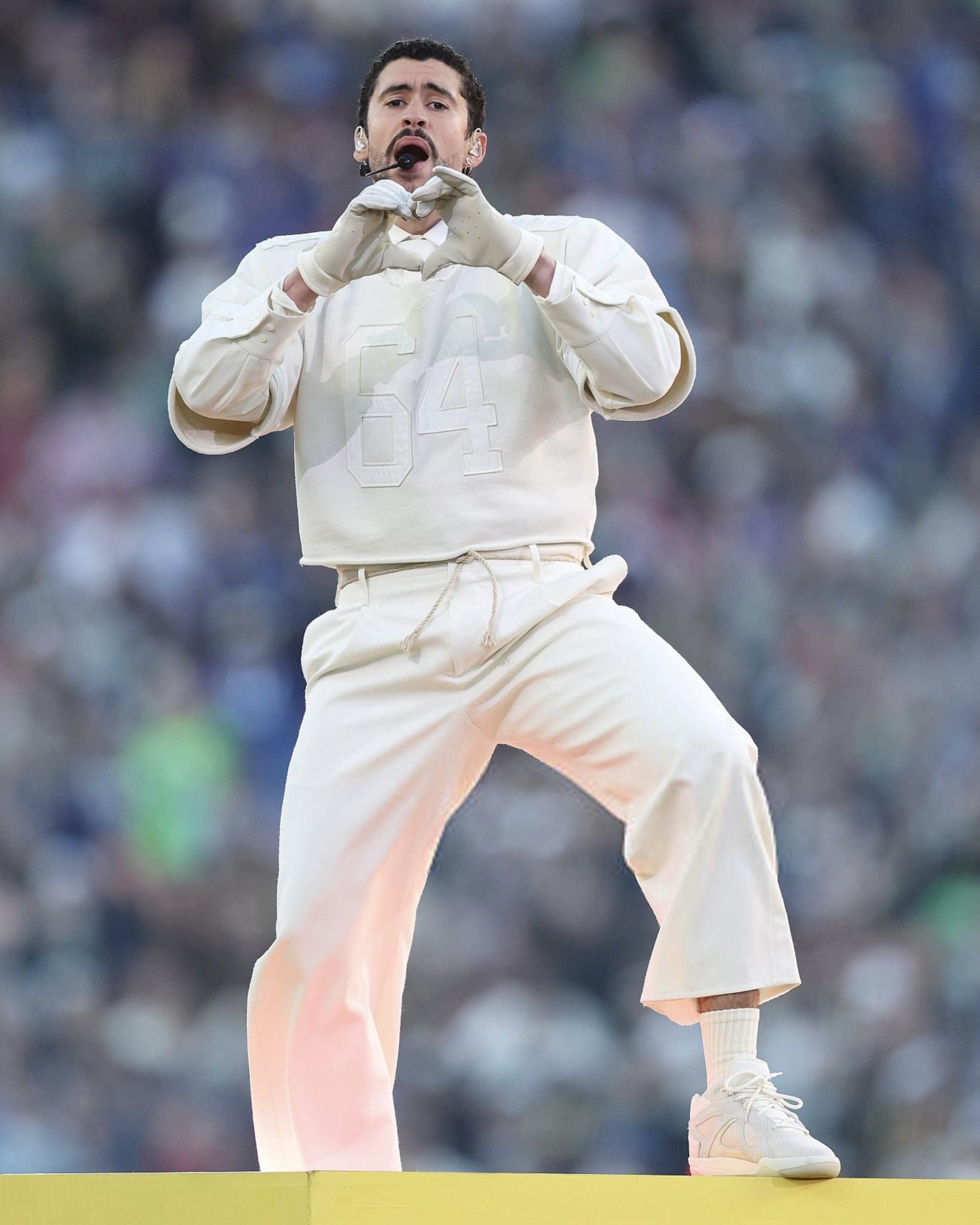 During his halftime show at Levi’s Stadium, Bad Bunny matched what some are calling the “Resilience” coloway with an all-white outfit featuring an oversized shoulder pad jersey labeled “Ocasio” and white gloves. Although the show was only 13 minutes, he delivered a high-energy performance with Lady Gaga and Ricky Martin joining him.