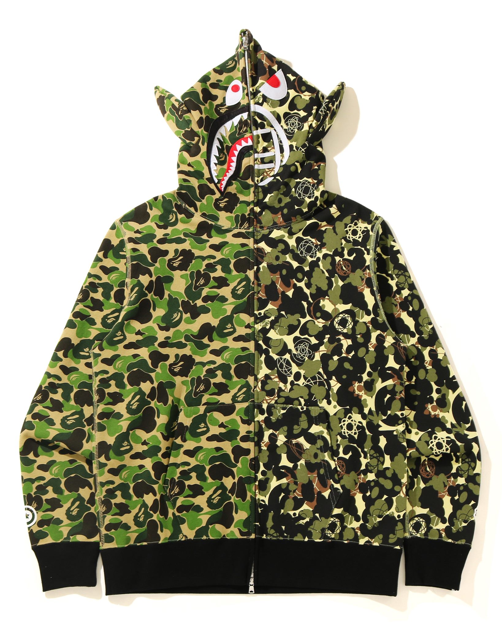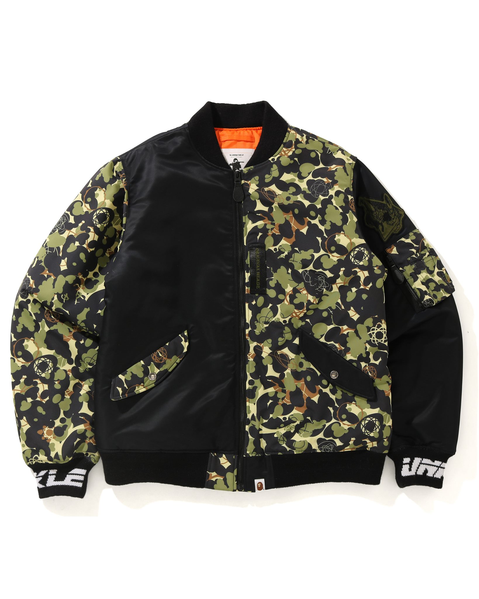 The ten-piece collection provides offerings such as t-shirts, jackets, and sweatshirts, while the spotlight remains on the UNKLE BAPESTA. Design elements within the collection feature characters and logos created by Futura, Ben Drury, and James Lavelle. The “MO WAX ARTS CAMO” seen on various pieces is a symbolic design created to express the identities of MO WAX and UNKLE; it can be seen throughout the lineup incorporating the duck pattern, a graphic trend popular in ’99, into the modern collection. The BAPESTA is an updated version based on the UNKLE BAPESTA released in 2003, featuring “M.W.A. CAMO” and lime green accents.