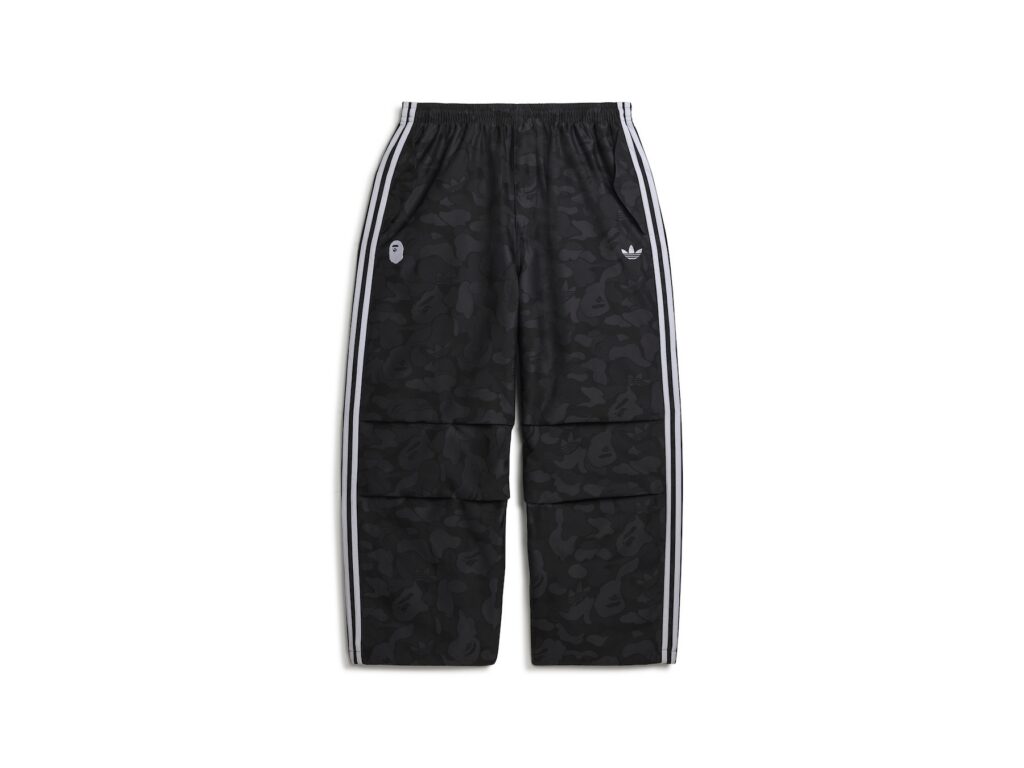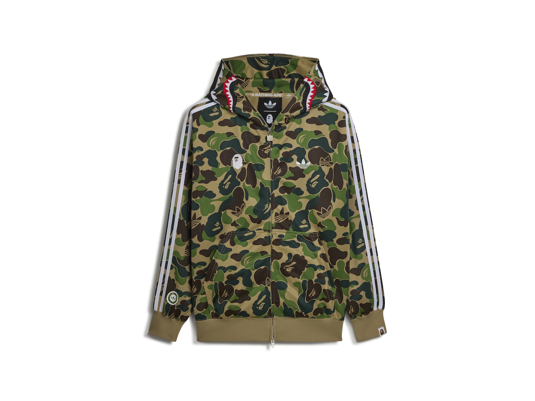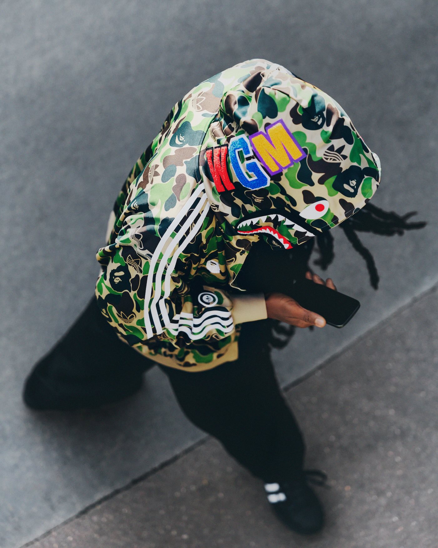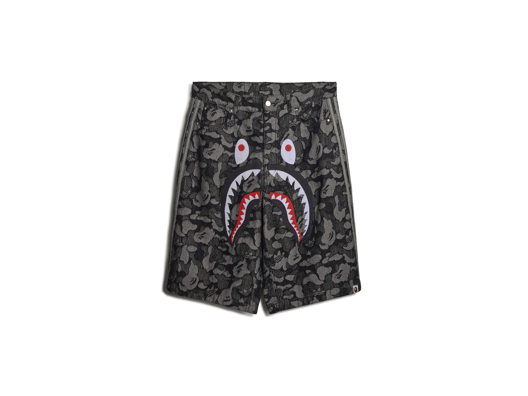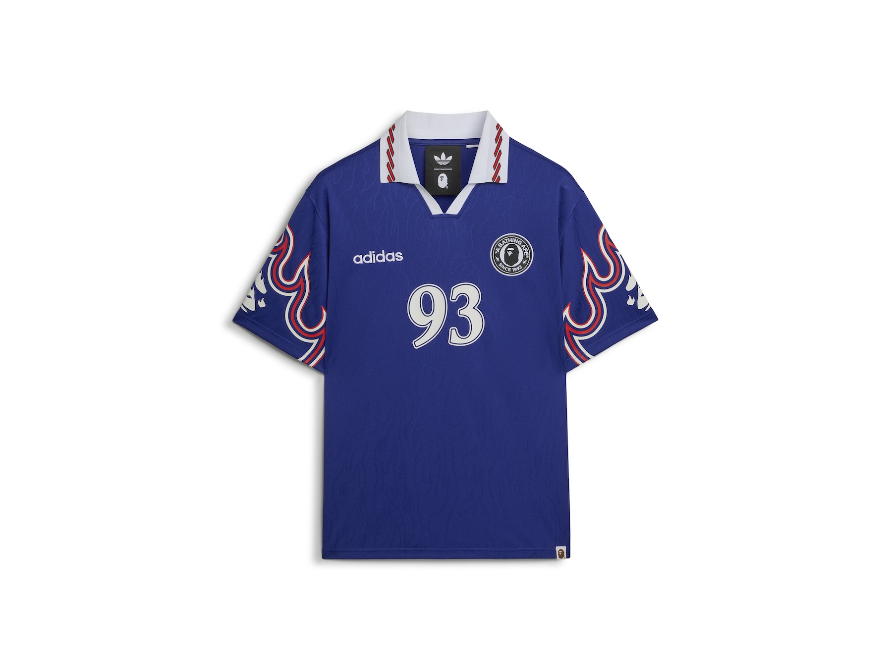 The accompanying apparel includes a blue long-sleeve denim print collared jersey with bold star graphics, a direct nod to the iconic adidas 1994 USA jersey. A second jersey reimagines the 1998 Japanese national team jersey with an original BAPE flame graphic on the sleeves and back personalization that reads “BAPE 93” — a nod to the year the brand was founded. Rounding out the apparel offering is an APE HEAD graphic tee, a Trefoil ABC CAMO Green Shark Hoodie, Shark Motif CAMO Jacquard Denim Jorts, and Jacquard CAMO parachute pants.