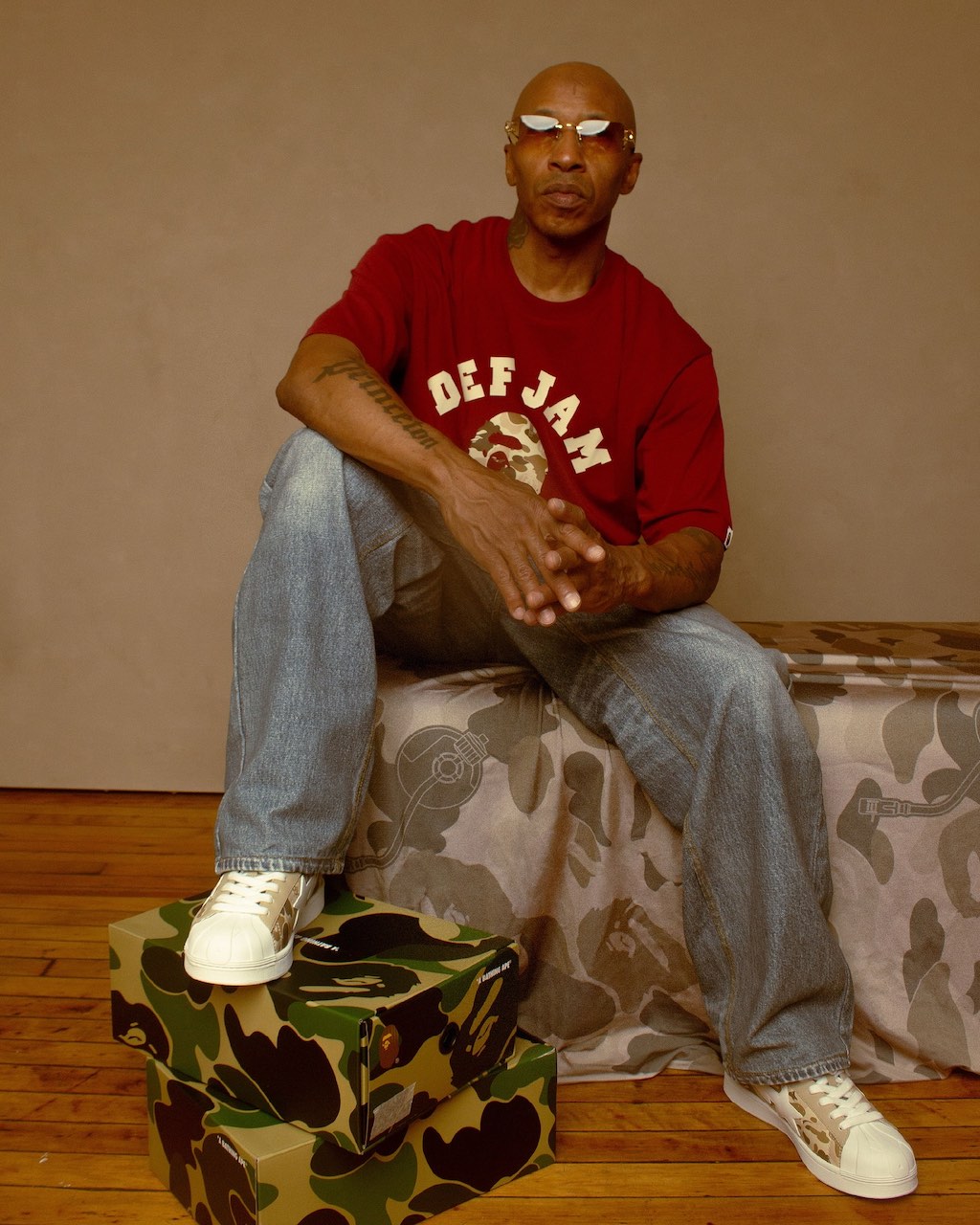 The collection features the return of BAPE’s SKULL STA silhouette in two colorways—grey and brown—each covered in a camo print made specifically for this collection that featuring Def Jam’s logo and turntable arm motif. Additional details include “Def Jam Enterprises” branding on the lateral heels, white STA logos on the side panels, and BAPE branding embroidered in red on the back.