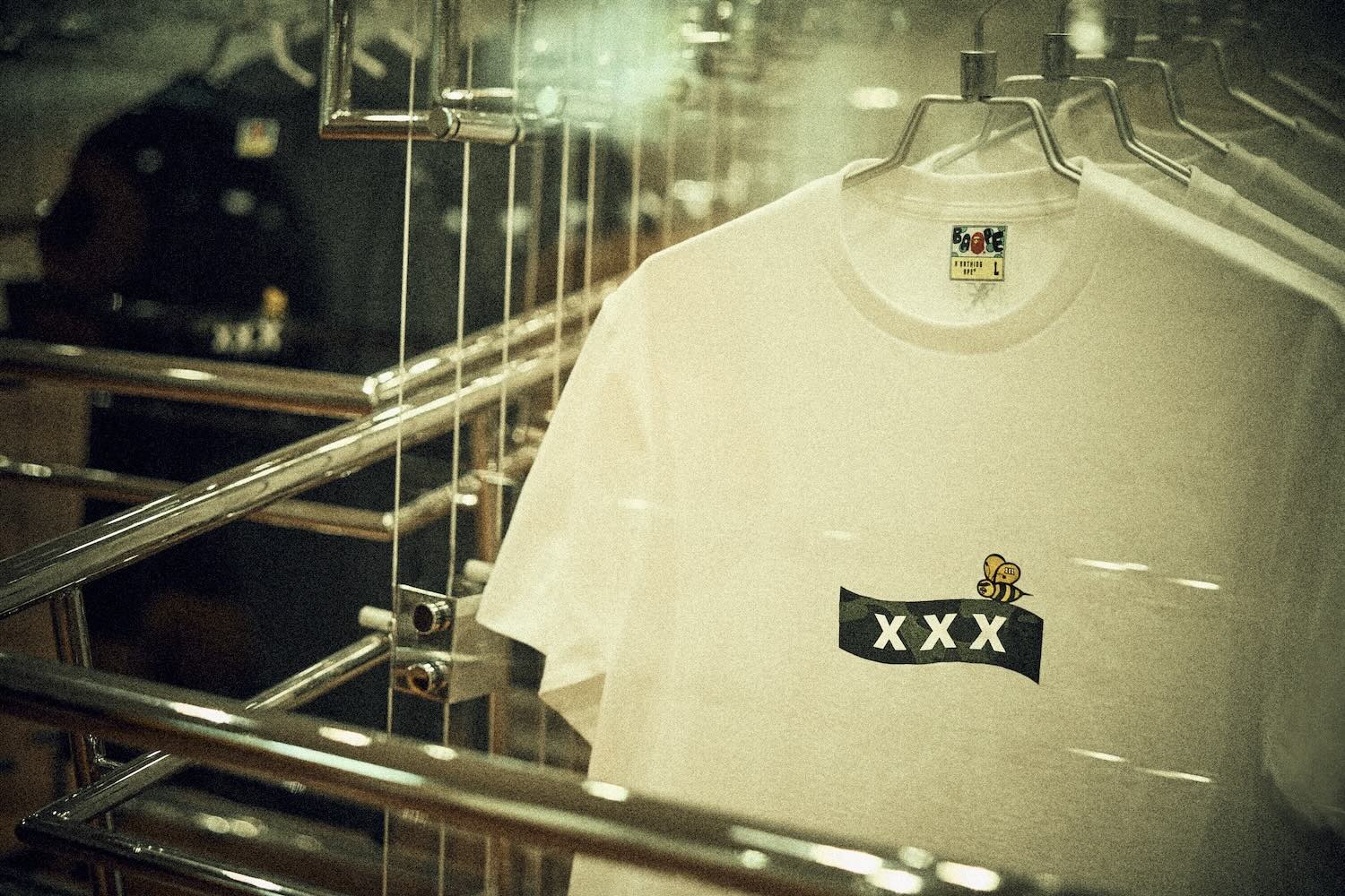 BAPE x GOD SELECTION XXX drops Sunday, April 28th on the BAPE.COM, US.BAPE.COM, the GOD SELECTION XXX website, and at A BATHING APE and God Selection XXX stores.
