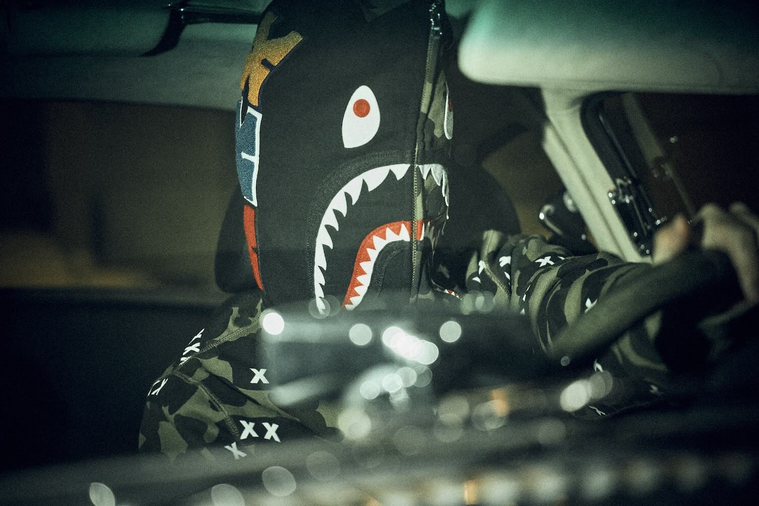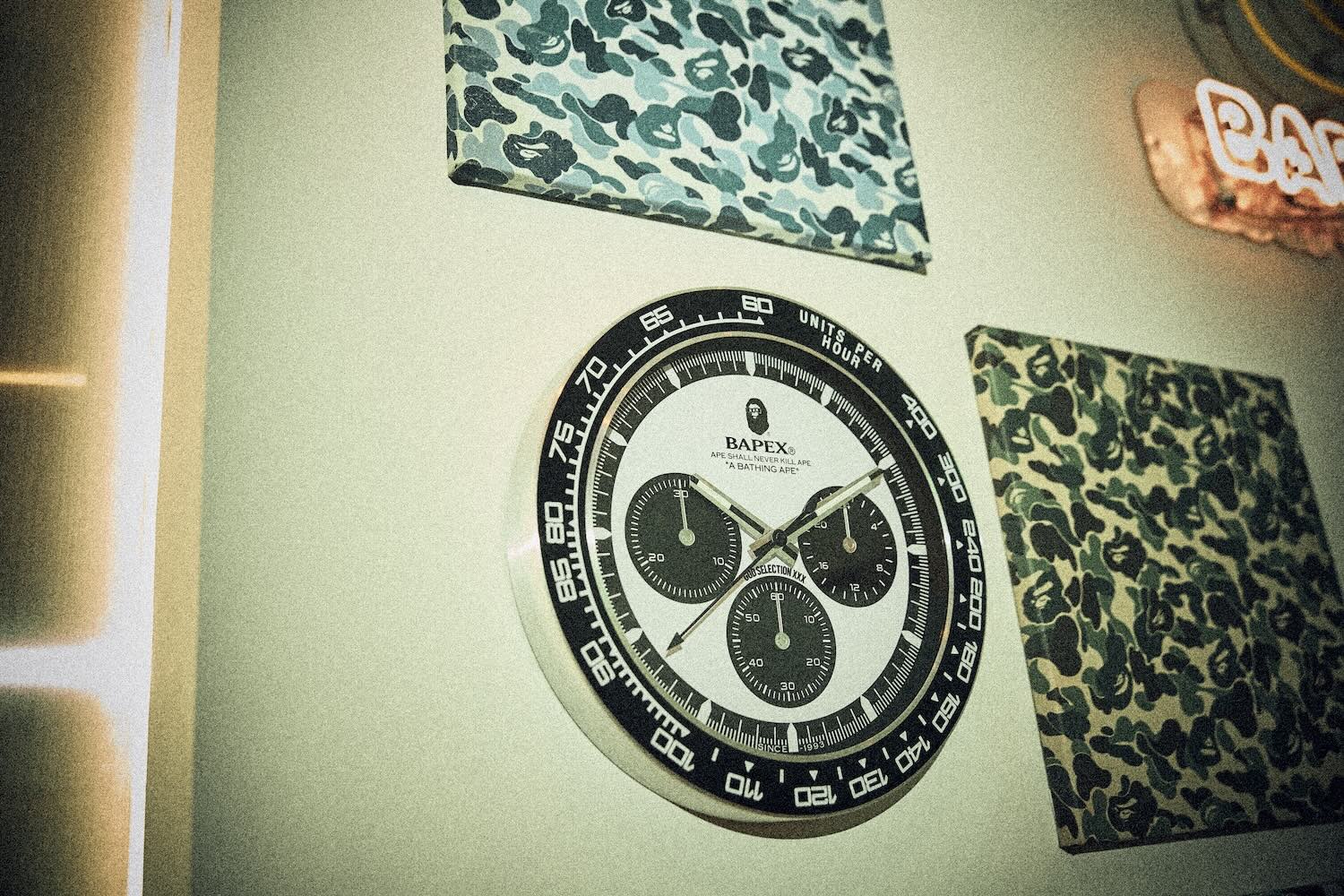 Other pieces feature BAPE CAMO infused with “XXX” branding. This pattern is featured on a snowboard jacket, shark hoodie, as well as on a cushion and rug. Rounding out the collaboration is a BAPEX wall clock, BAPE BEE keychain, and BABY MILO vinyl figure.