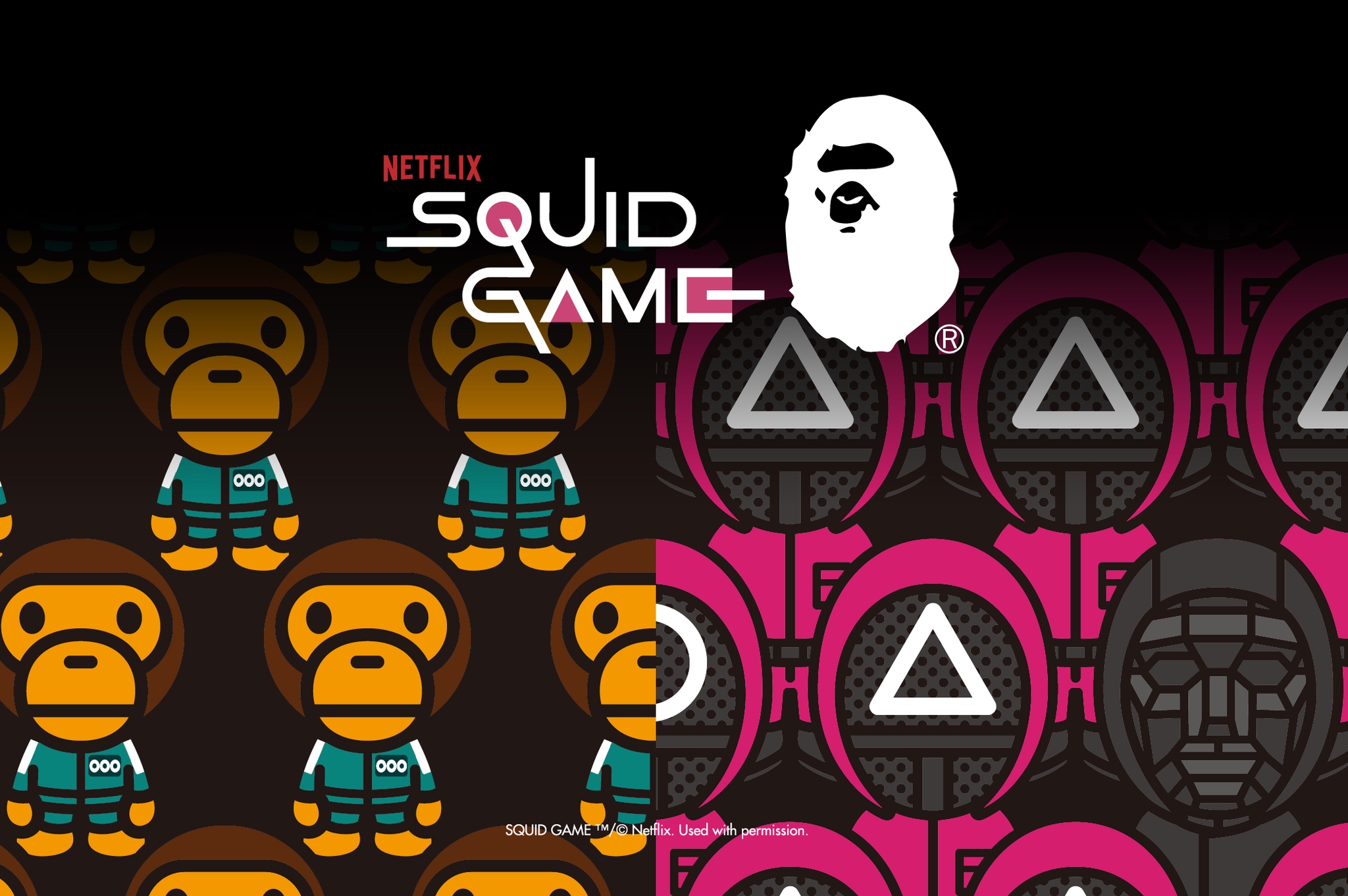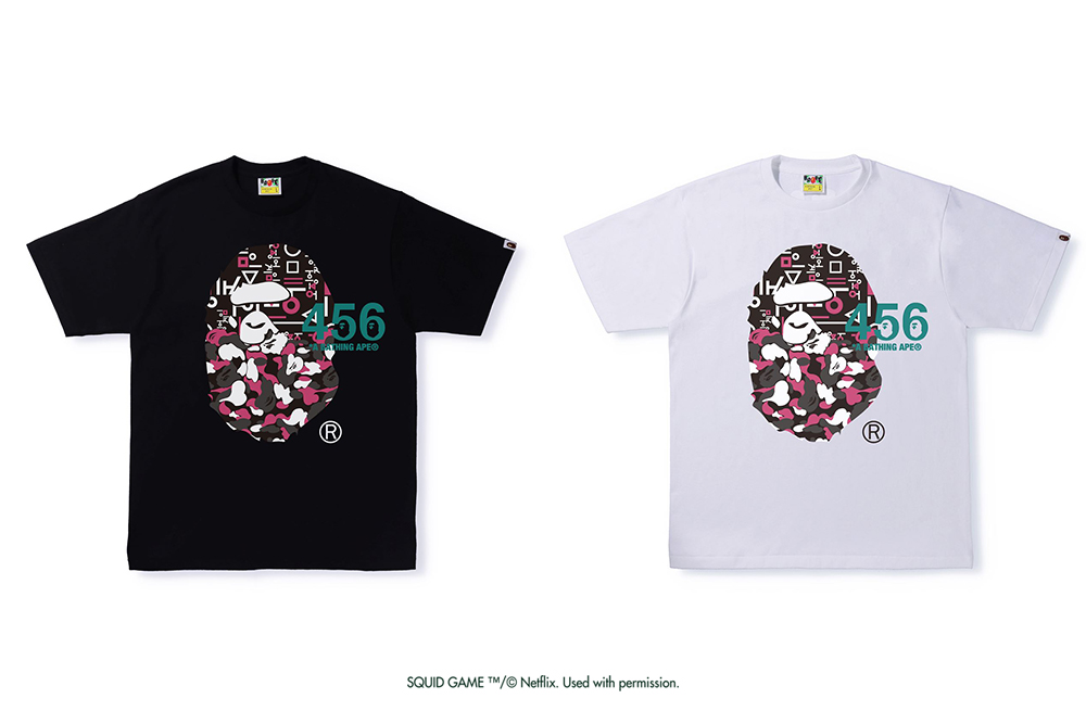 BAPE has teamed up with Netflix on a lineup of limited edition tees based on the popular Korean series Squid Game, the #1 most watched show on the streaming service in 2021.