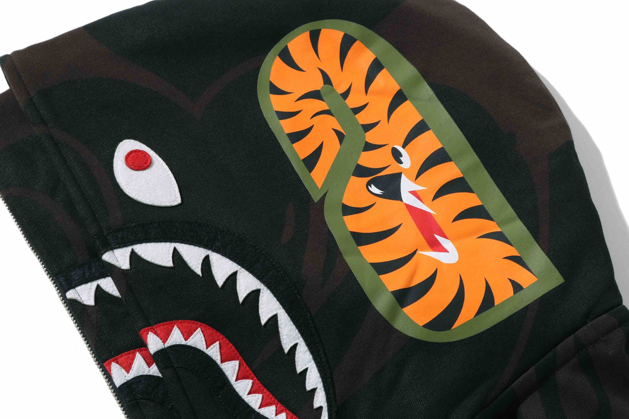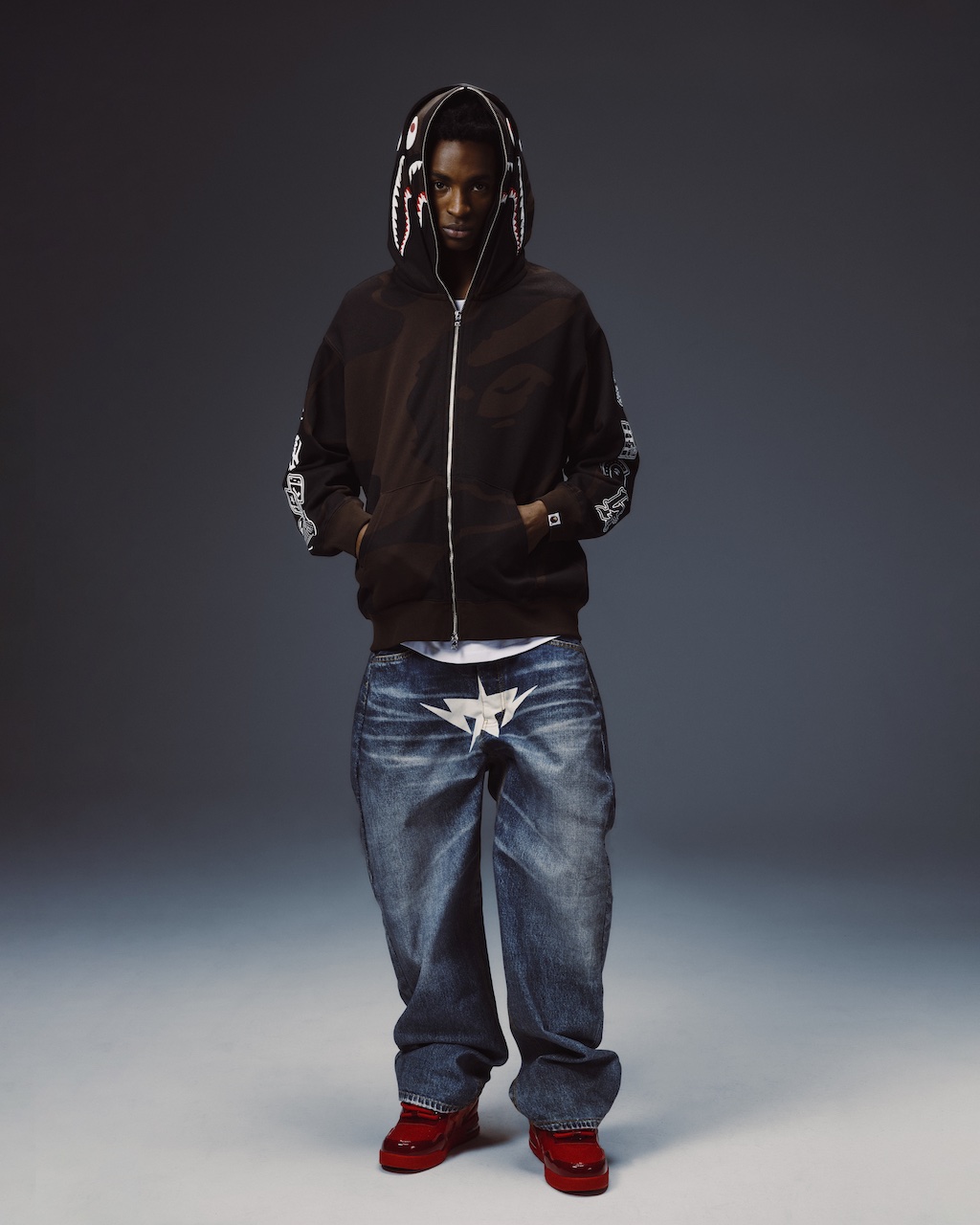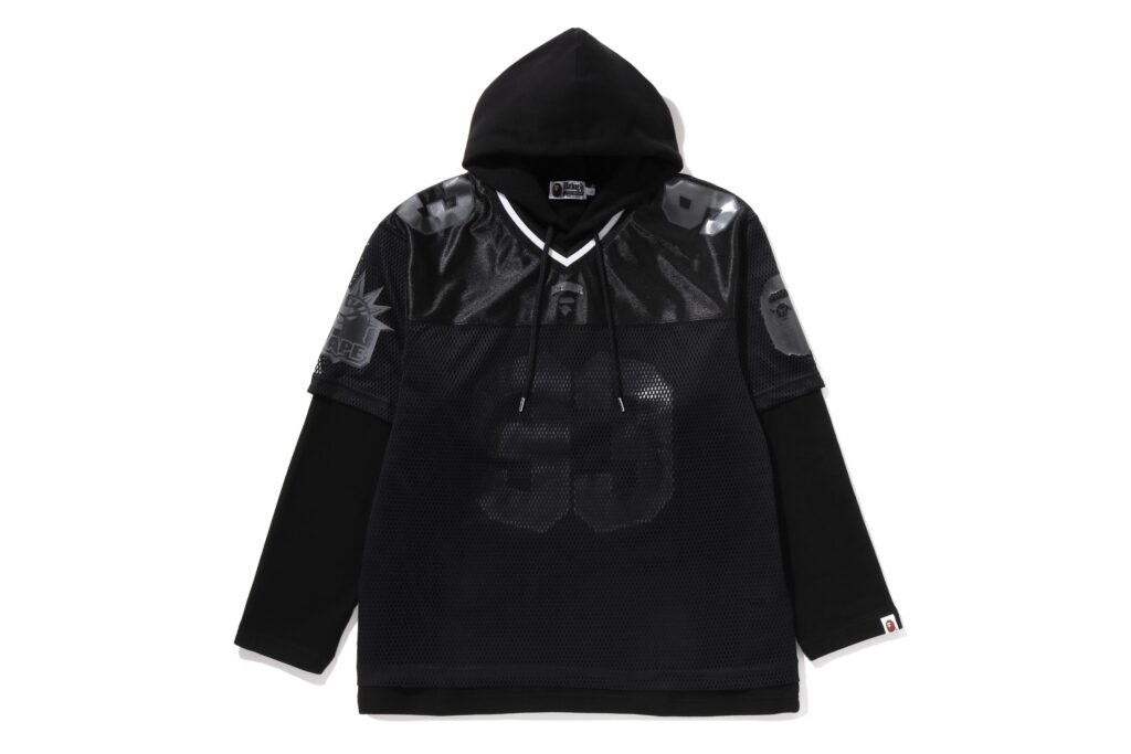 The accompanying apparel introduces bold new foil-metallic prints and a black tone-on-tone aesthetic, blending innovation, heritage, and fearless expression through premium textures and signature motifs. The Double Shark Hoodie features a double shark hood, updated “USA” branding in place of the traditional WGM patchwork, and eight store stamps as graphic accents on the sleeves. Other highlights include a Solid Camo Double Shark Hoodie and a Mesh Layered Multi Logo Pullover Hoodie that arrives with metallic detailing and a distinctive two-layer construction combining a jersey base and hoodie overlay for a structured, dimensional look.