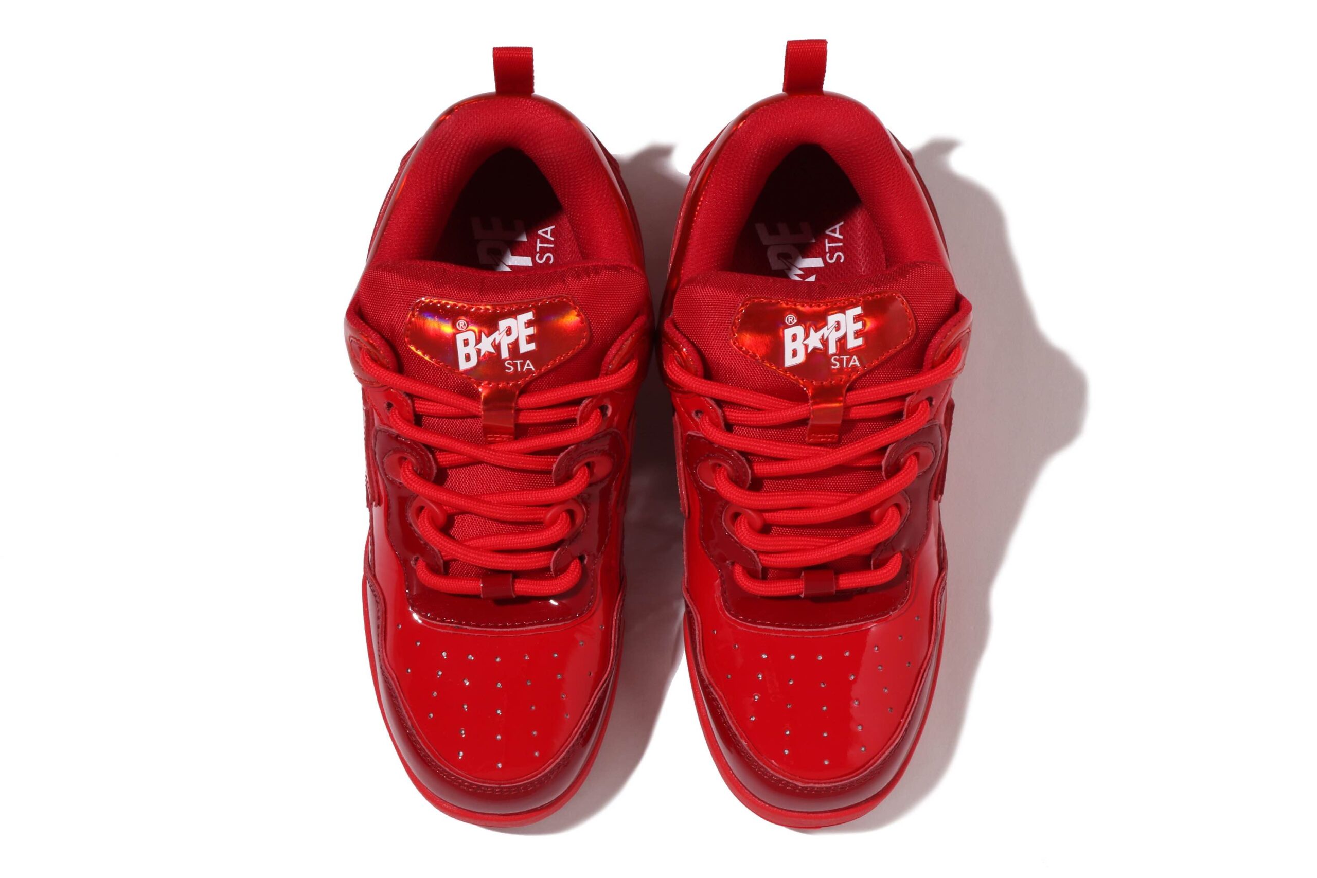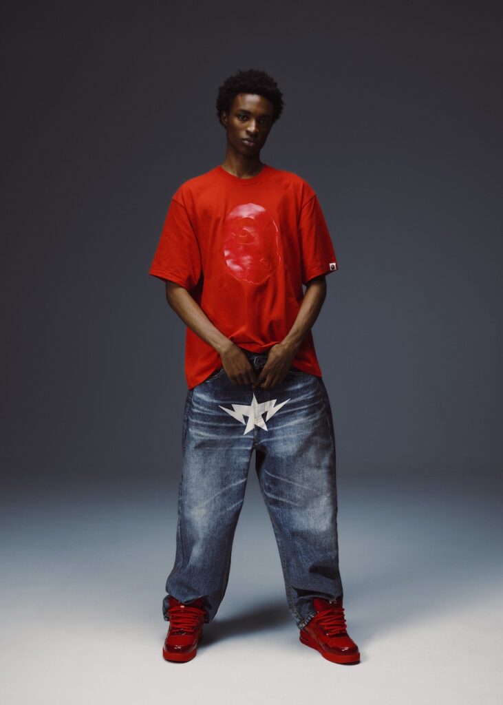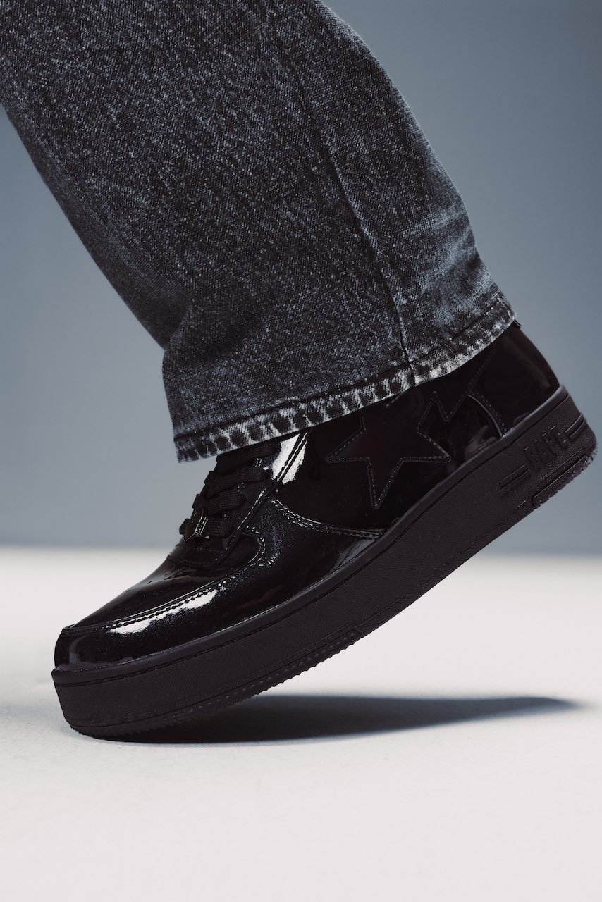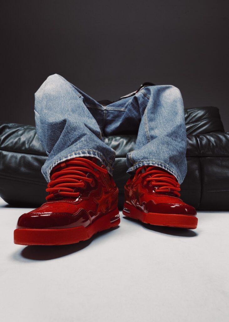 Releasing for Black Friday, the collection includes two footwear styles — a metallic red FLIP STA and a BAPE STA in black — matching the color palette of the apparel offering.