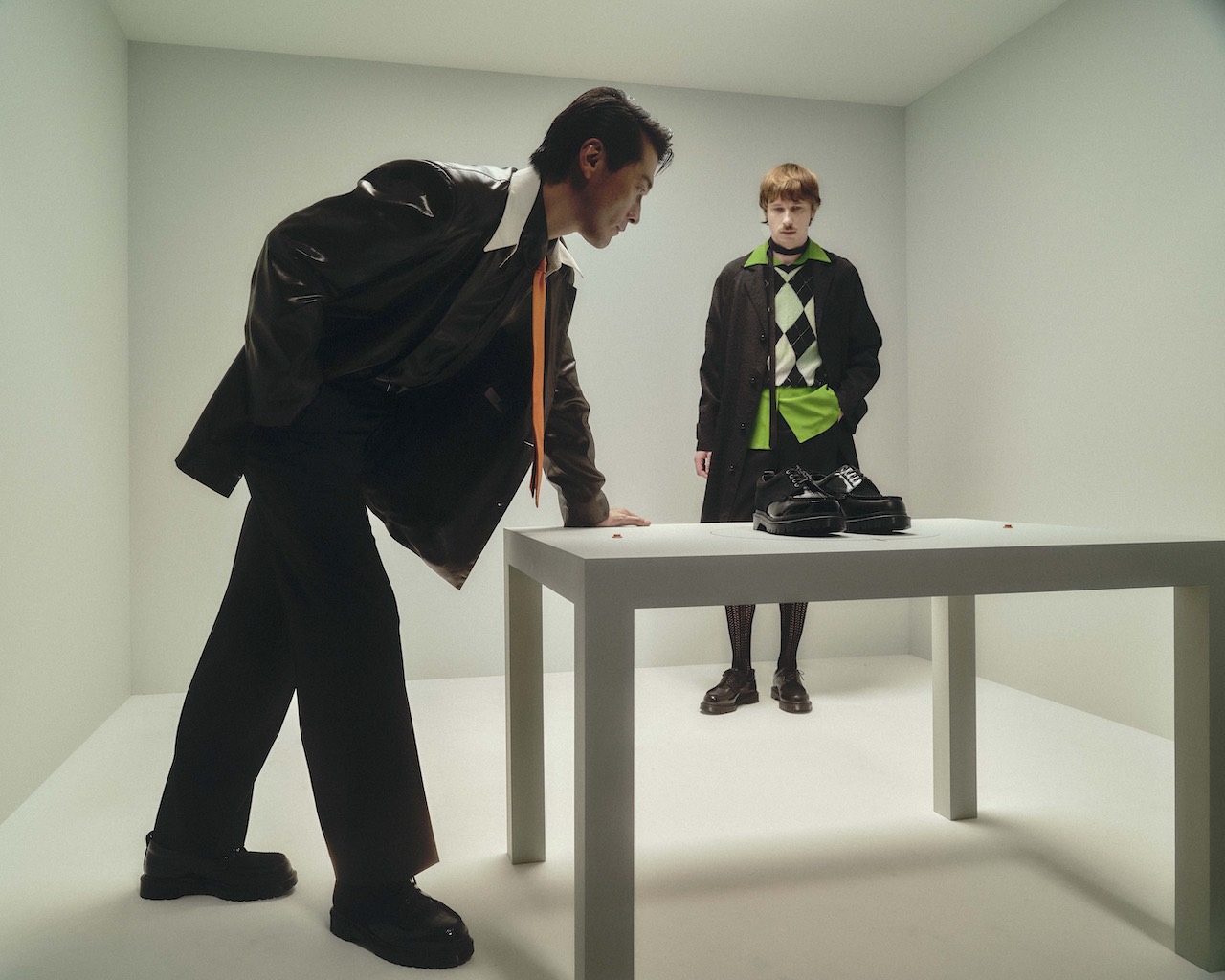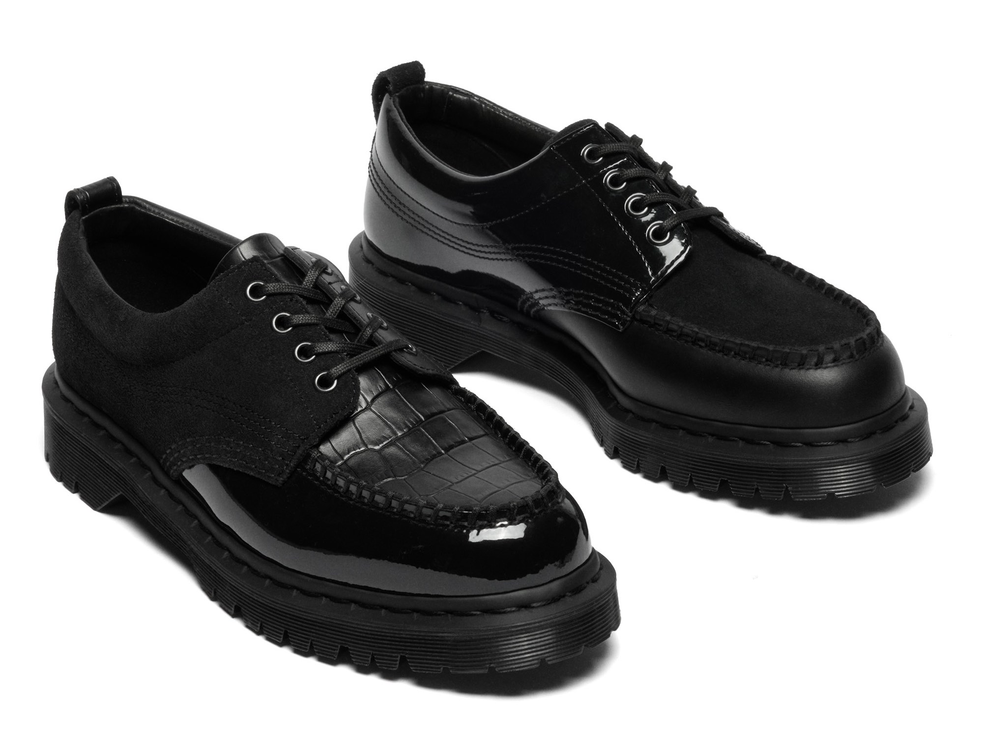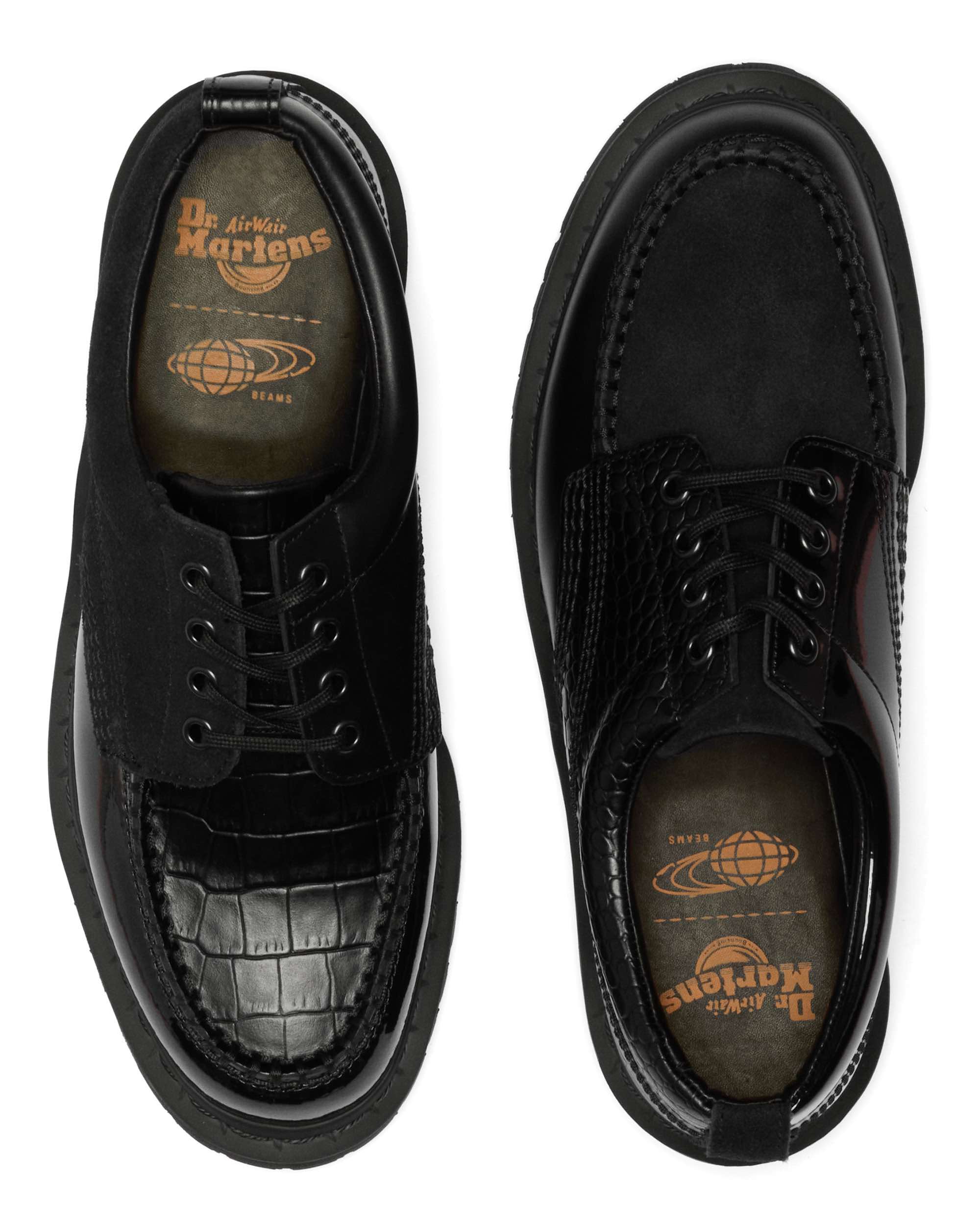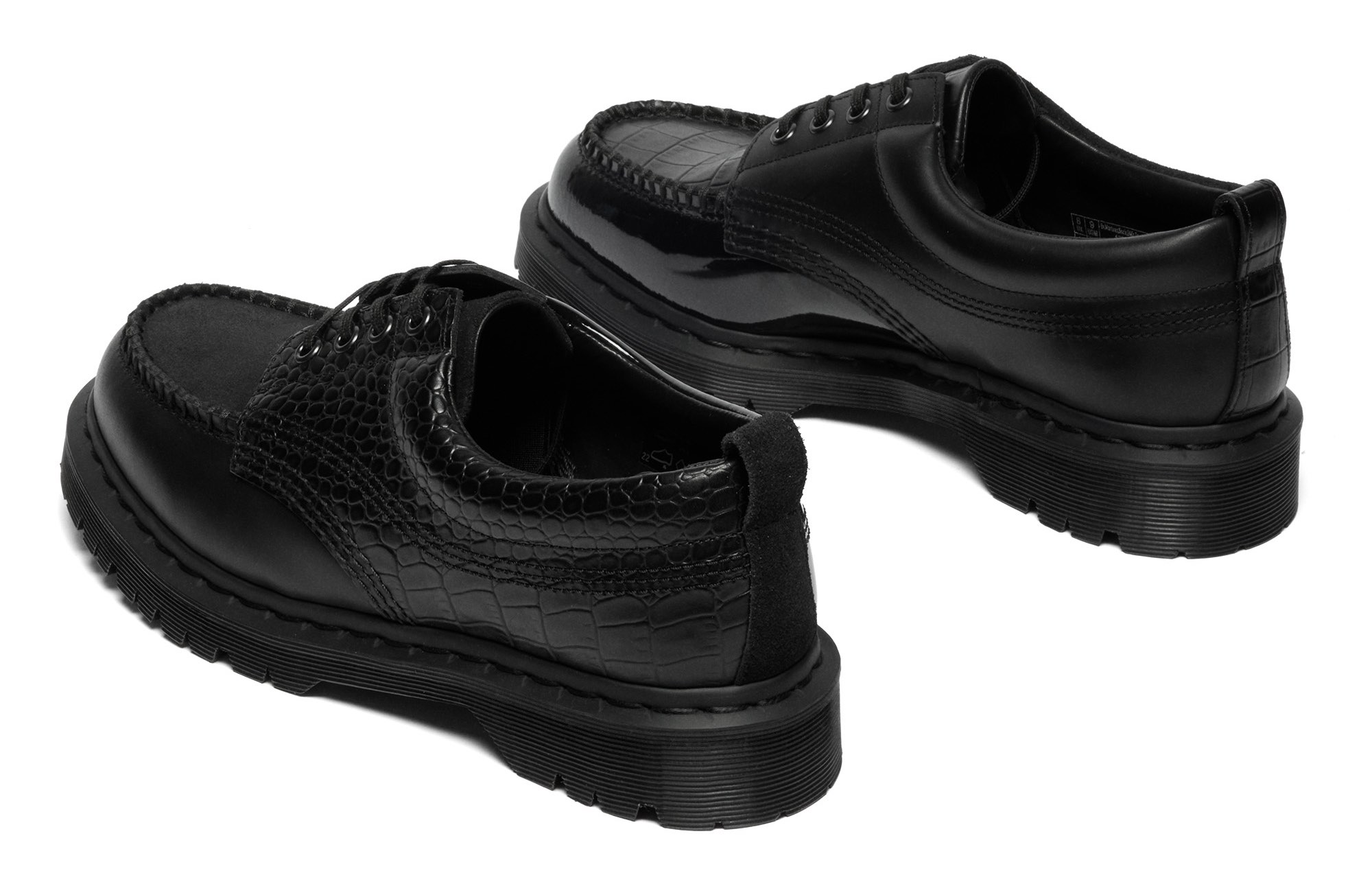 Fusing British heritage with Tokyo cult design, the all-black moc toe shoe features Dr. Martens’ signature rugged sole with a welt stitch, while the uppers have been reworked with BEAMS’ signature “Crazy Pattern” lens. Playing with texture and asymmetry, the shoe is constructed using high-shine Patent, soft Bronx Suede, smooth Orleans, and croc-embossed Atlas leathers across five distinct upper panels. The various materials come together across the two shoes to create a mismatching pair, resulting in a dynamic monochrome statement that feels both refined and subversive.