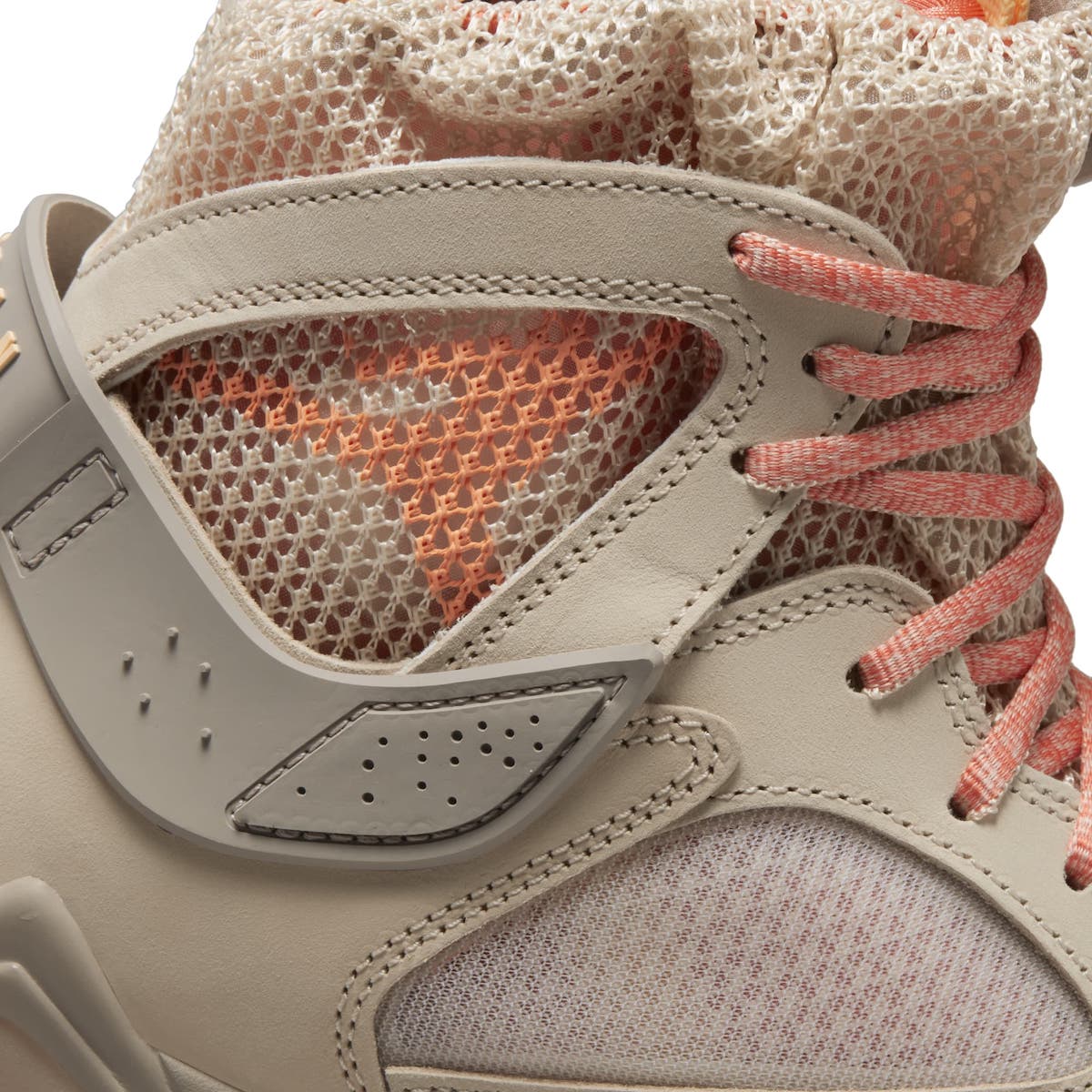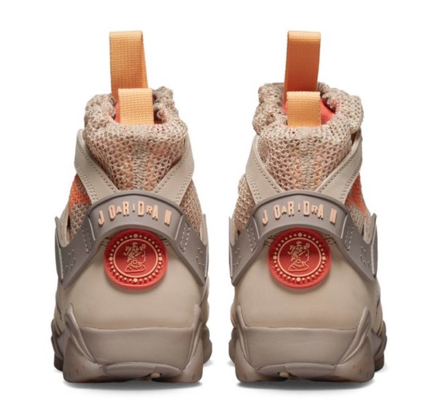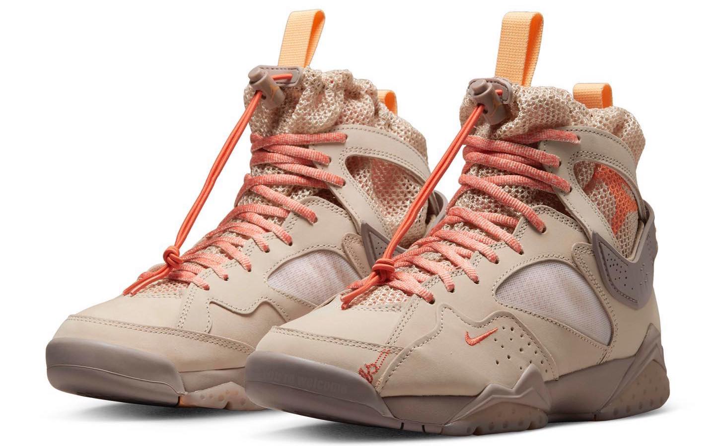 The BBS Air Jordan 7 is packed with outdoorsy ACG vibes. It comes dressed in a khaki and orange color scheme, reminiscent of the “Limestone” Air Mowabb, and features a heel clip borrowed from the Nike Air Huarache. The ankle collar area is the most interesting, constructed from a loose mesh that tightens with a drawstring and toggle mechanism. Additional features include BBS logo emblems on the heels, orange pull tabs on the tongue and heel collar, and a mini orange Swoosh on the lateral toe.