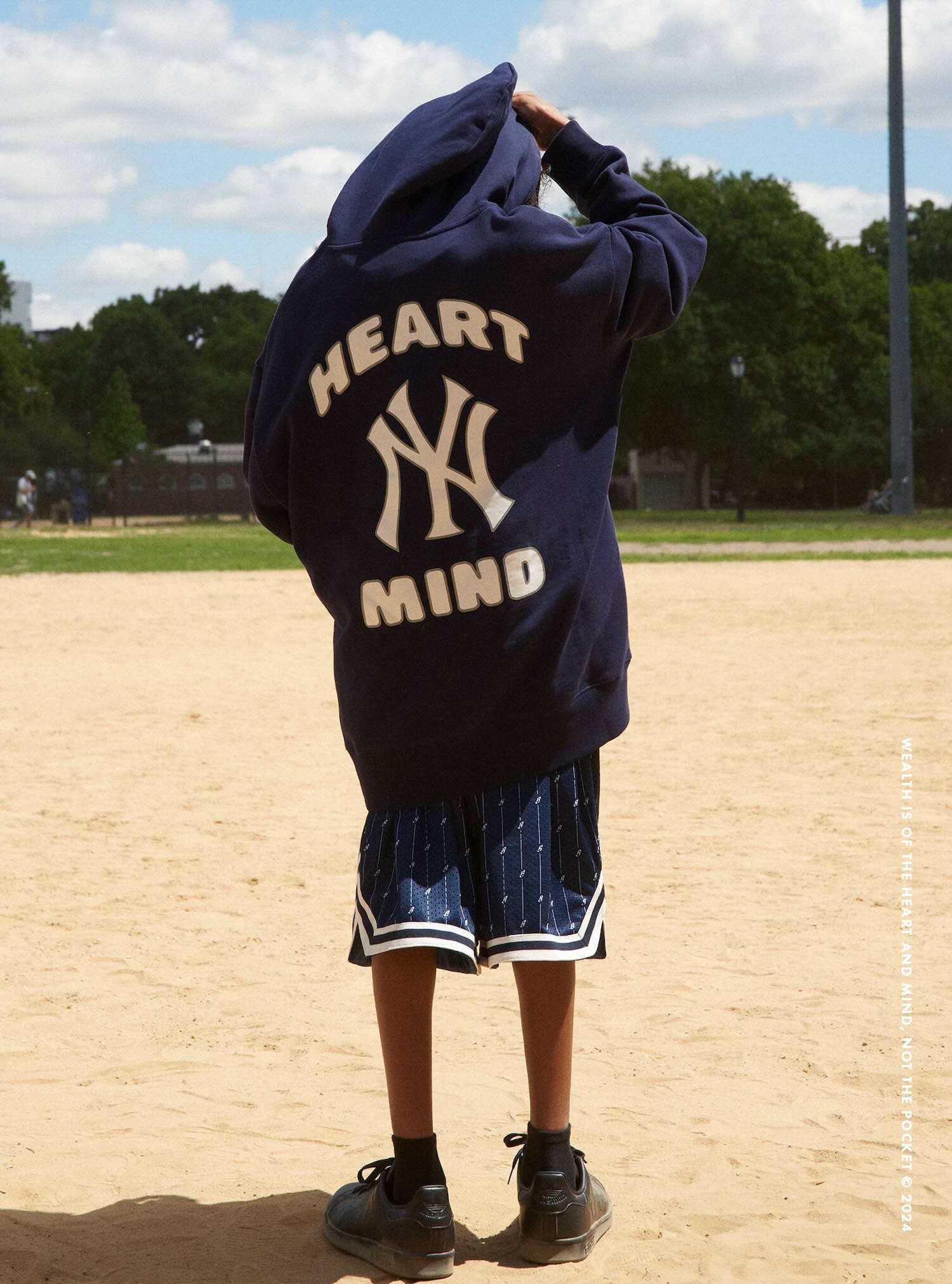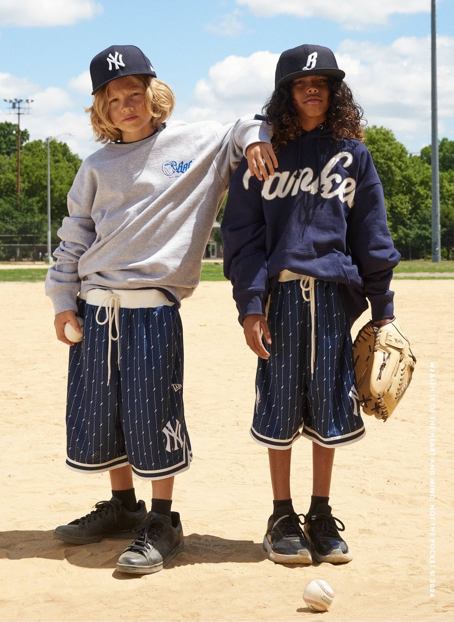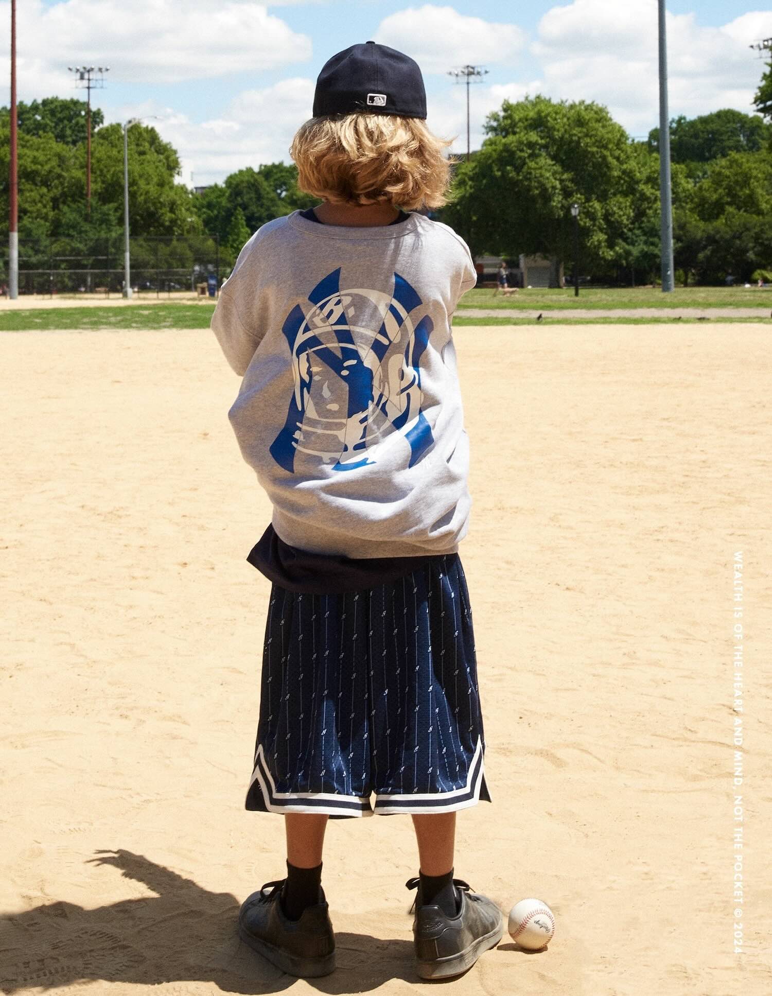 The Little League-style lookbook showcases a selection of casual and performance-oriented pieces dressed in navy and grey and adorned with BBC’s signature graphics. The mesh shorts are a standout piece, featuring the Billionaire Boys Club “Flying B” logo integrated into the classic baseball pinstripe pattern. The collection also features crewnecks, short and long-sleeve tees, hoodies, and new BBC x New Era fitted hats with the “Standing Astro” motif embroidered on the side.