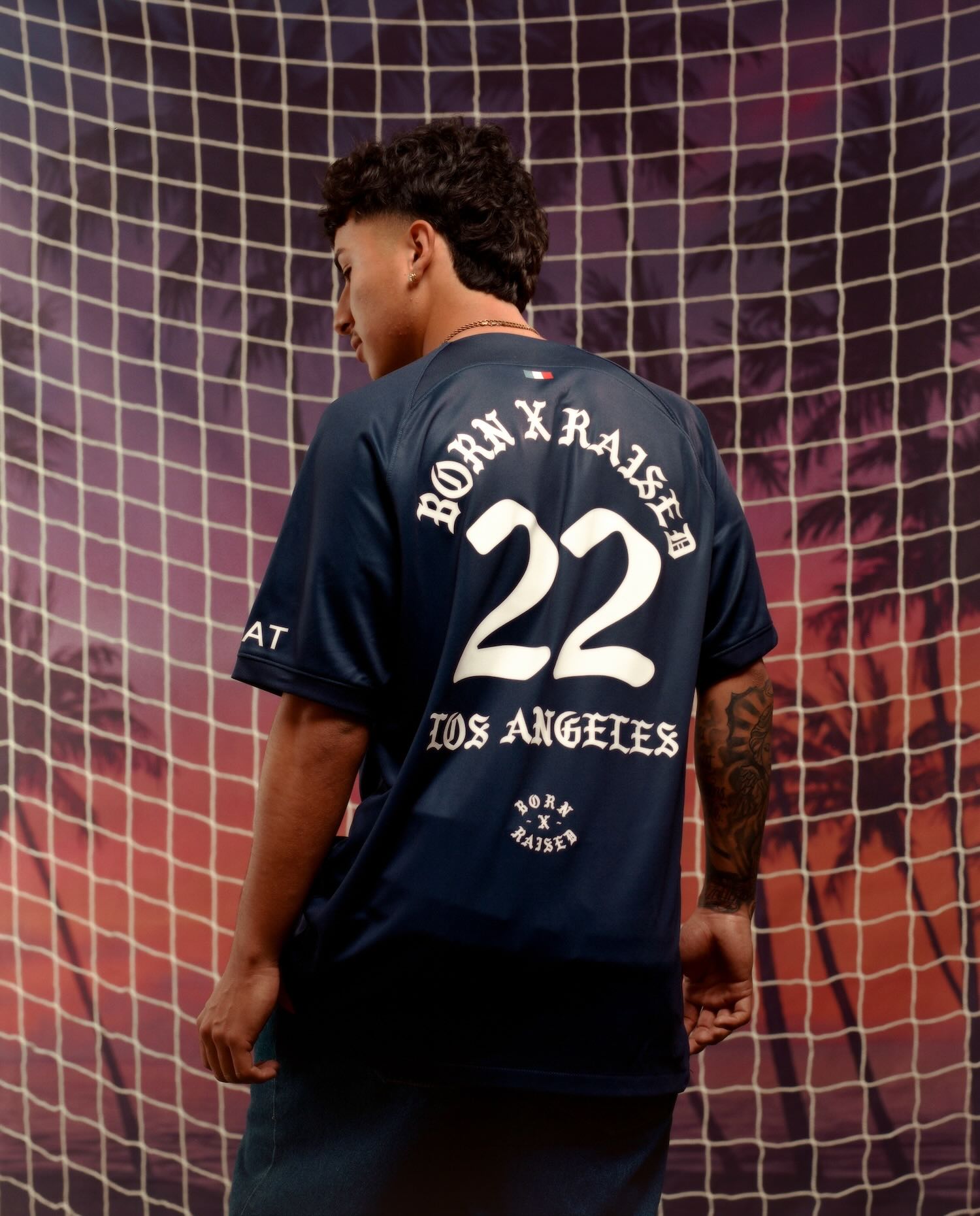The highlight of this collaboration is a collector’s jersey featuring BornXRaised’s iconic Old English typography on the back, which the Rouge et Bleu players recently wore on the pitch at the Stade Vélodrome last Sunday during the Le Classique showdown. This version of the jersey comes in home and away colorways and in five different player options: Mbappé 7, Kang 9, Barcola 29, Zaire Emery 33, and O. Dembele 10. There is also an exclusive “Los Angeles” version with number 22 on the back that will be available exclusively on the BXR website.