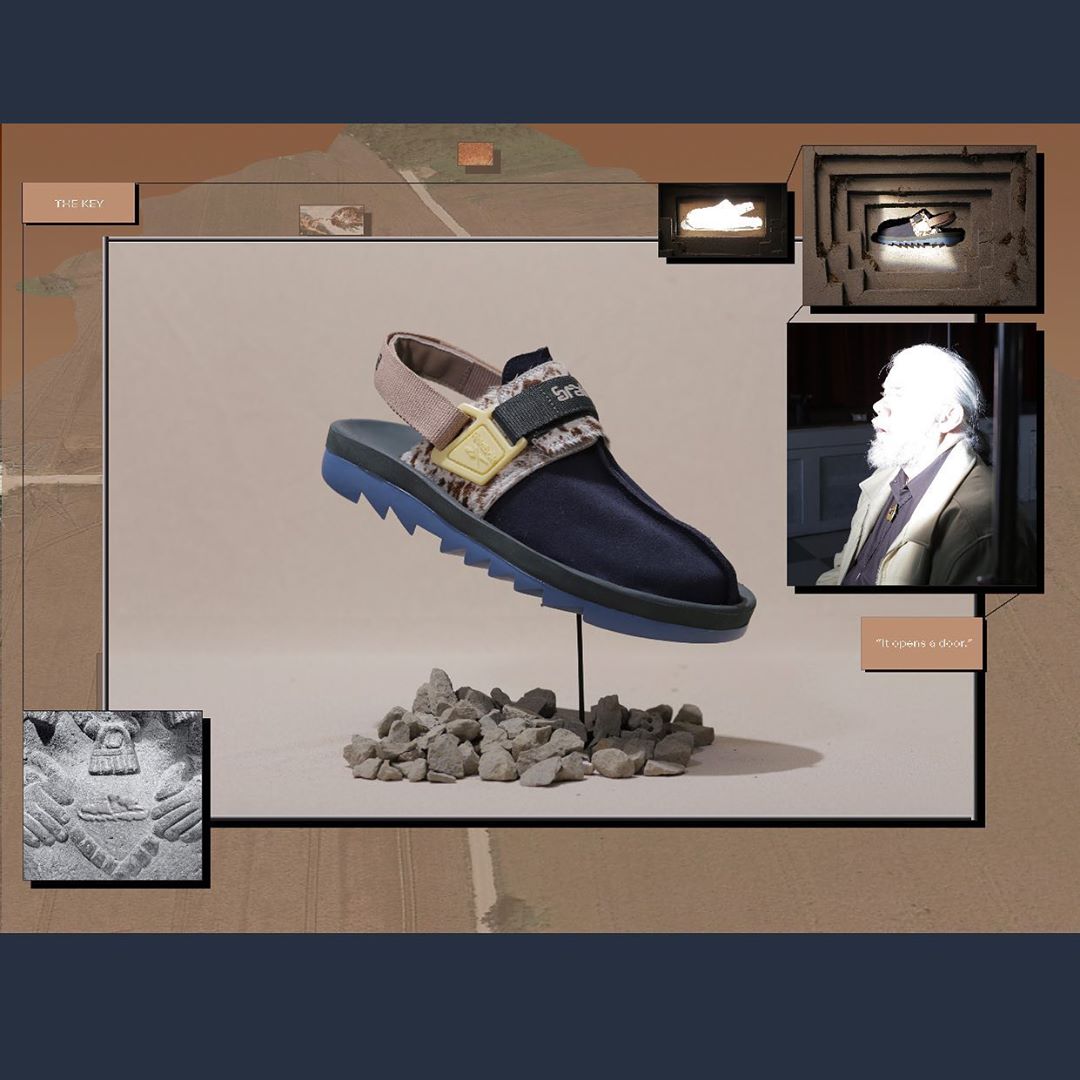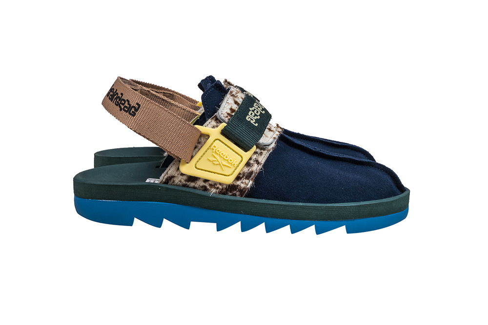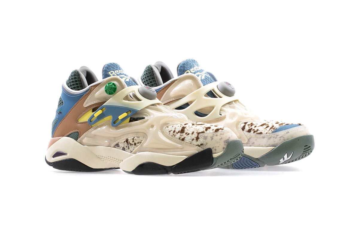 Comprised of a Pump Court CT and a Beatnik sandal, the collection was revealed via a tongue-in-cheek esoteric promo video. The models seem to take heavy inspiration from the American Southwest, and both appear to incorporate hair-textured cow patterned fabrics. The Pump Court CT, originally designed by Steven Smith of Yeezy fame, uses a textured blue and grey durable mesh on the tongue and heel, an off-white Pump bladder, a cow-print toebox, and Brain Dead x Reebok branding on the Pump button. The model is rounded out by clay brown and muted yellow accents.