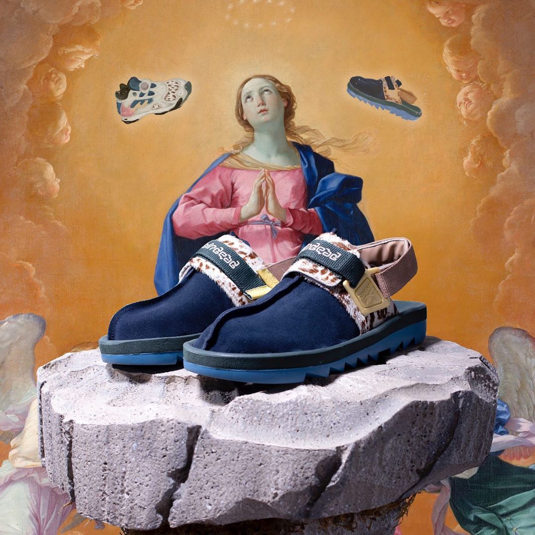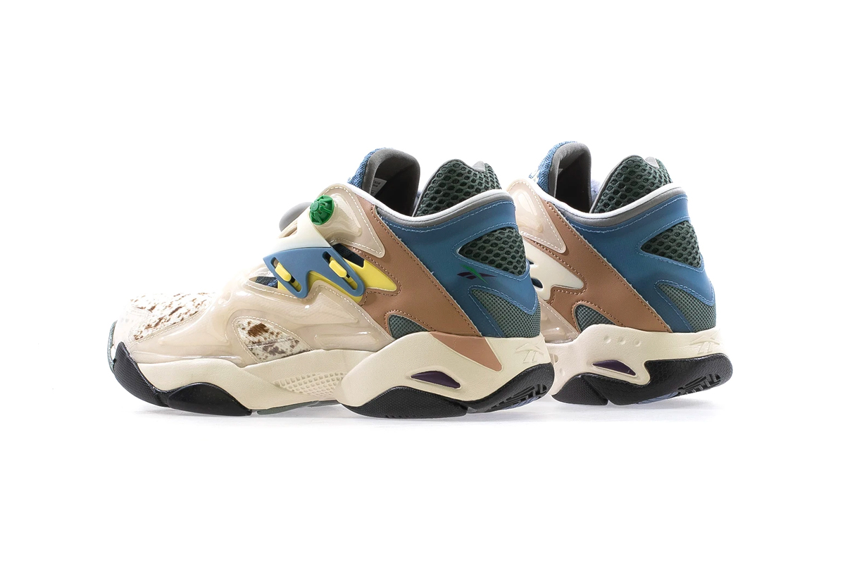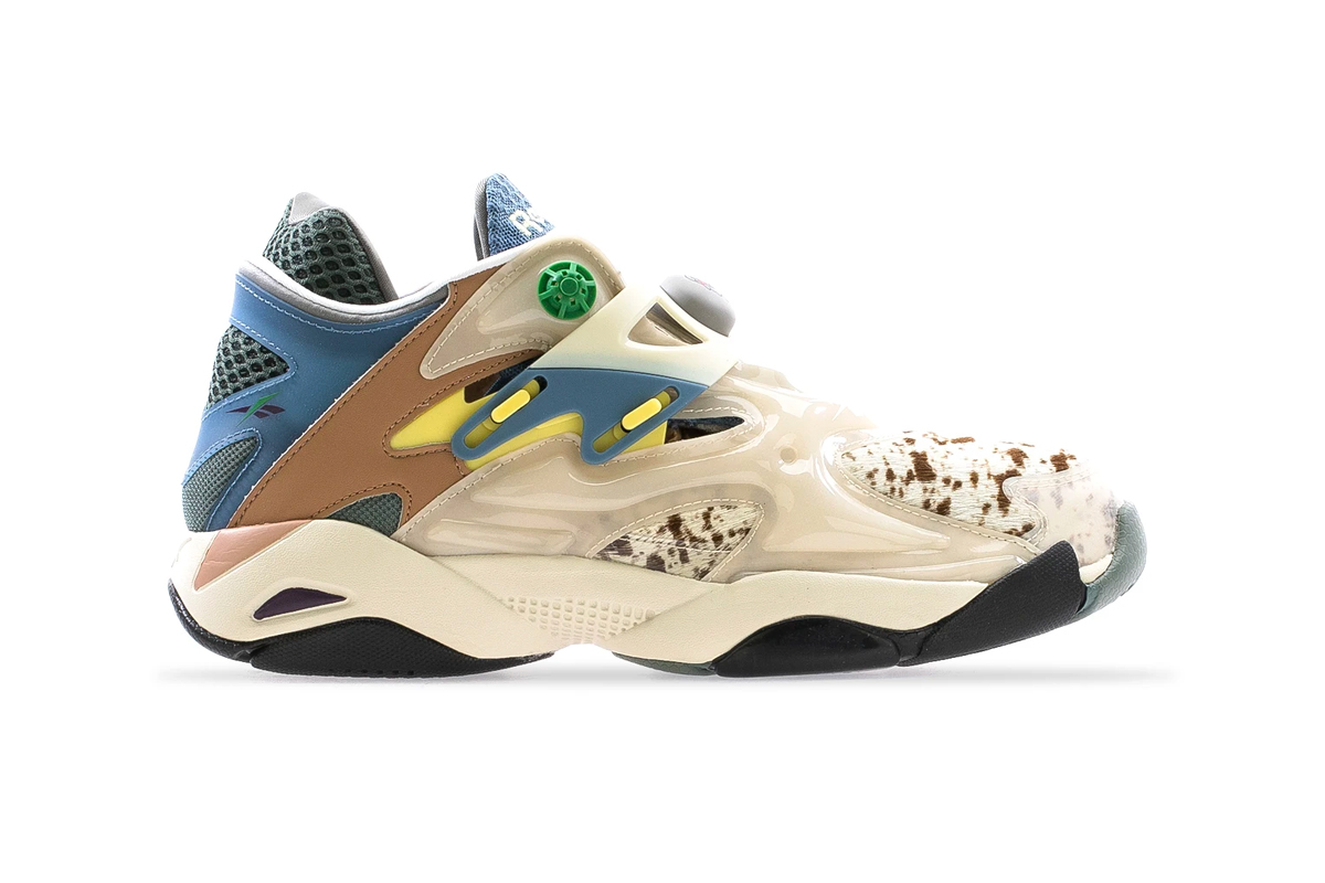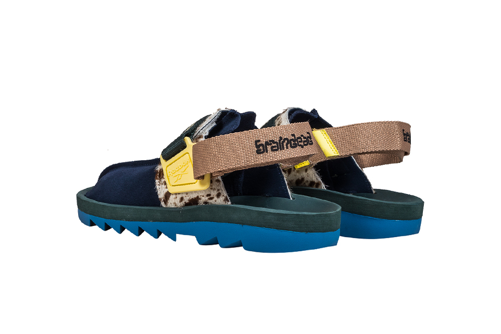 Comprised of a Pump Court CT and a Beatnik sandal, the collection was revealed via a tongue-in-cheek esoteric promo video. The models seem to take heavy inspiration from the American Southwest, and both appear to incorporate hair-textured cow patterned fabrics. The Pump Court CT, originally designed by Steven Smith of Yeezy fame, uses a textured blue and grey durable mesh on the tongue and heel, an off-white Pump bladder, a cow-print toebox, and Brain Dead x Reebok branding on the Pump button. The model is rounded out by clay brown and muted yellow accents.