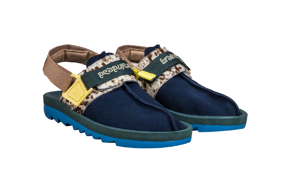 The Beatnik, a once-extinct mule-style sandal from Reebok that was recently re-released to hordes of eager fans, uses a navy blue upper atop a similarly colored high-tread outsole. The model’s strap system uses cow print material and a navy strap featuring embroidered Brain Dead branding, and the model is completed by a clay-colored heel strap.