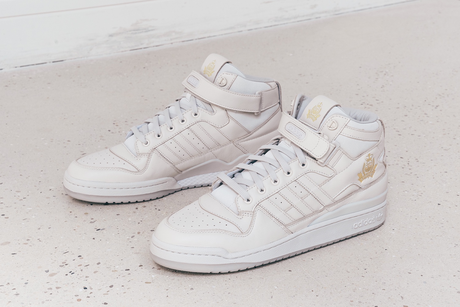 The LEADERS 1354 x adidas Forum features premium leather construction and comes in a creamy Clear Brown color scheme. The adidas Forum crest is embossed in gold on the tongue and quarter panel, while a LDRS 1354 logo is embossed in gold on the backside of the tongue.