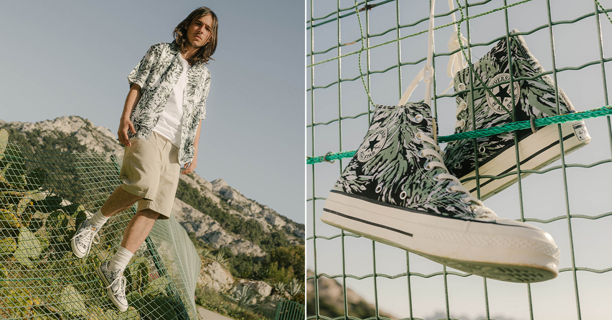 The Chuck 70 Hi displays a muted green and black color pairing that comes complete with light blue accents. The leafy print covers the entire upper for a satisfying brushed vibe. The Chuck 70 Ox features a similar pattern with a slightly different color palette. The low swaps the black for white and shows a cooler toned presentation. Each pair comes stamped with the iconic Carhartt tag on the tongue while the high version sports the familiar Converse logo. Eggshell midsoles and black foxing complete the construction.