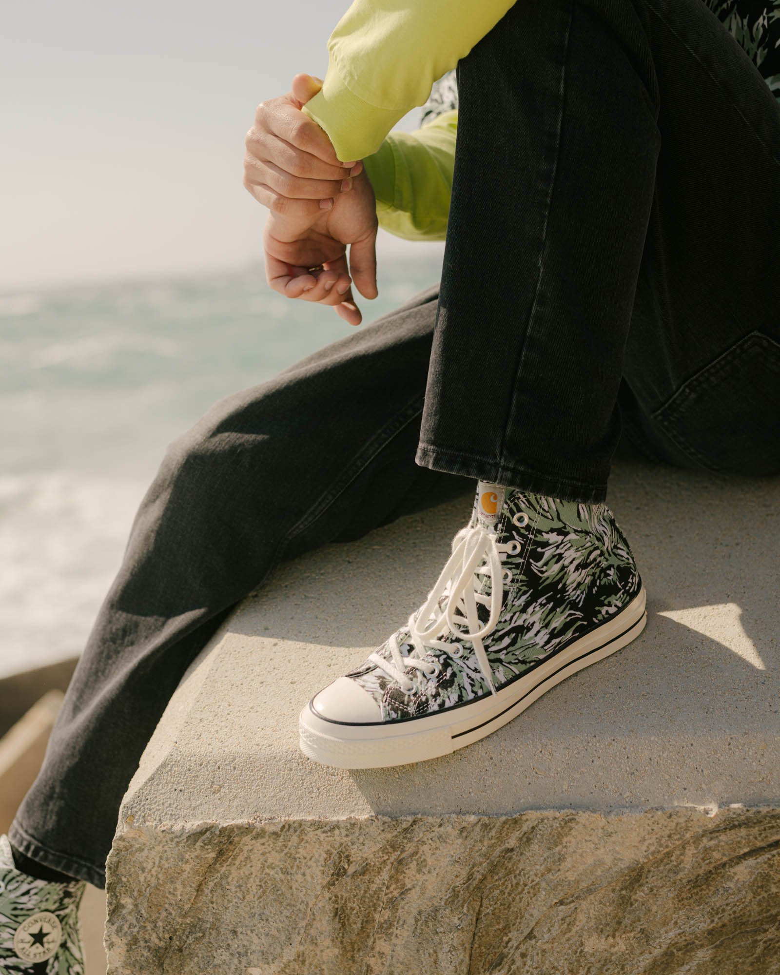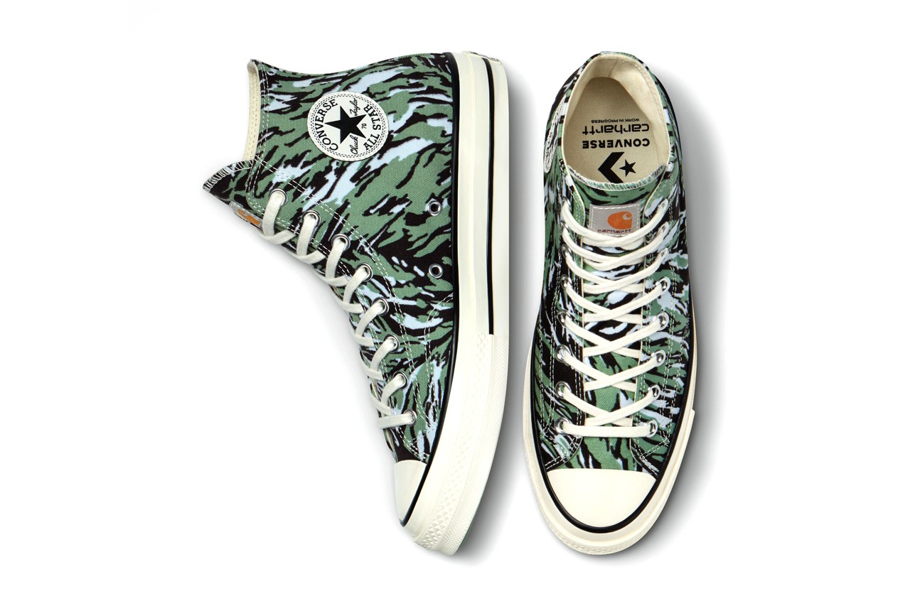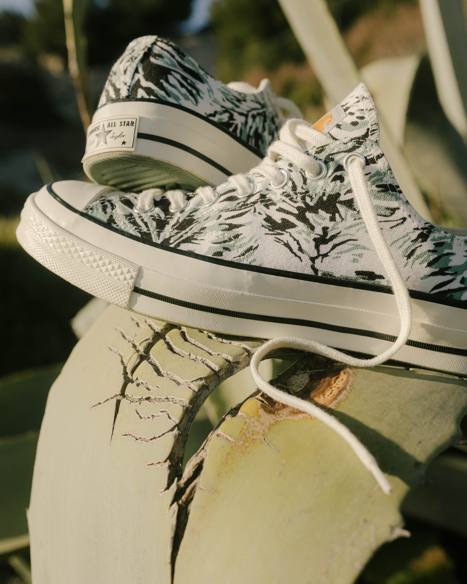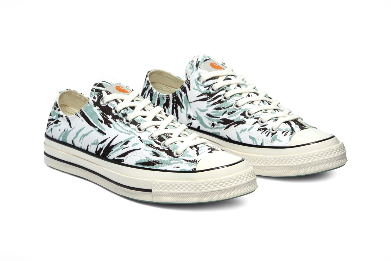 The Chuck 70 Hi displays a muted green and black color pairing that comes complete with light blue accents. The leafy print covers the entire upper for a satisfying brushed vibe. The Chuck 70 Ox features a similar pattern with a slightly different color palette. The low swaps the black for white and shows a cooler toned presentation. Each pair comes stamped with the iconic Carhartt tag on the tongue while the high version sports the familiar Converse logo. Eggshell midsoles and black foxing complete the construction.