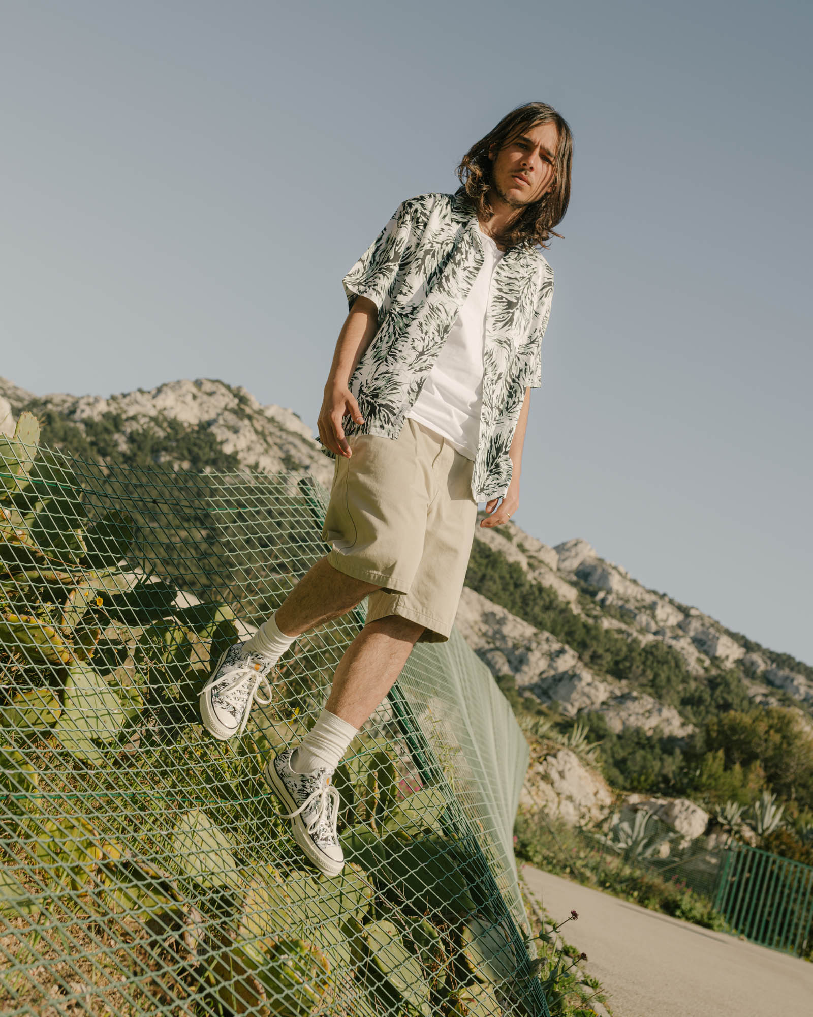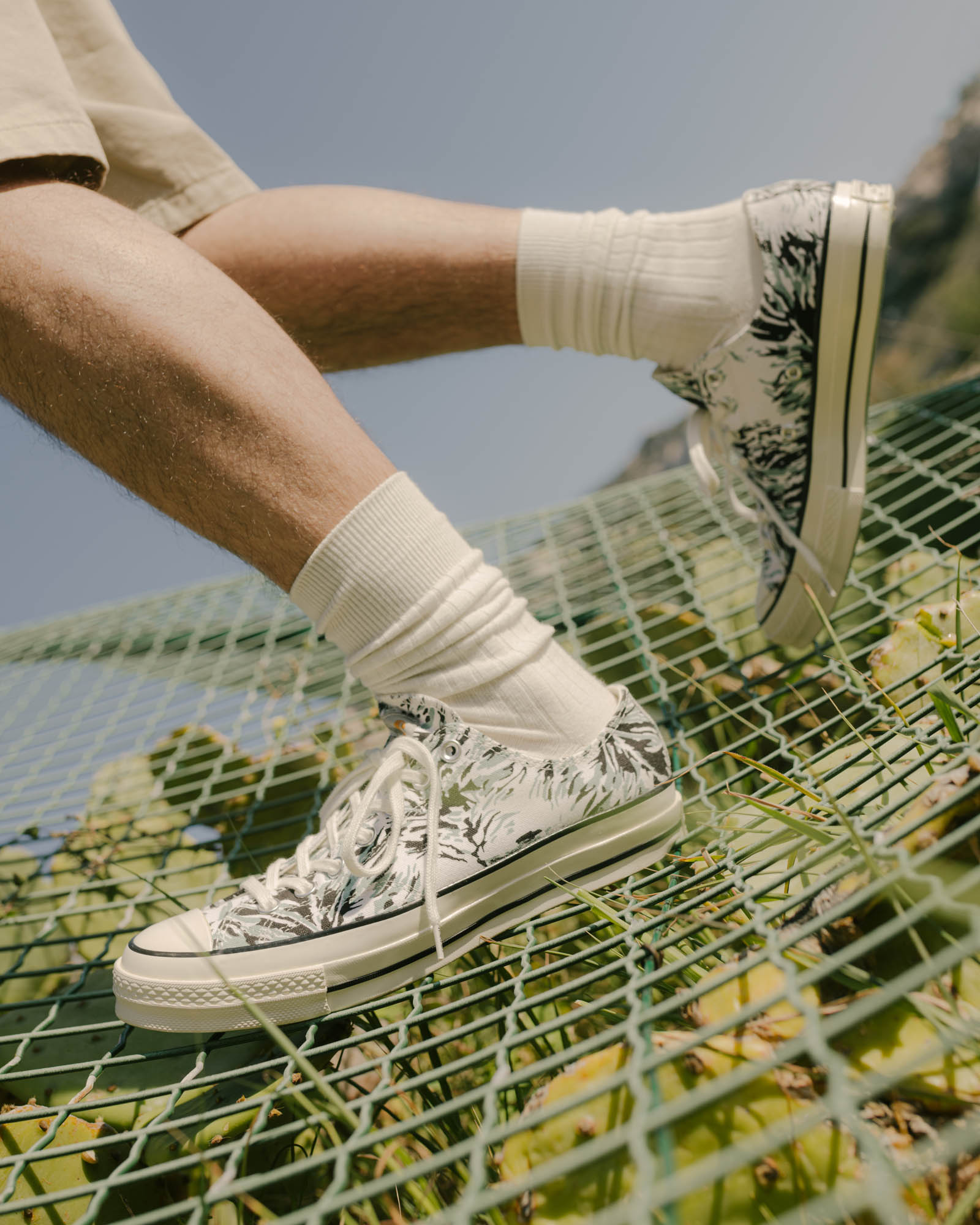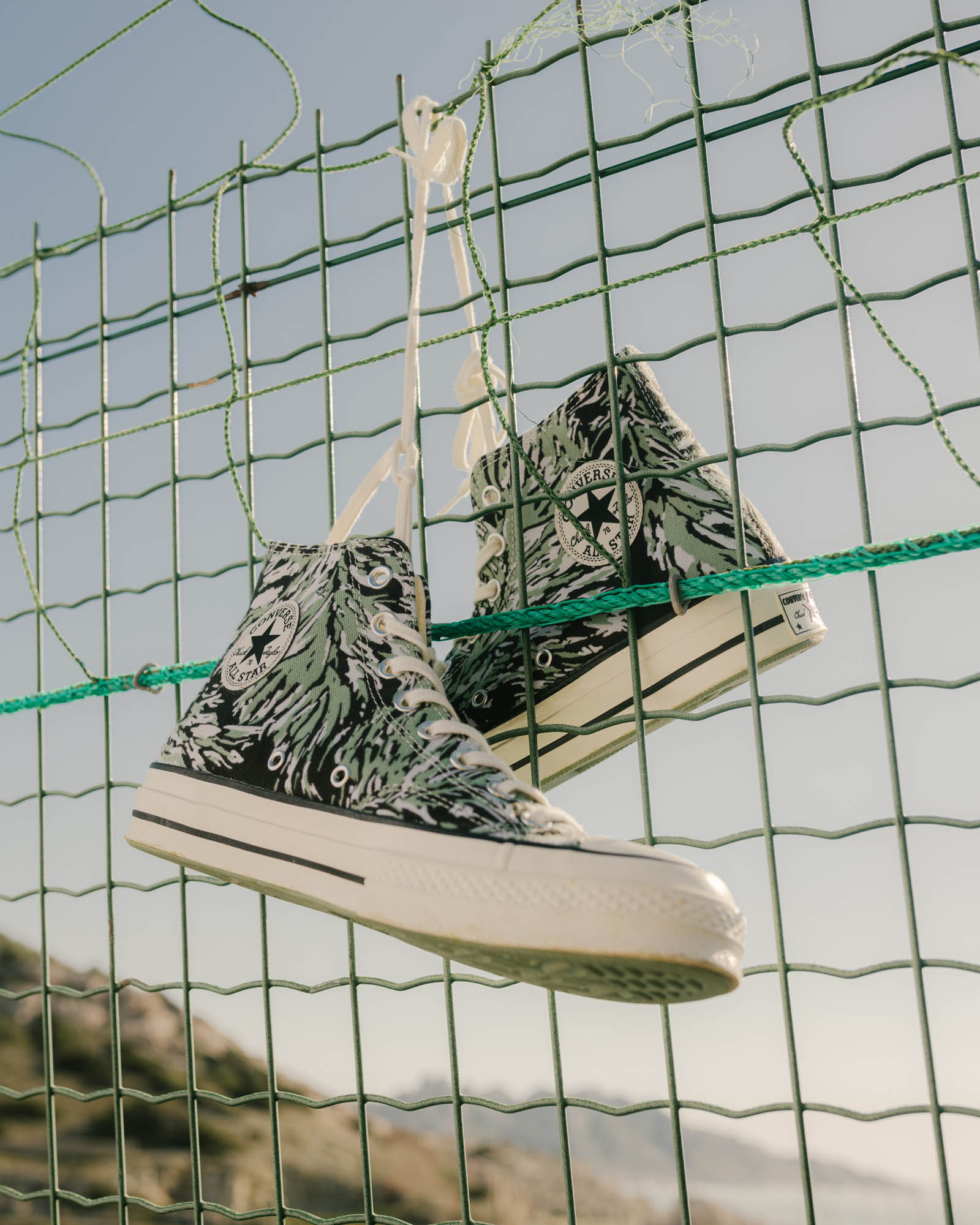 The Chuck 70 Hi displays a muted green and black color pairing that comes complete with light blue accents. The leafy print covers the entire upper for a satisfying brushed vibe. The Chuck 70 Ox features a similar pattern with a slightly different color palette. The low swaps the black for white and shows a cooler toned presentation. Each pair comes stamped with the iconic Carhartt tag on the tongue while the high version sports the familiar Converse logo. Eggshell midsoles and black foxing complete the construction.