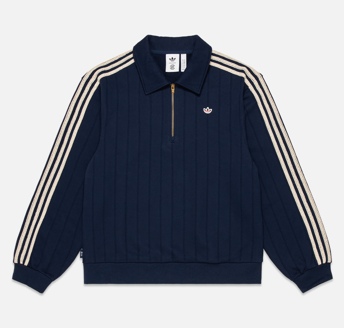 Premium knitwear includes the CLOT Sweater, which showcases mohair-inspired Trefoil branding that plays with softness and structure. Meanwhile, the corduroy Suit Jacket and Pant set merges classic tailoring with sport influences — the jacket adopts CLOT’s signature wrap-style closure, accented with subtle 3-Stripes detailing for an understated athletic touch. Foundational pieces such as the embroidered long-sleeve tee, French terry quarter-zip, and sweatpant round out the offering, featuring “Universitaire adidas CLOT” graphics and dual insignias inspired by university crest traditions.