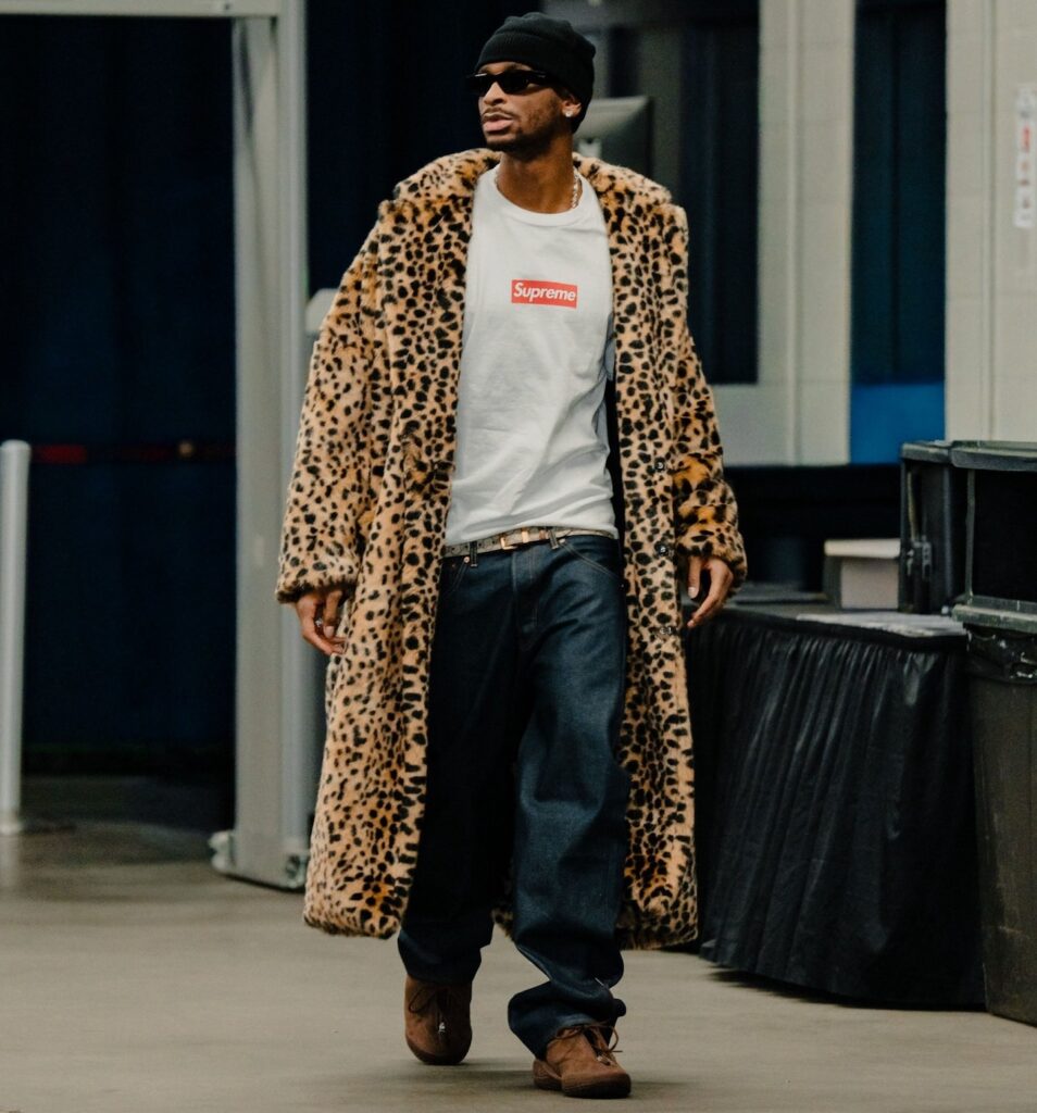 The Oklahoma City Thunder guard debuted the all-over brown colorway over the weekend, featuring premium grain nubuck construction, debossed logos on the tongues, and gold foil branding on the footbeds. Shai’s tunnel fit also included a white Supreme tee, baggy jeans, and a long leopard-print statement fur coat—likely a nod to the famous Kate Moss Supreme box logo tee.